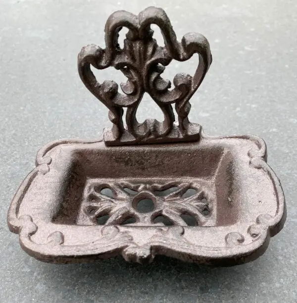 Een roestbruin gietijzeren zeepbakje die je kunt neerzetten.