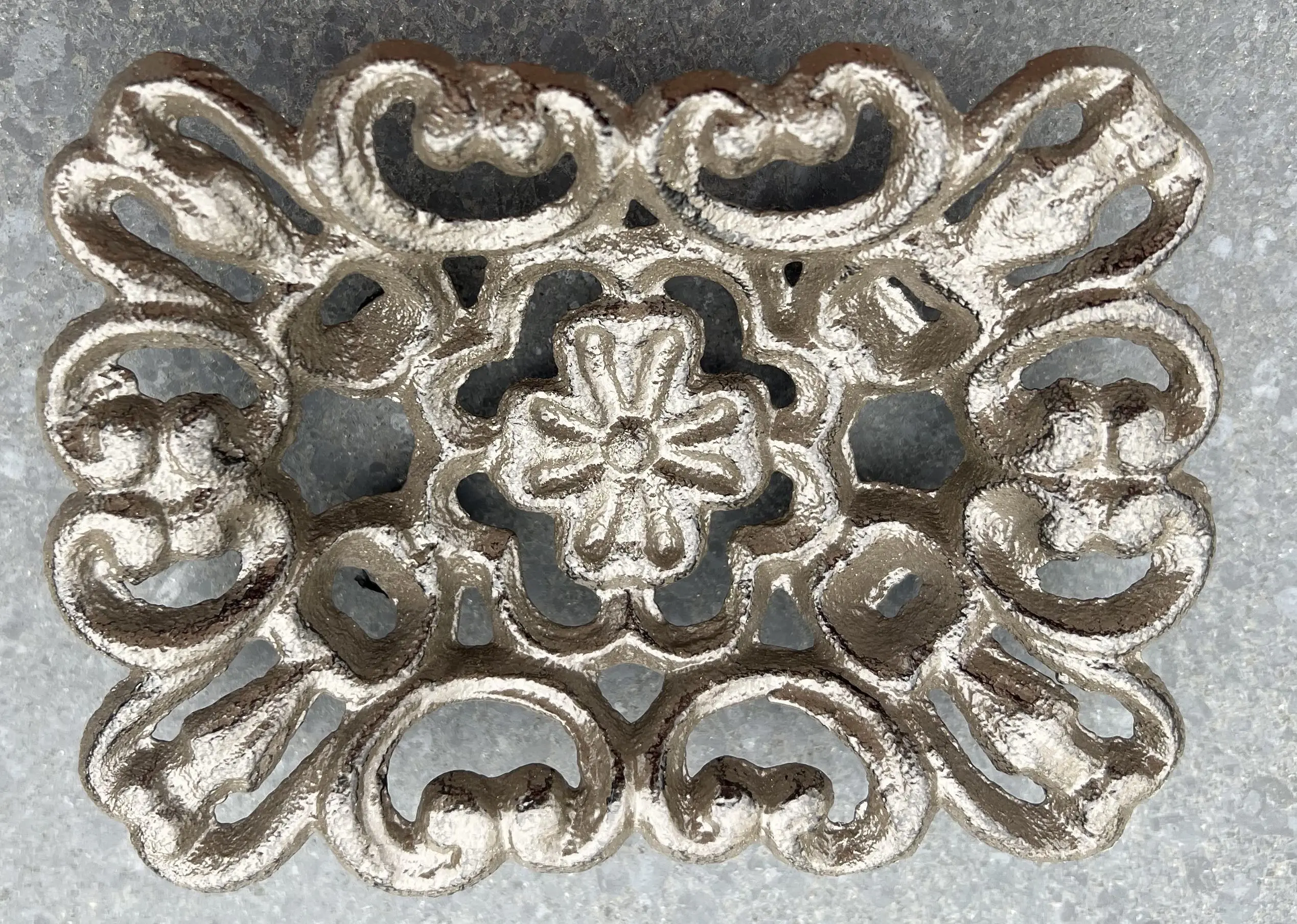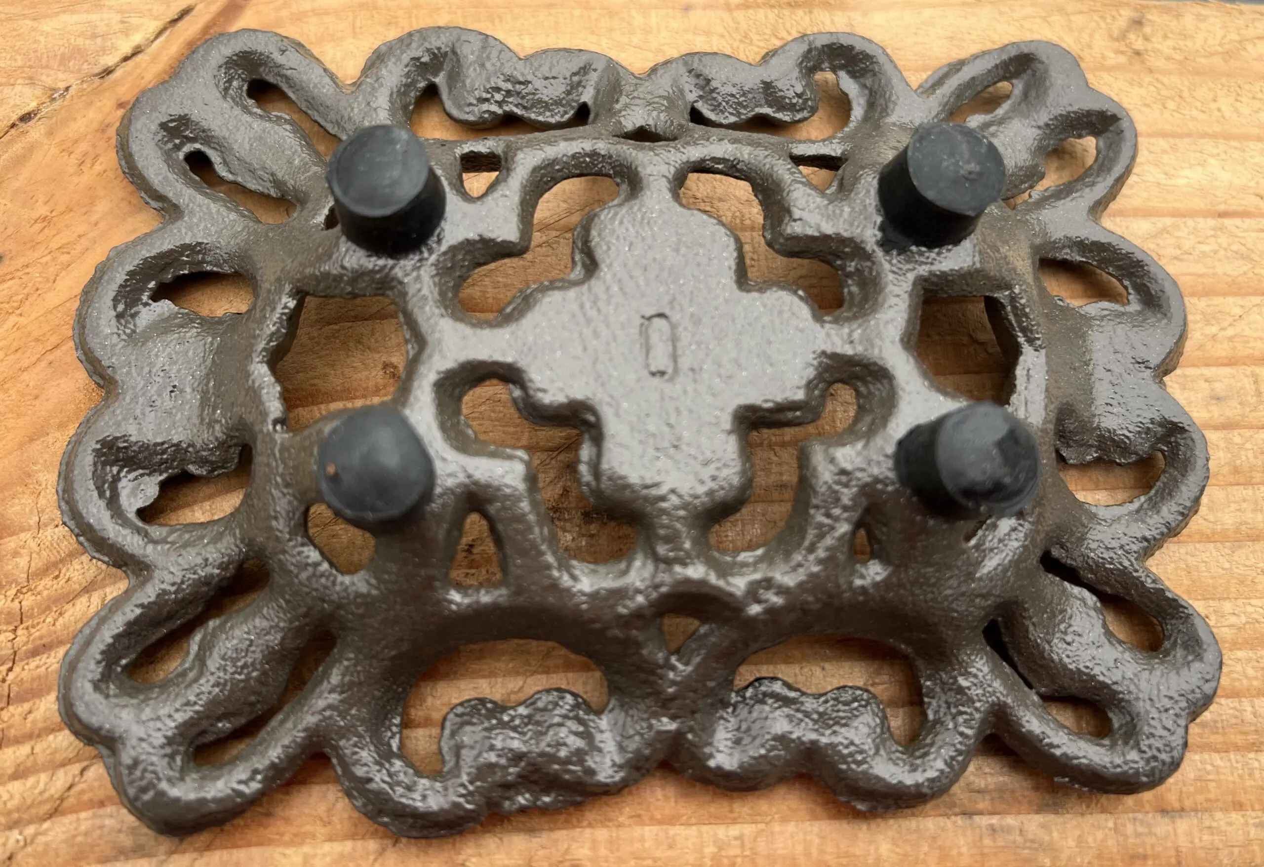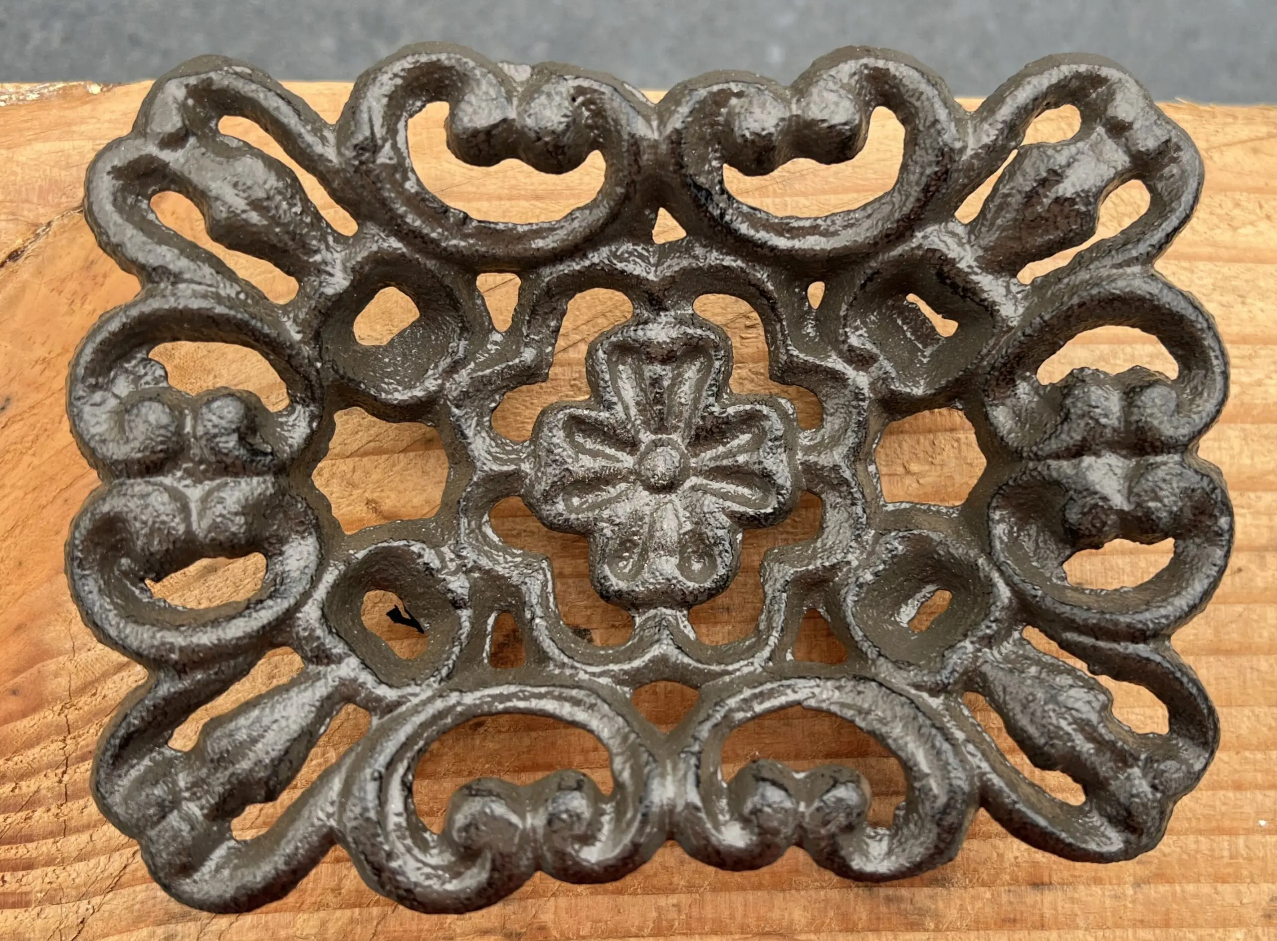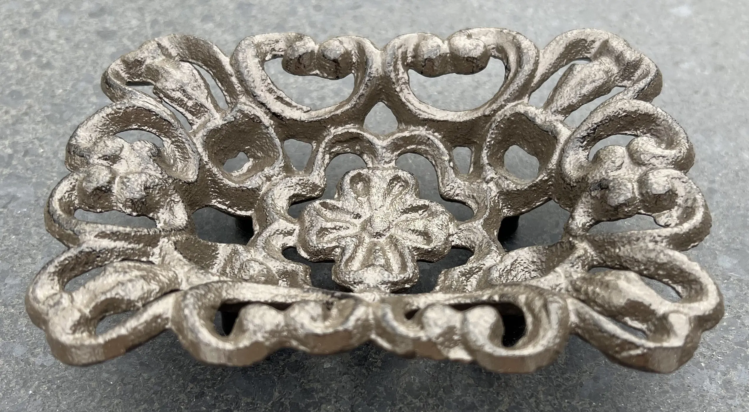 Een roestbruin gietijzeren zeepbakje die je kunt neerzetten.