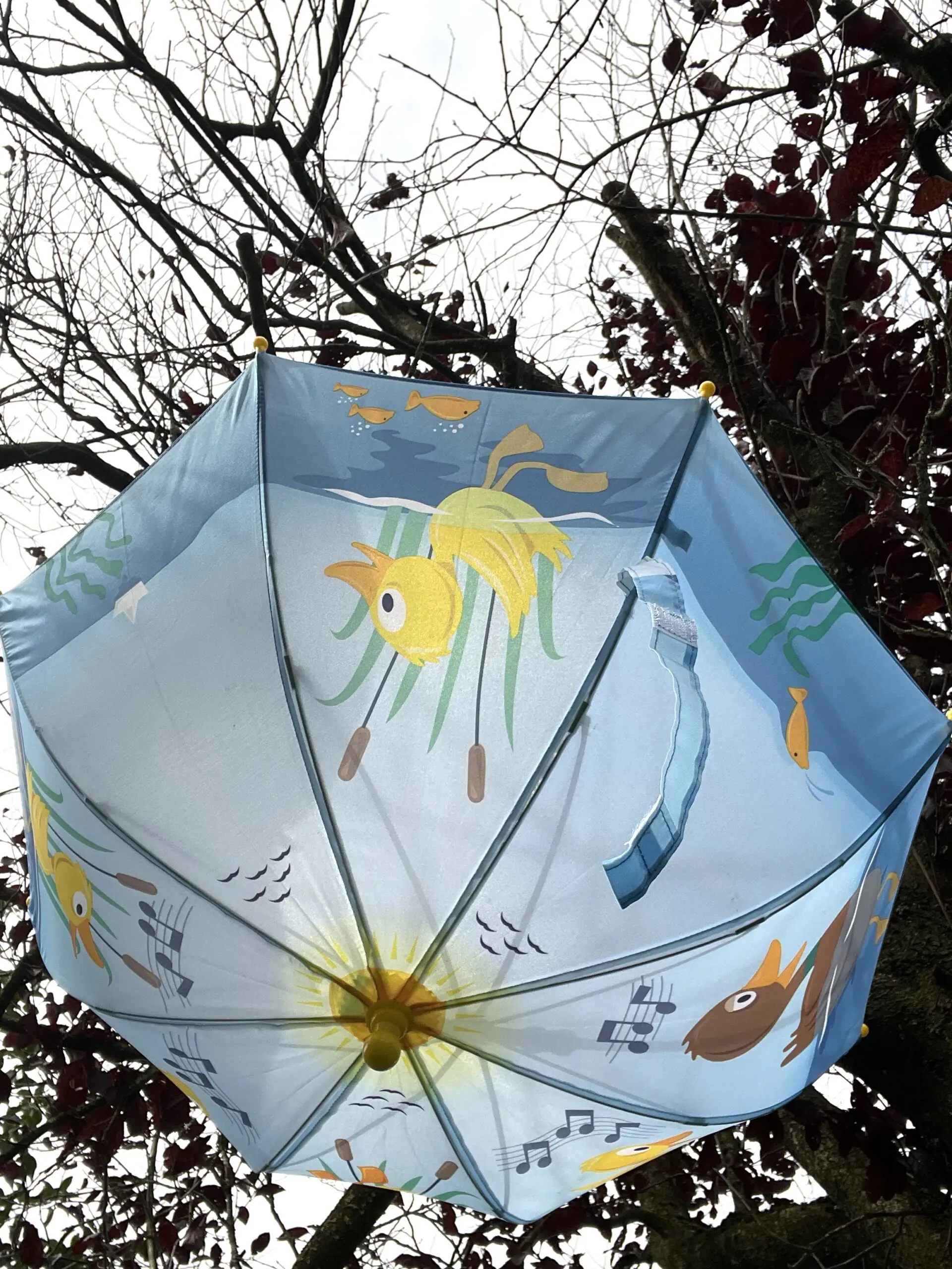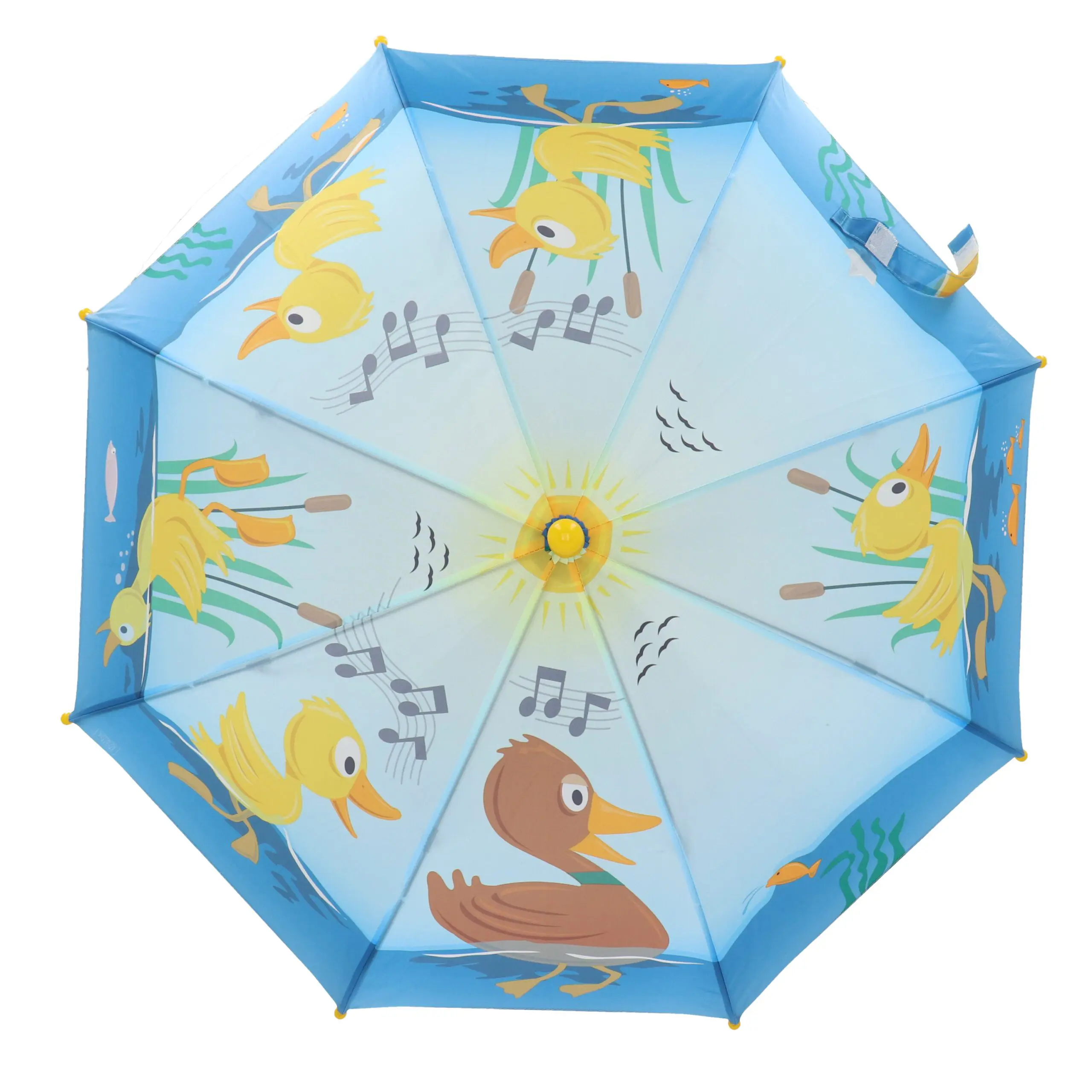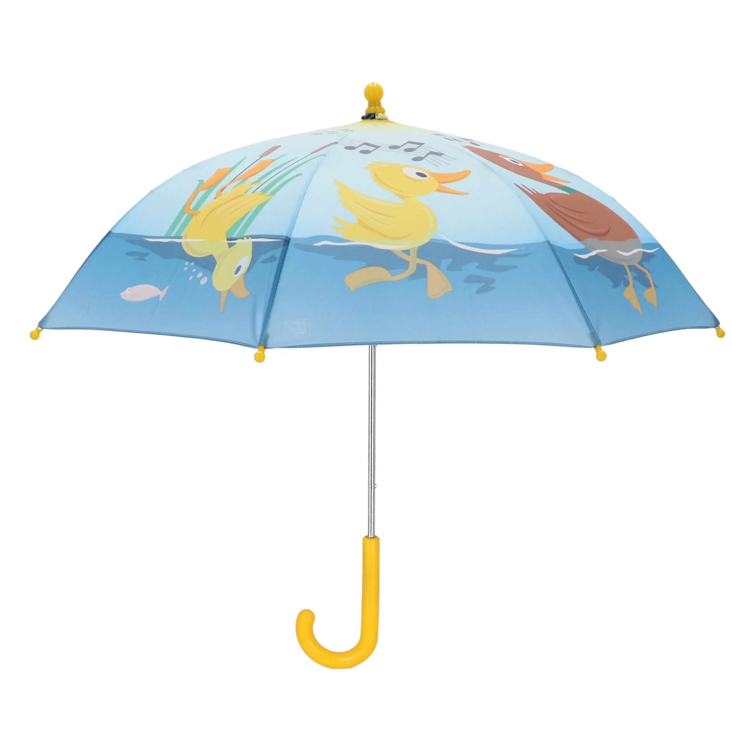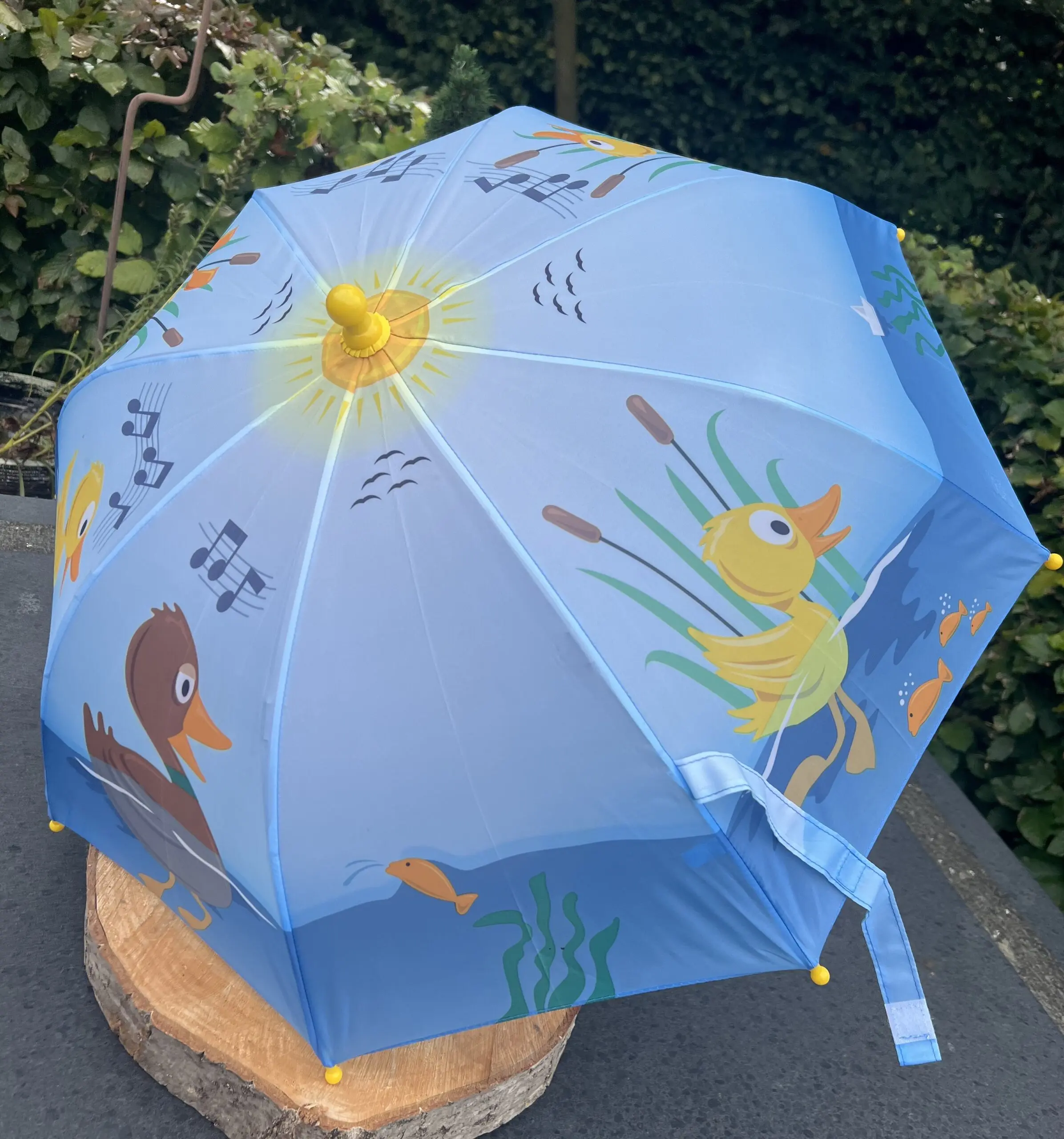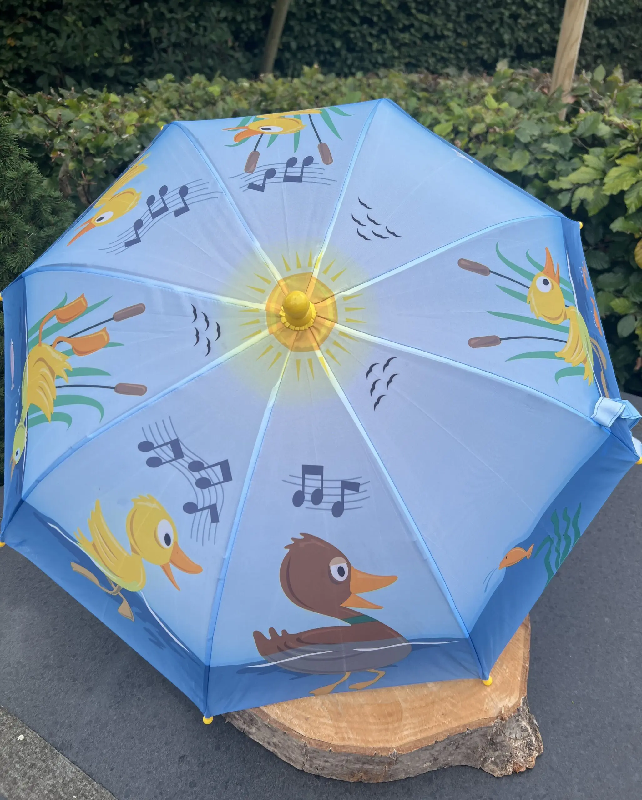 Leuke kinderparaplu met panorama eendjes, geel en blauw.