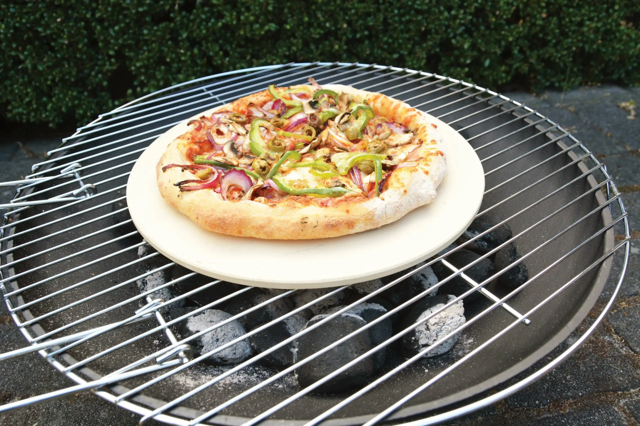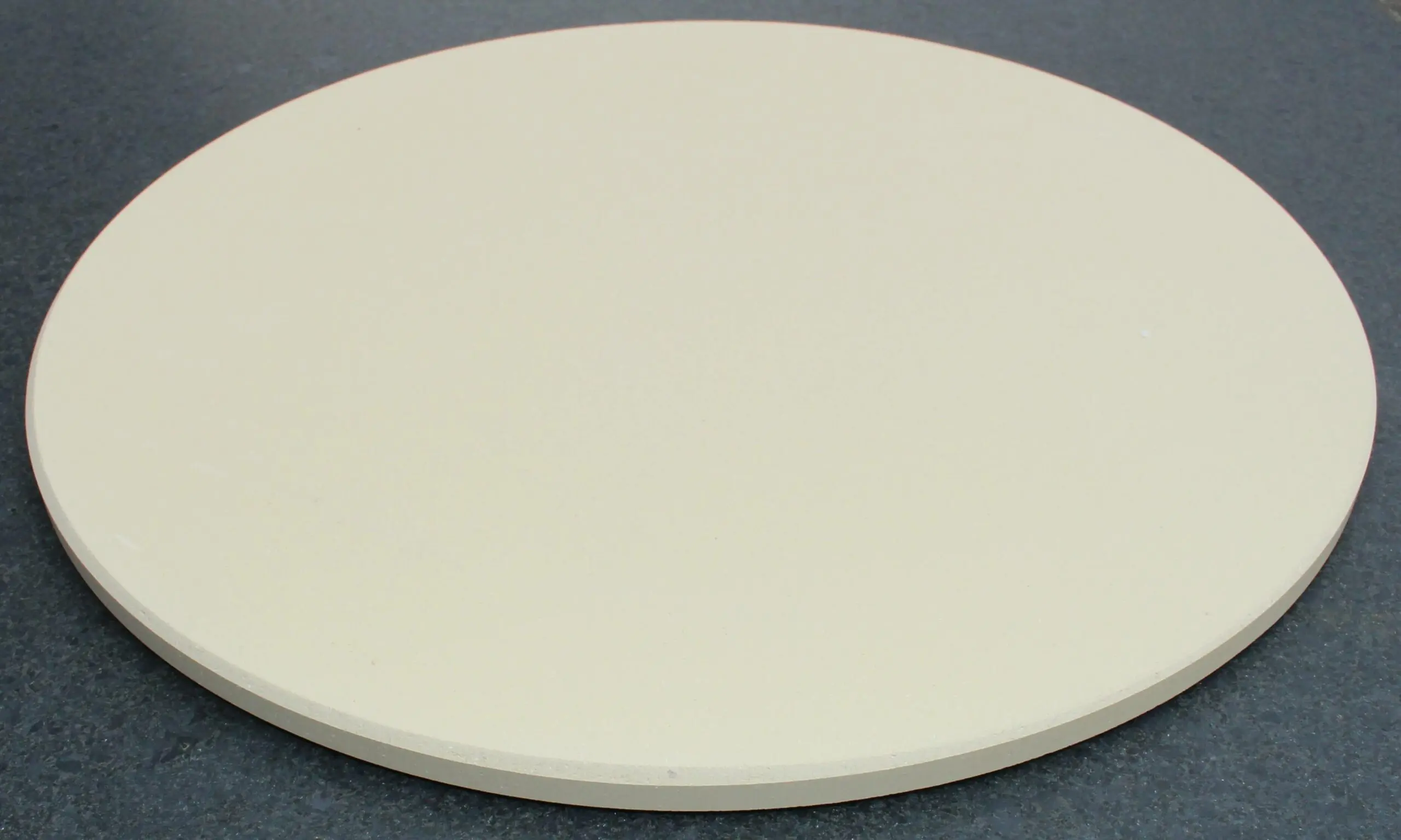 Een ronde pizzasteen van het materiaal Cordieriet.