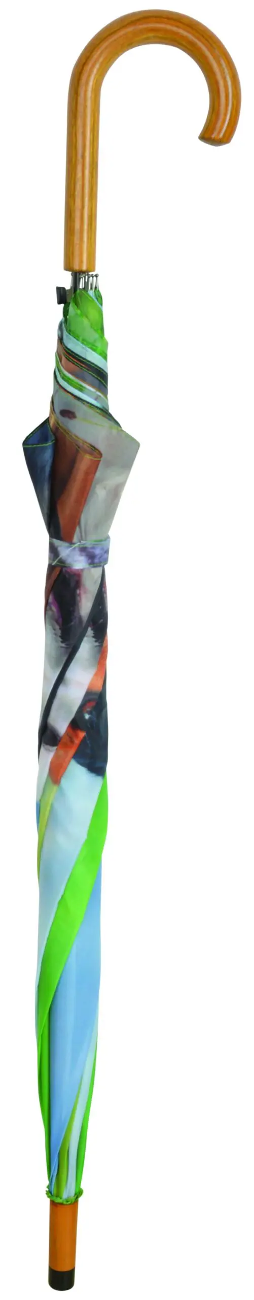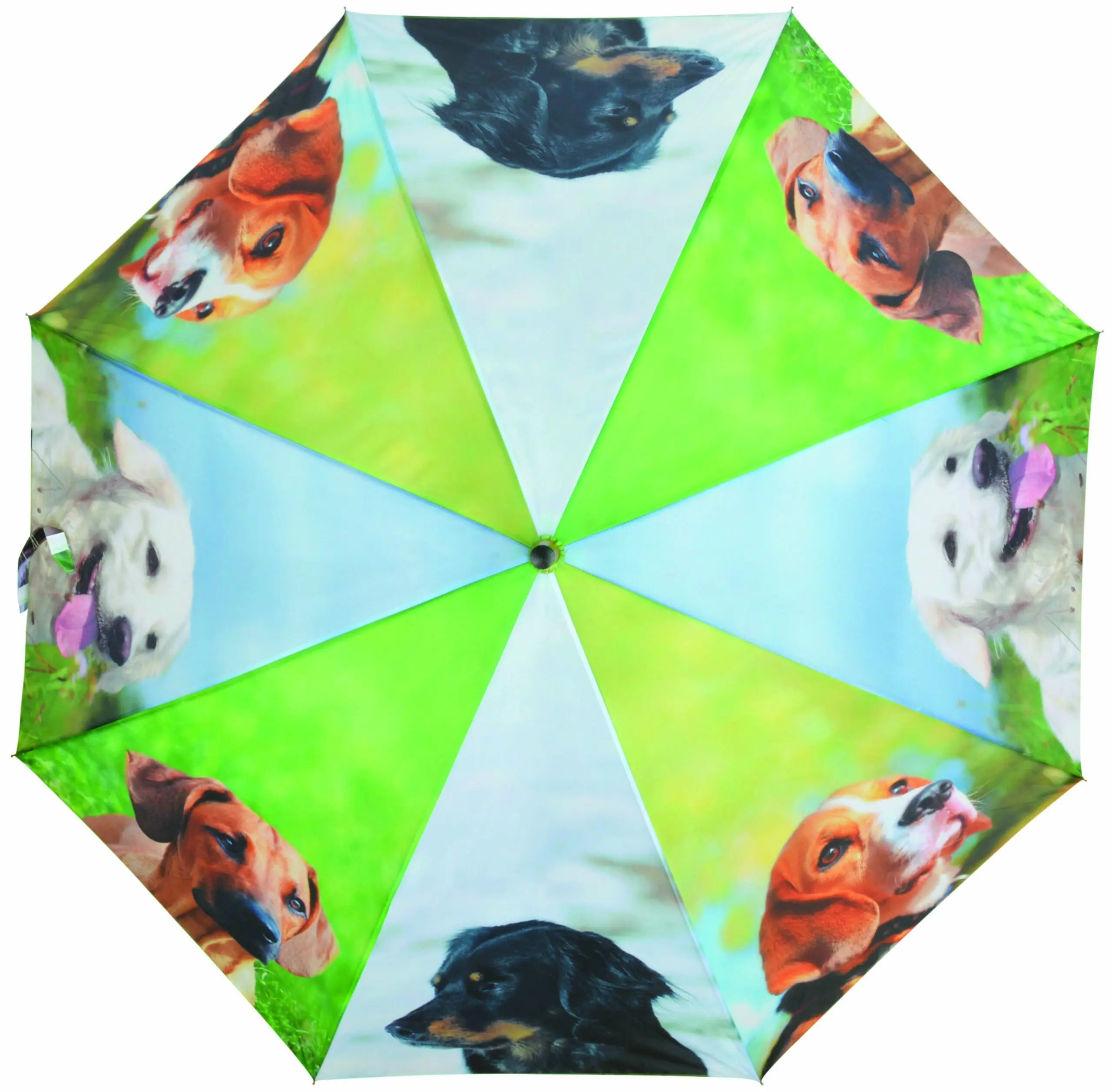 Een mooie kleurige paraplu met een print van verschillende rassen hond.