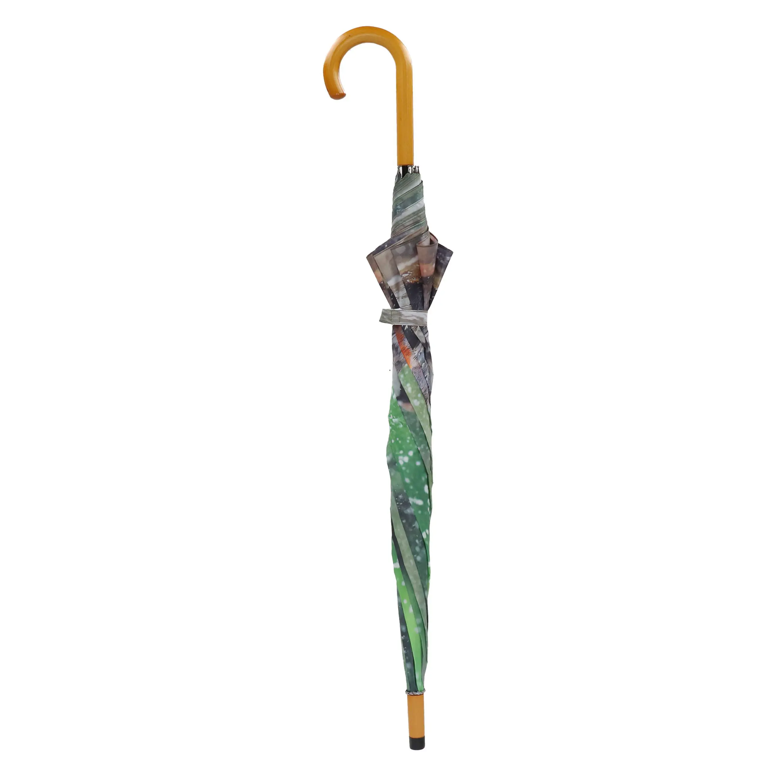 Het is een nylon paraplu met een houten handvat.