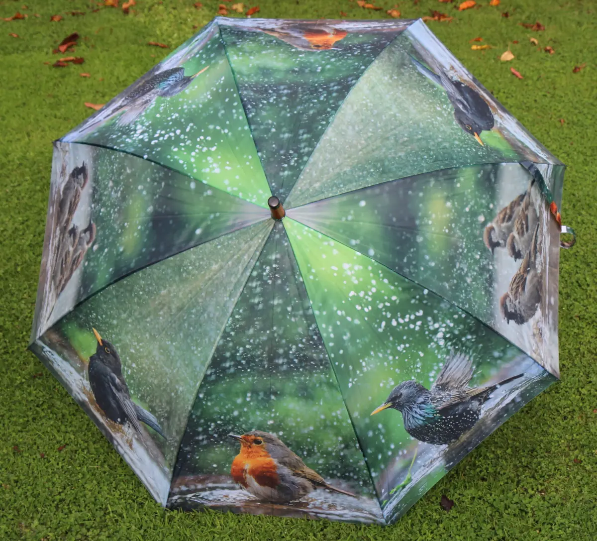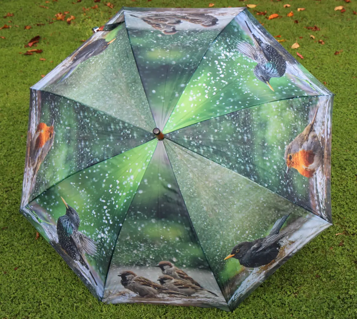 Een mooie kleurige paraplu met een print van tuinvogels.