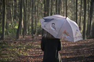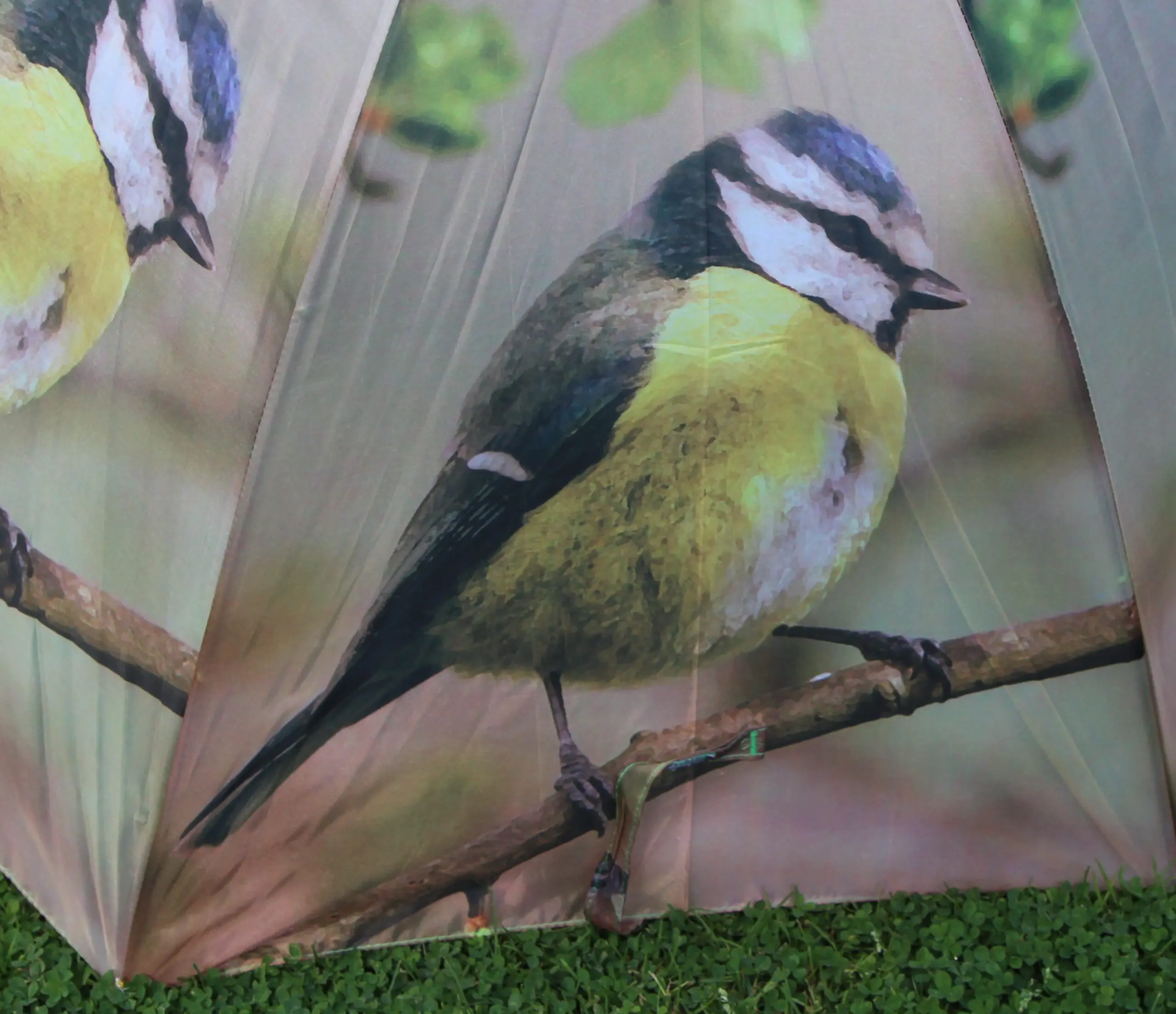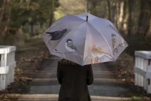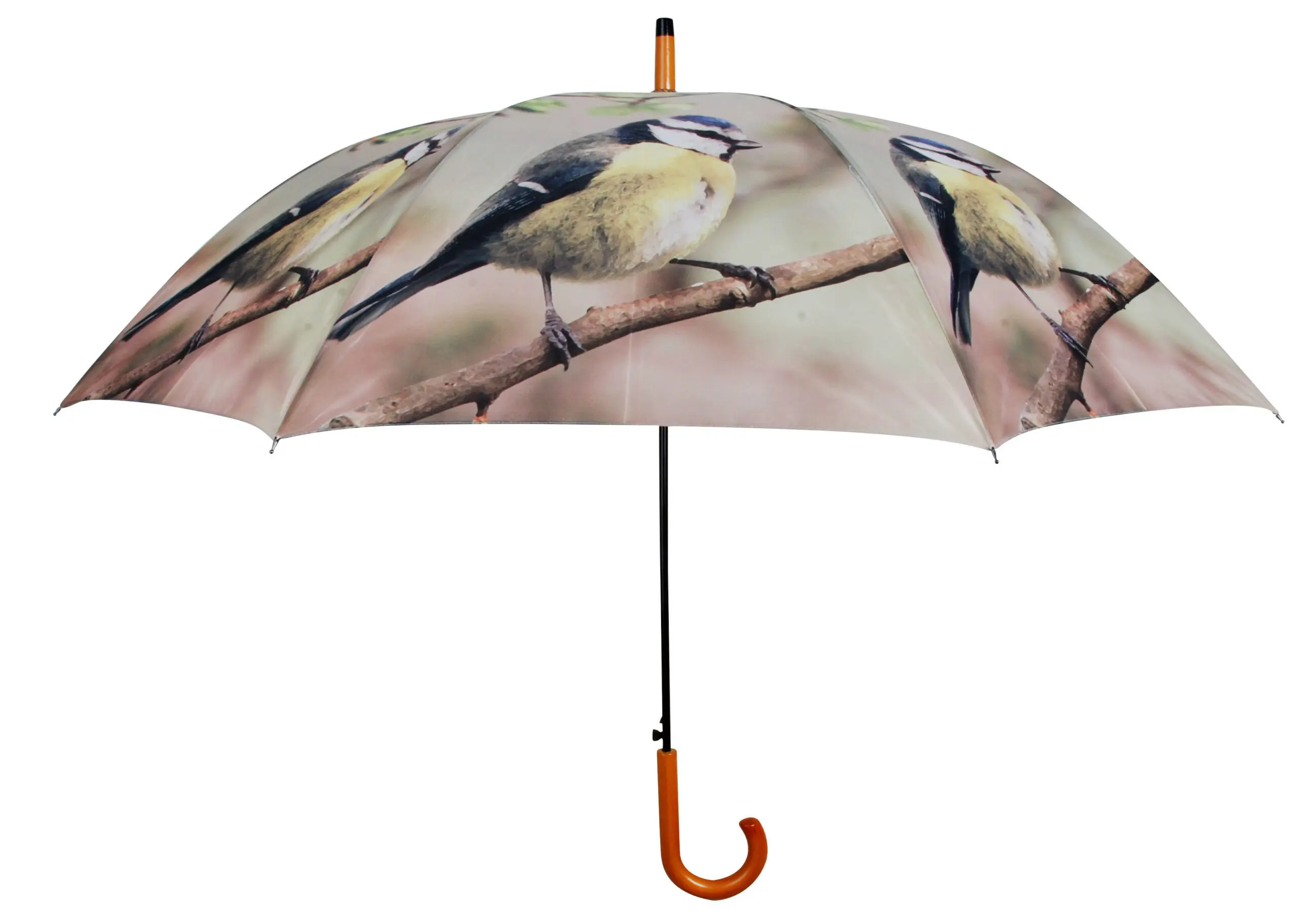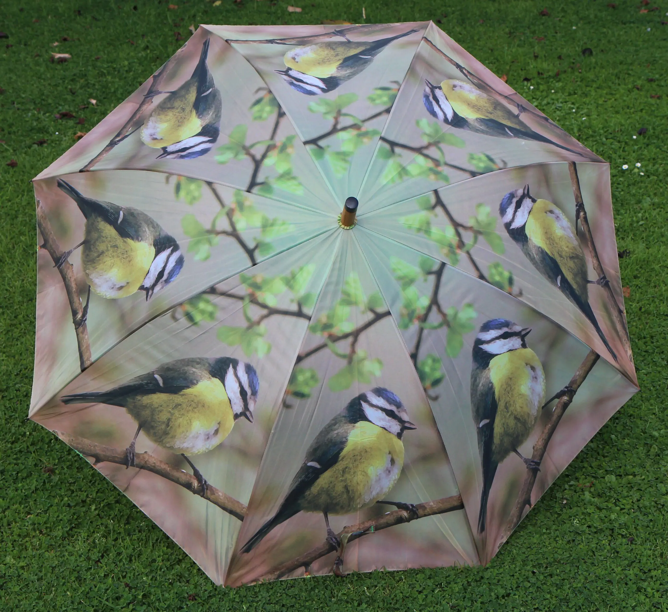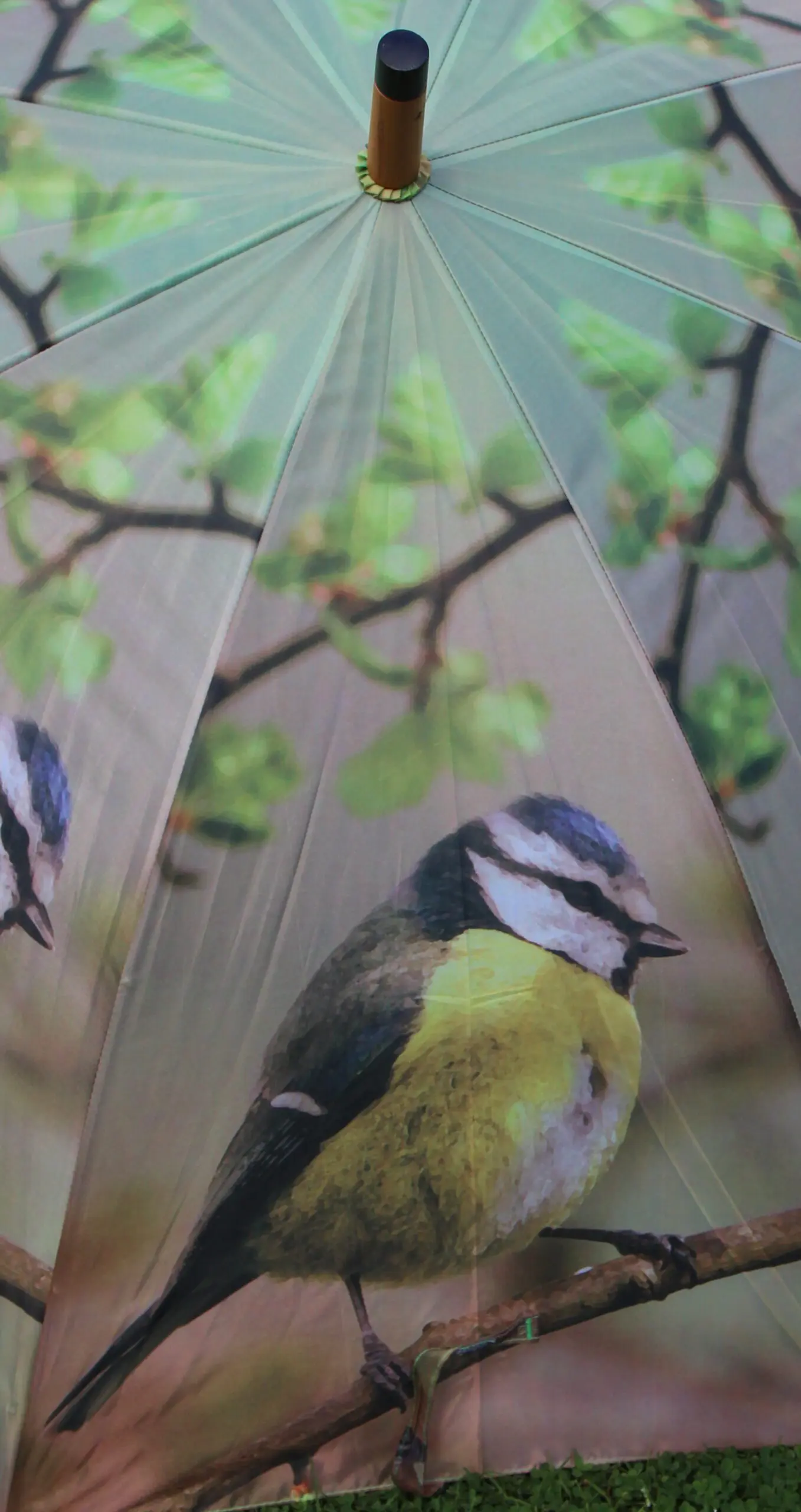Een mooie kleurige paraplu met een print van Pimpelmees.
