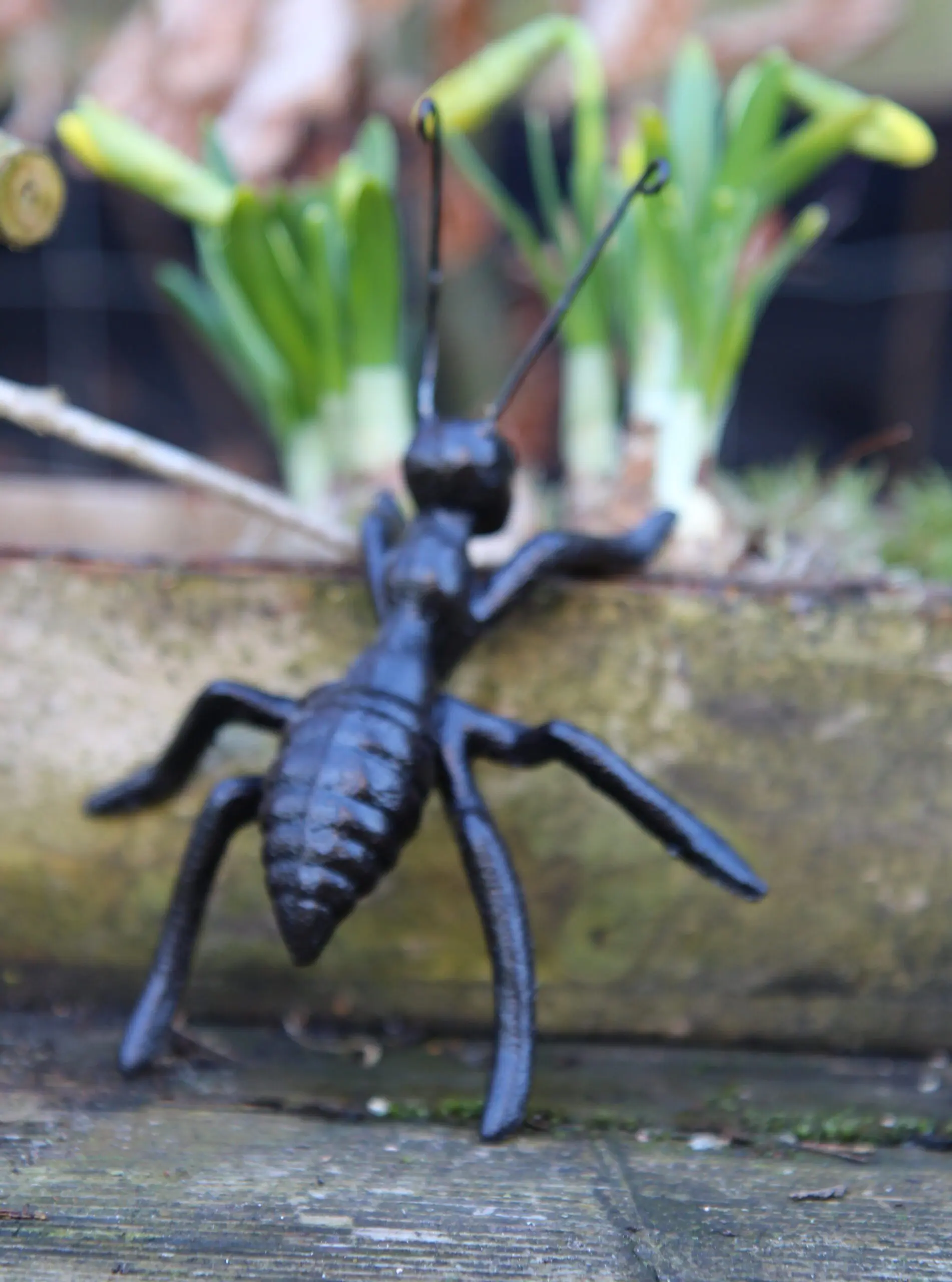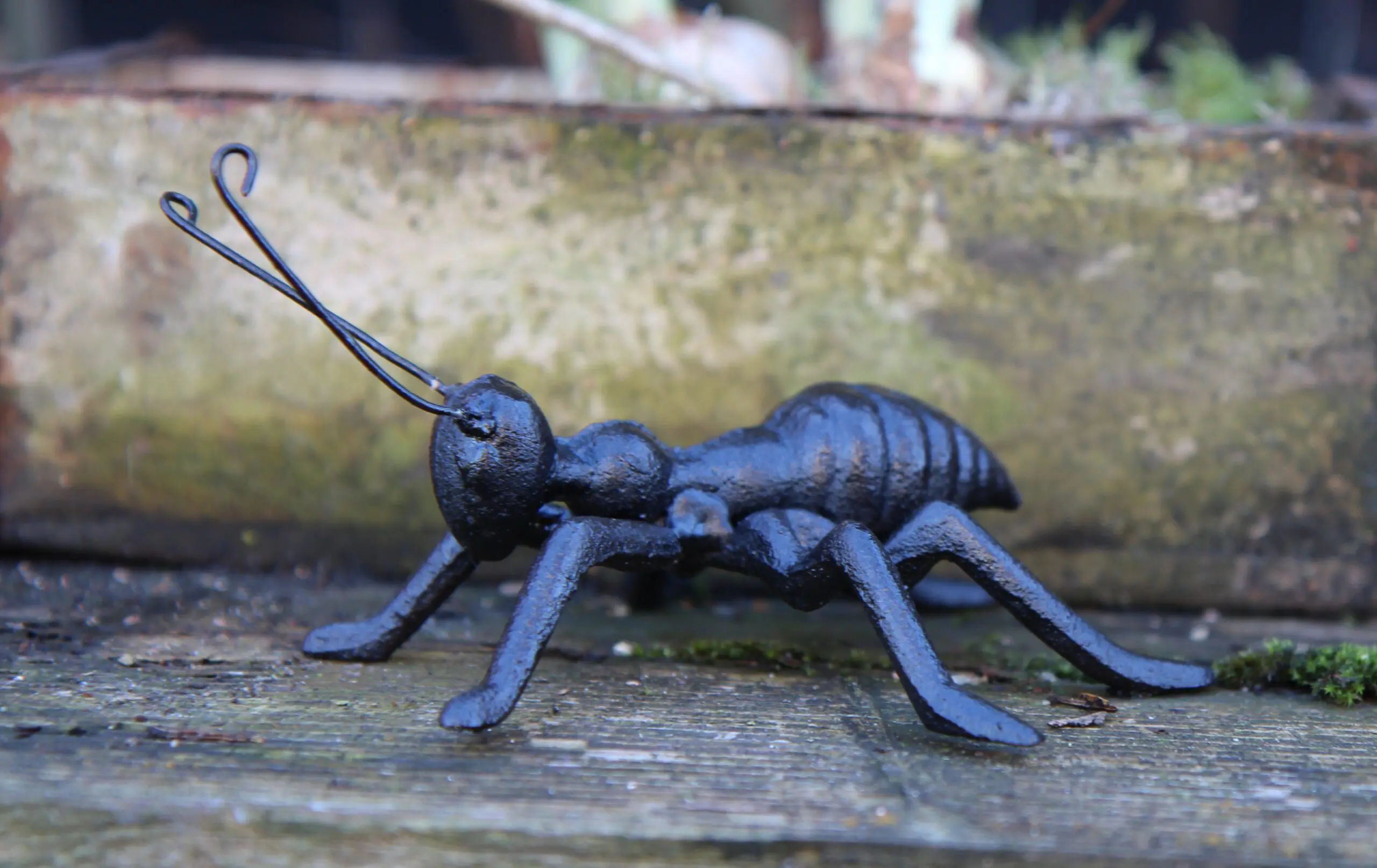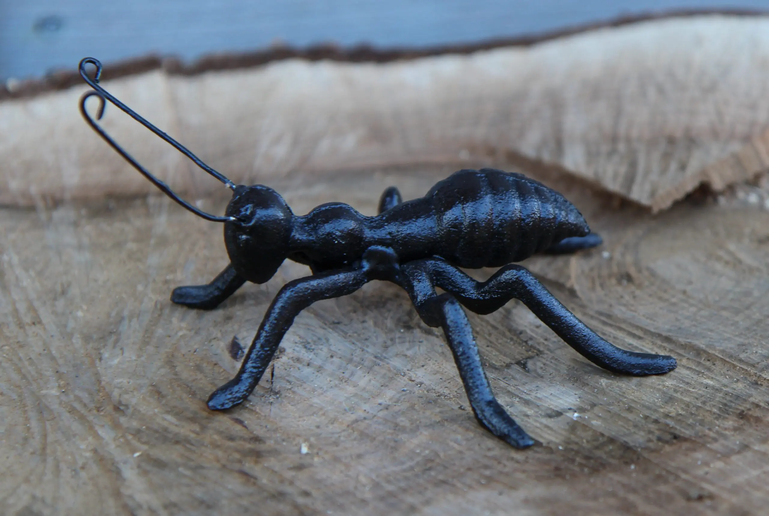 Een decoratieve gietijzeren mier in het zeer donkerbruin/zwart.