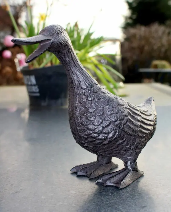 Een decoratieve “kwakende” eend van gietijzer.