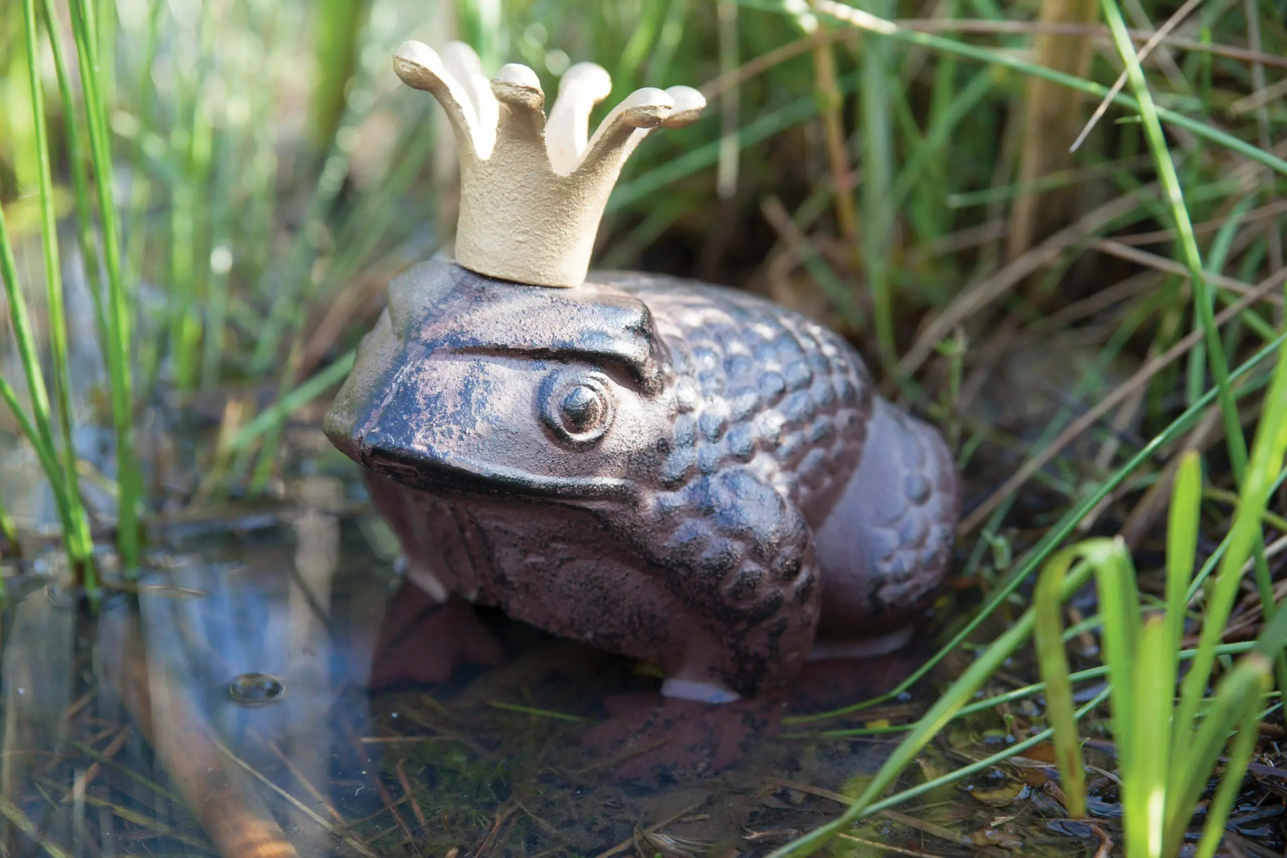 Een gietijzeren kikkerkoning met een “gouden” kroon.