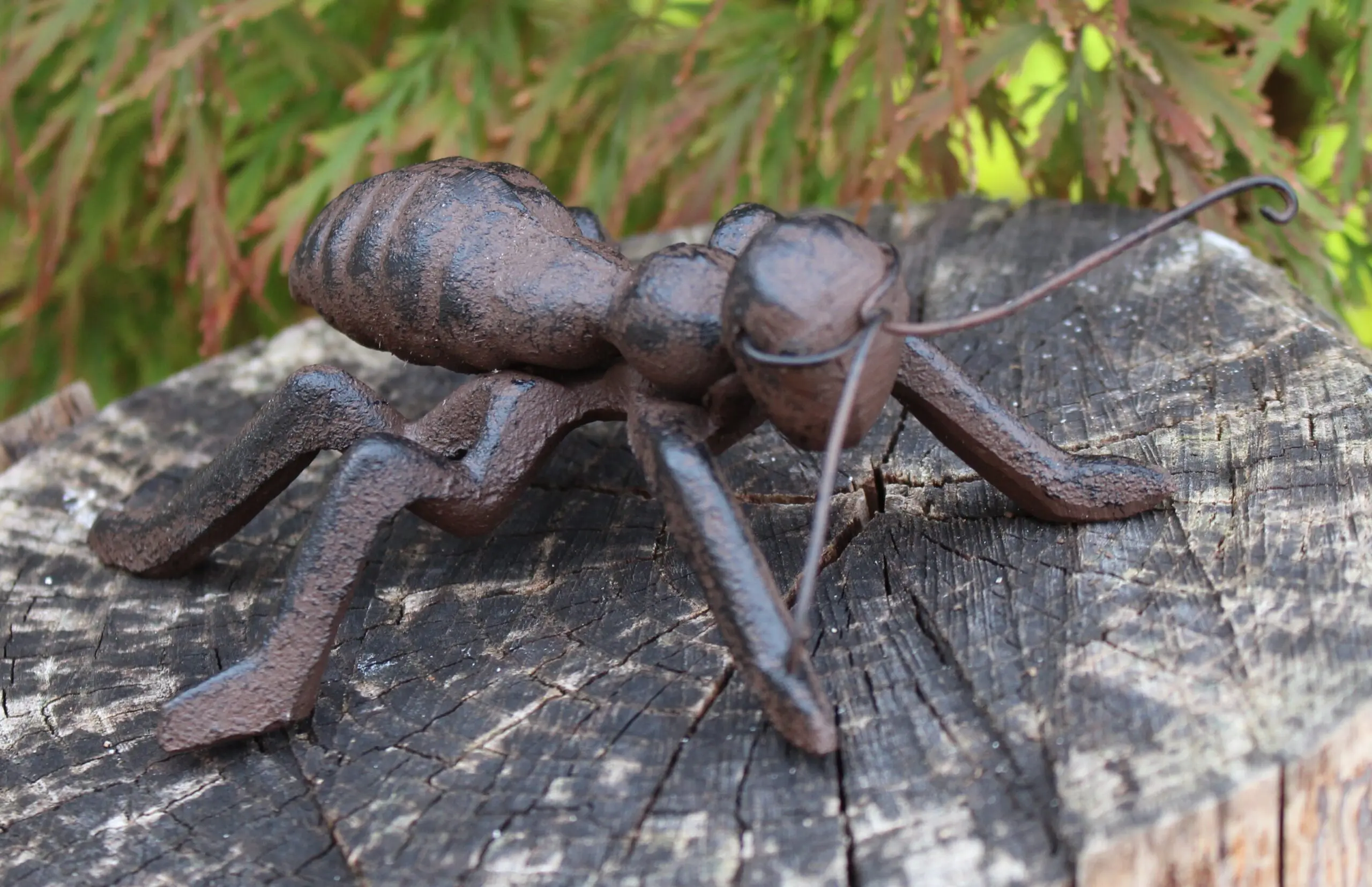 De mier is gedetailleerd gegoten uit gietijzer, alleen de voelsprieten zijn van zwart ijzerdraad.