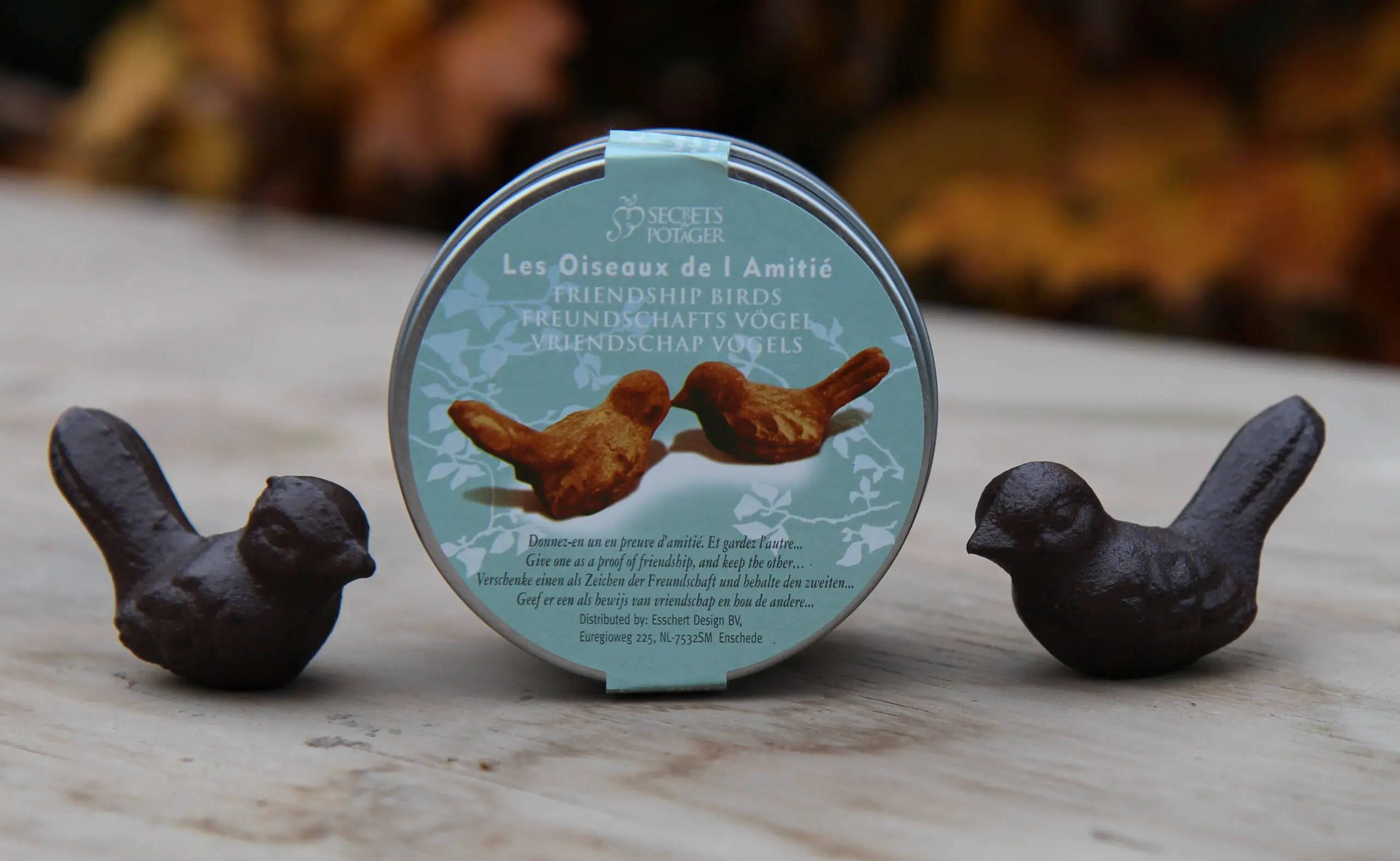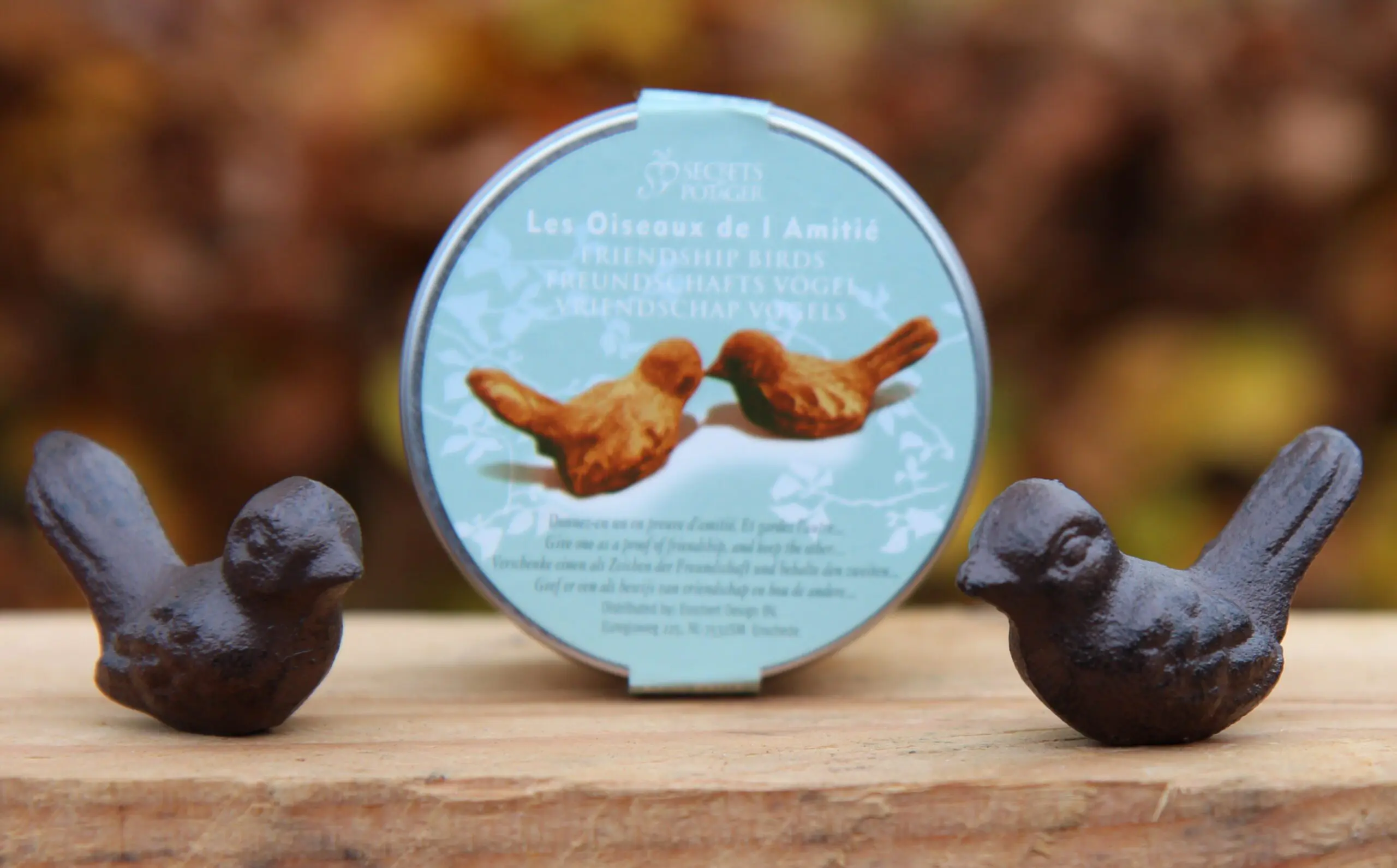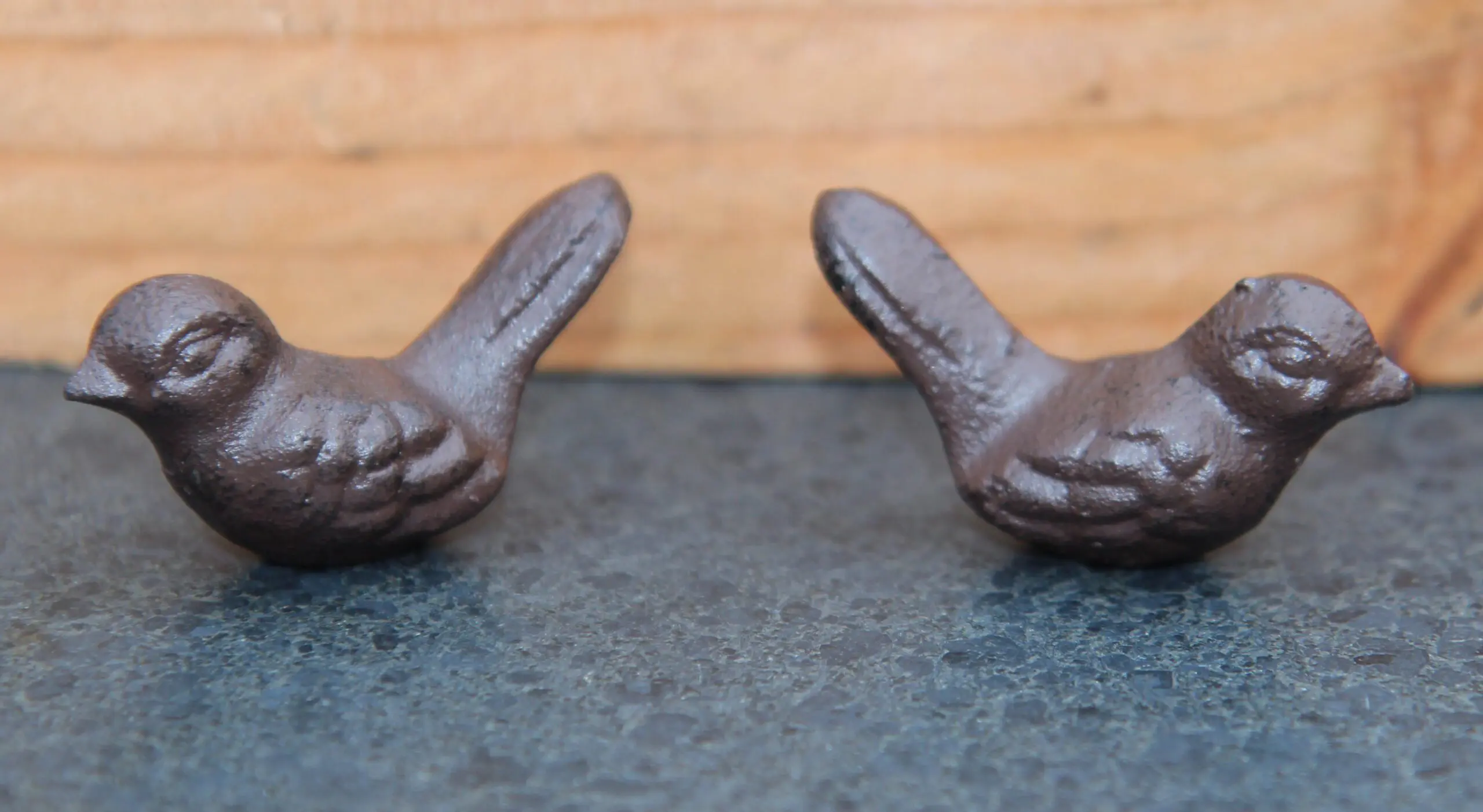 2 kleine gietijzeren vogeltjes donkerbruin in een blikje
