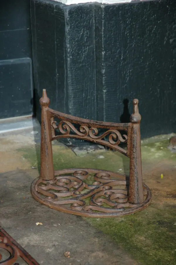 Een decoratieve gietijzeren schoenschraper in de vorm van ellips.