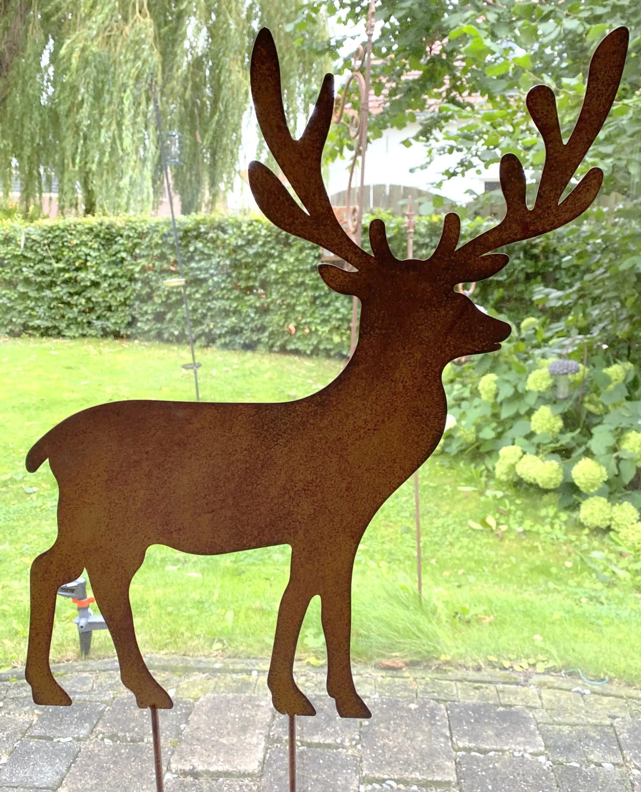 een wat grotere metalen tuinsteker hert roestkleurig