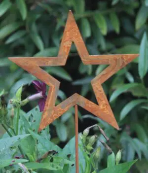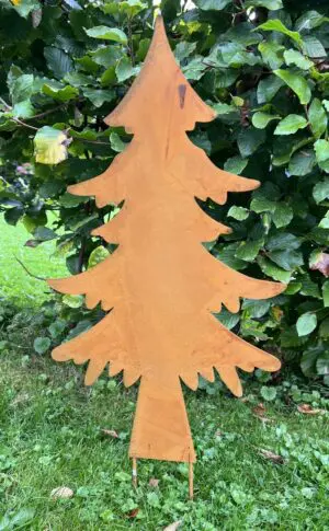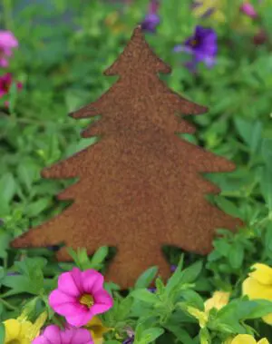 Een metalen tuinsteker kerstboom van roestig metaal.