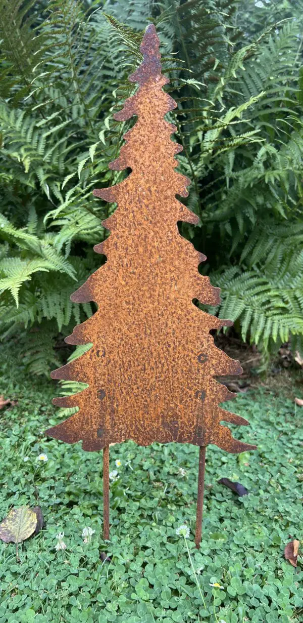 Een tuinsteker kerstboom van roestig metaal.