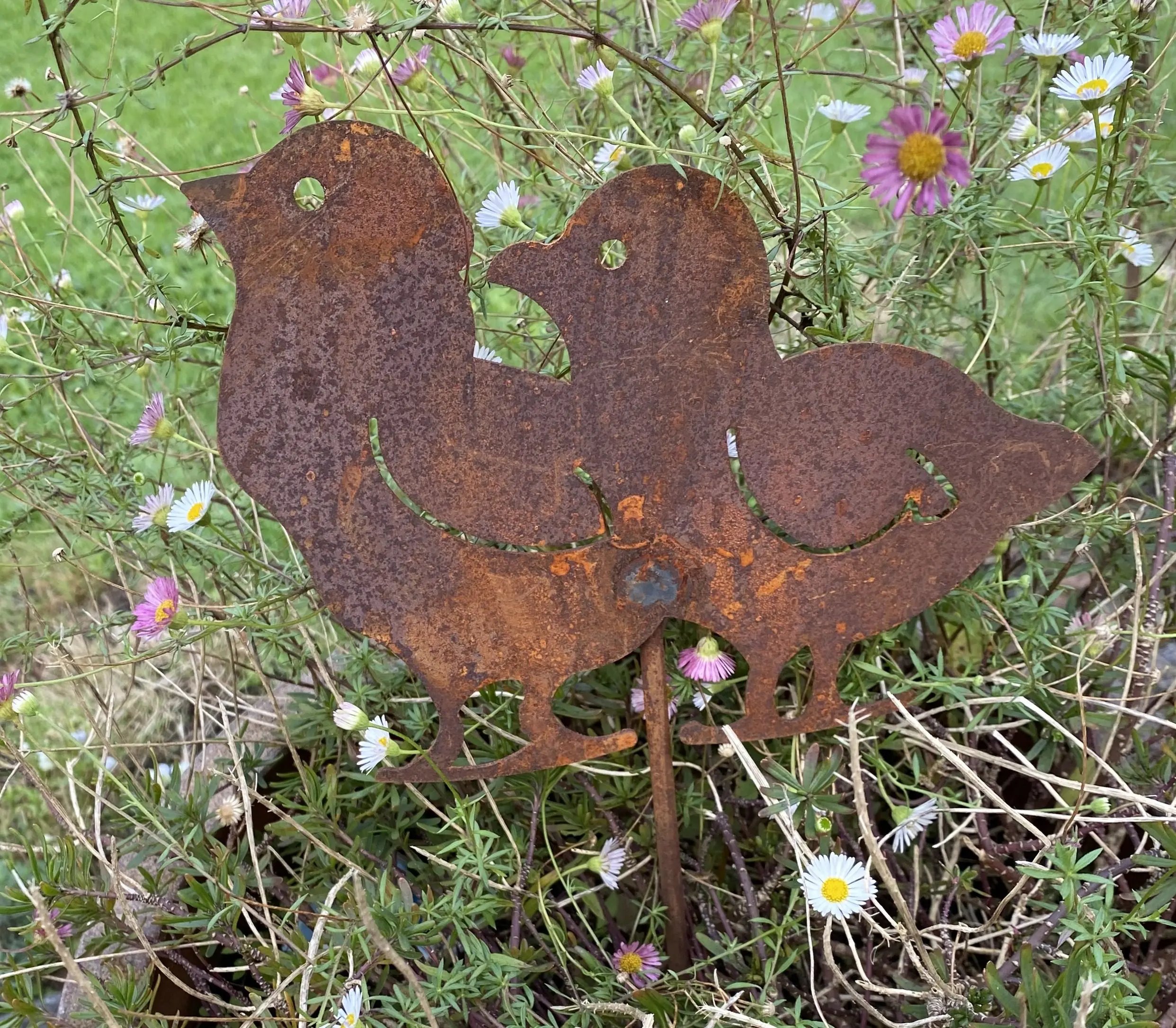 roestige metalen tuinsteker met 2 kuikens