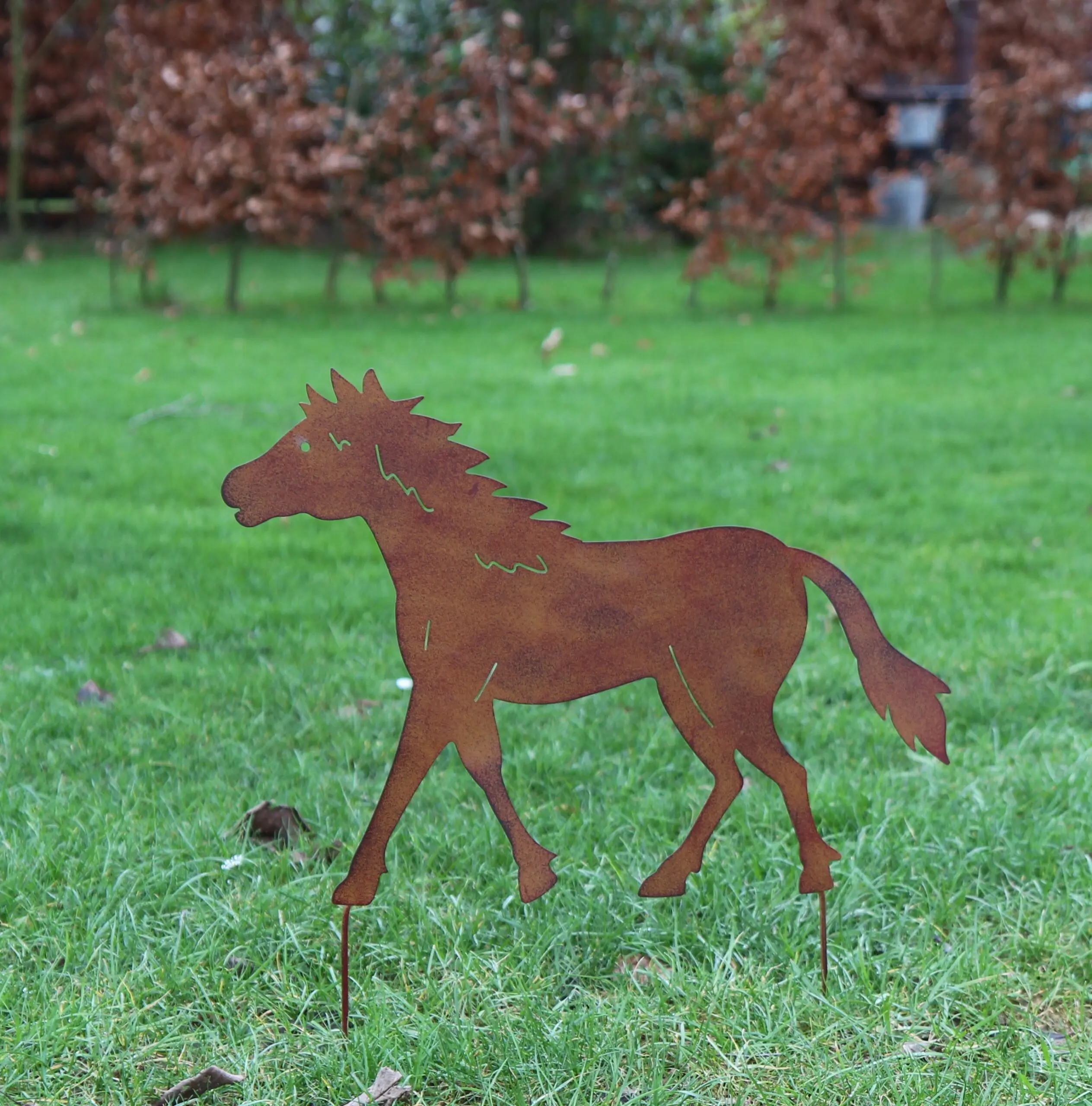 Een grote tuinsteker paard- pony van roestkleurig metaal.