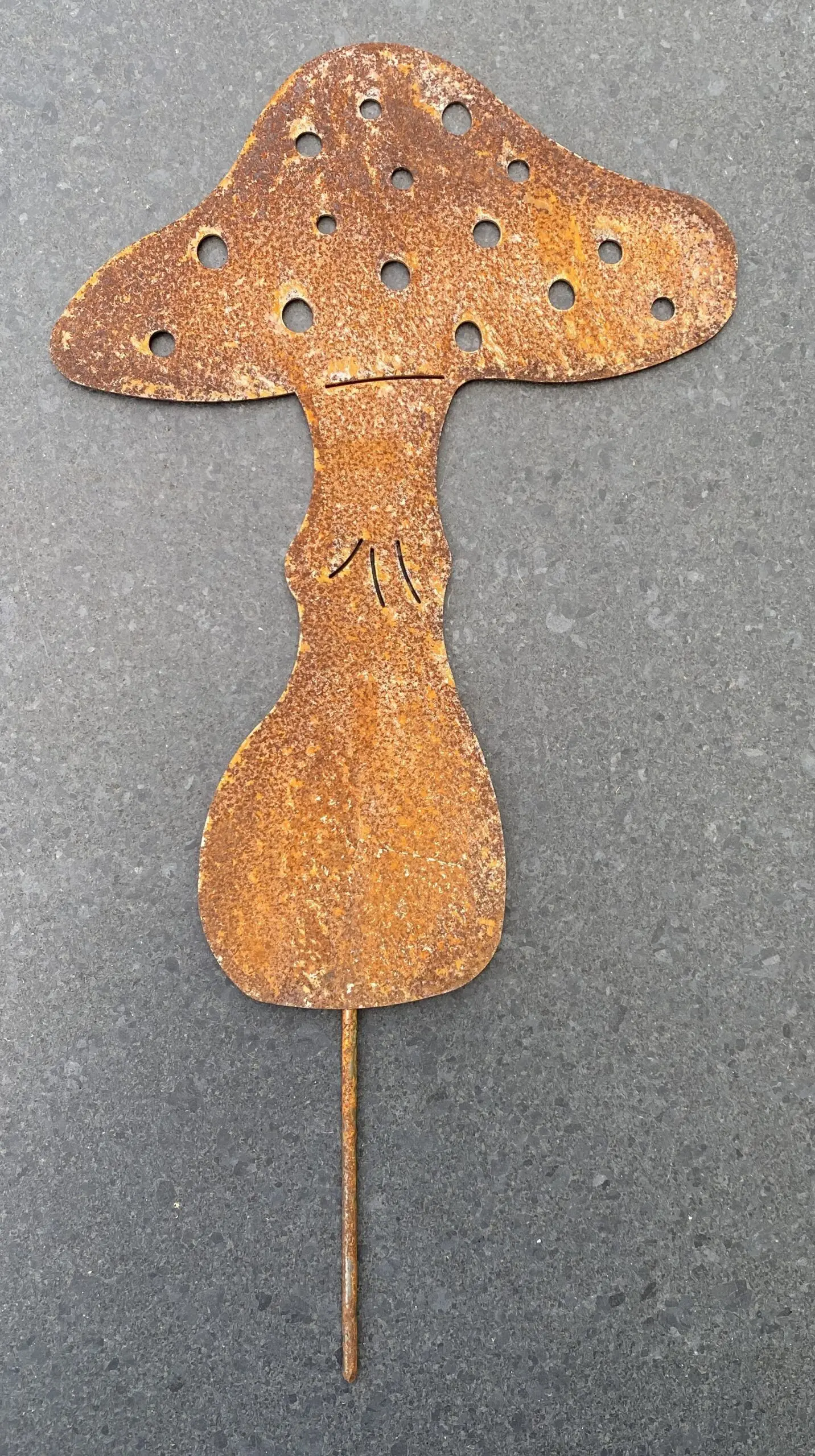 Een metalen tuinsteker paddenstoel van roestig metaal.
