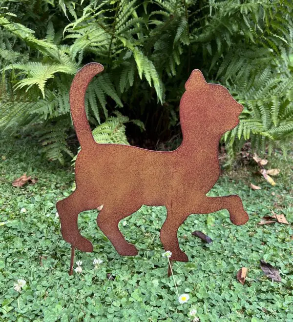 Een roestikleurig metalen tuinsteker poes, kat.