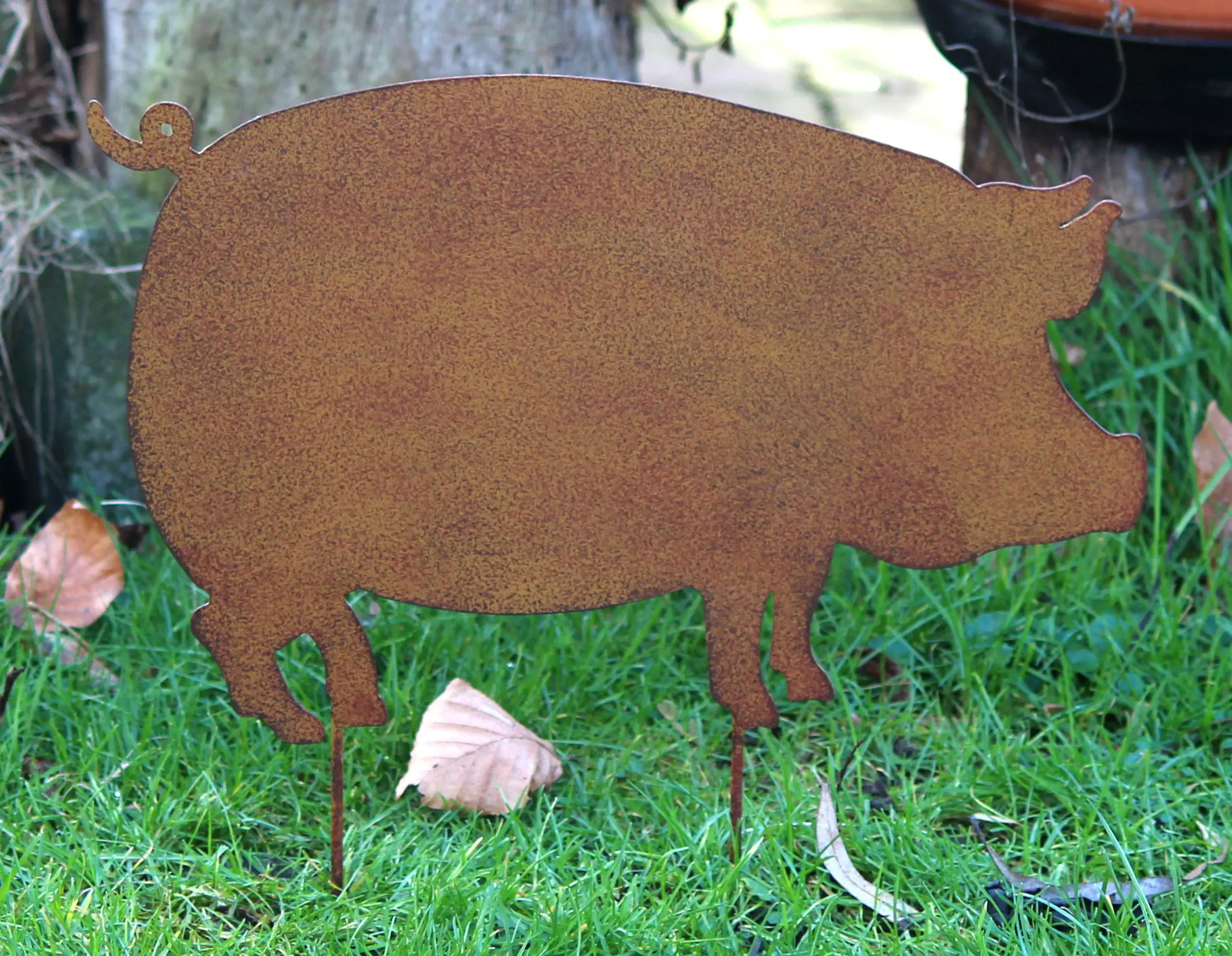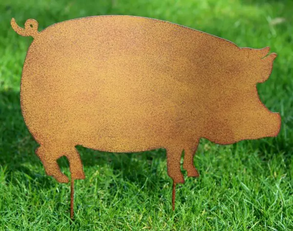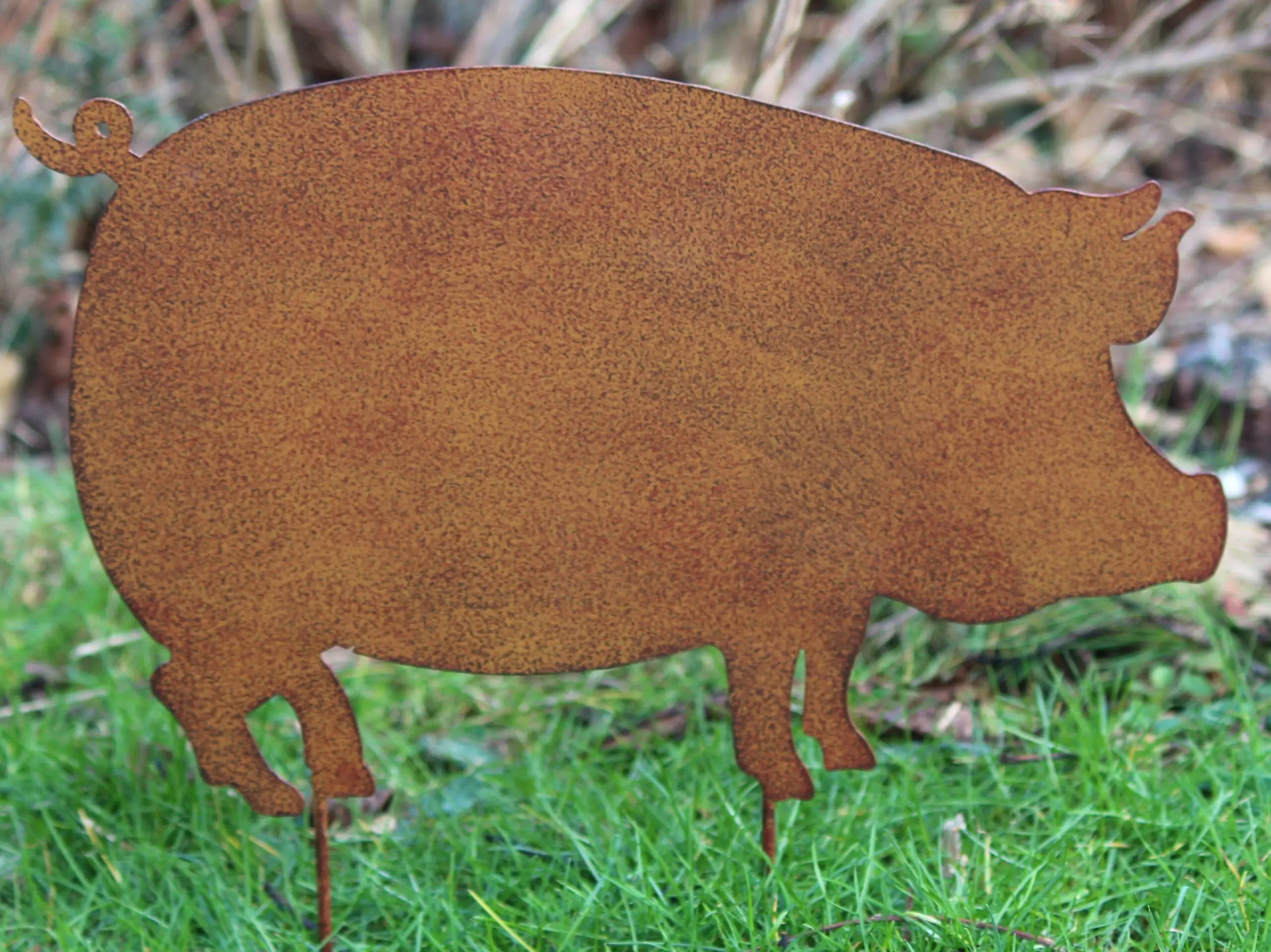 Een roestkleurig varken, big als tuinsteker van metaal.