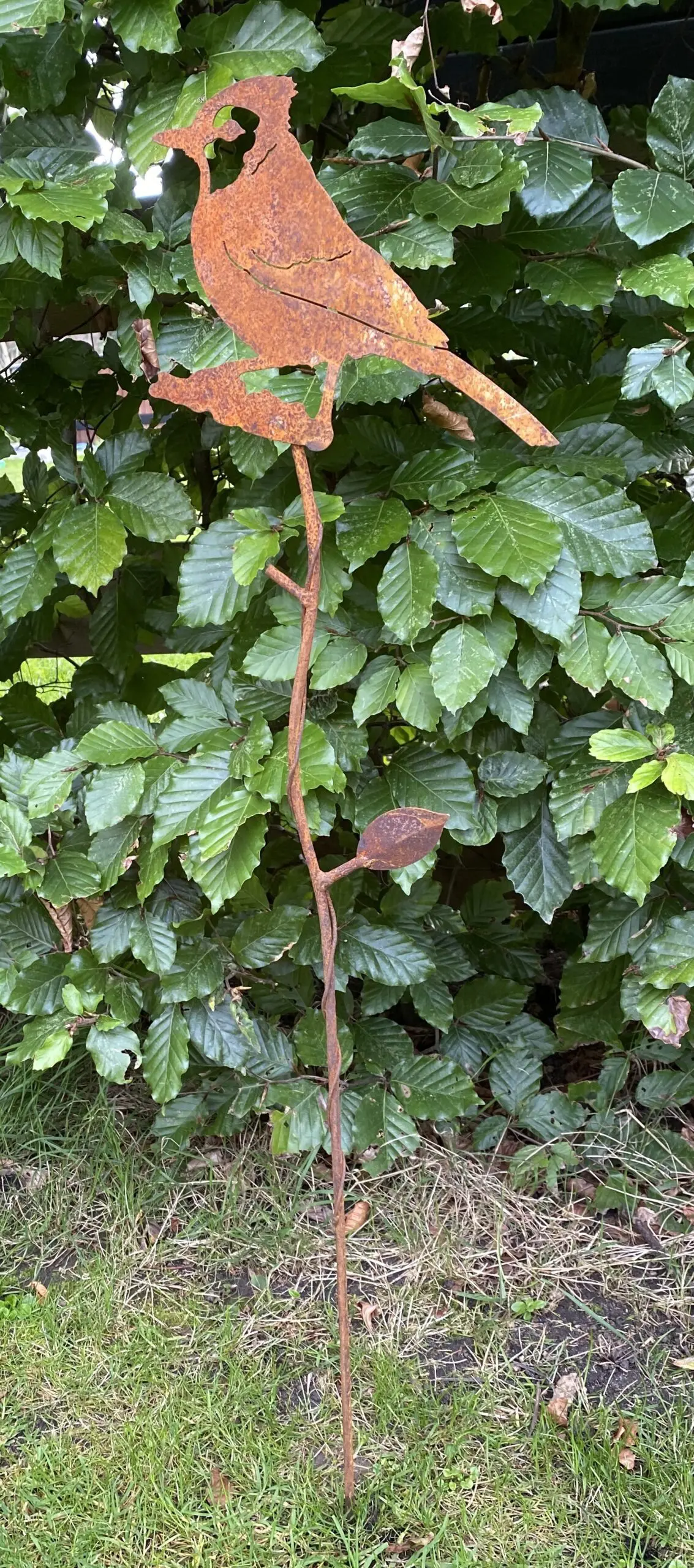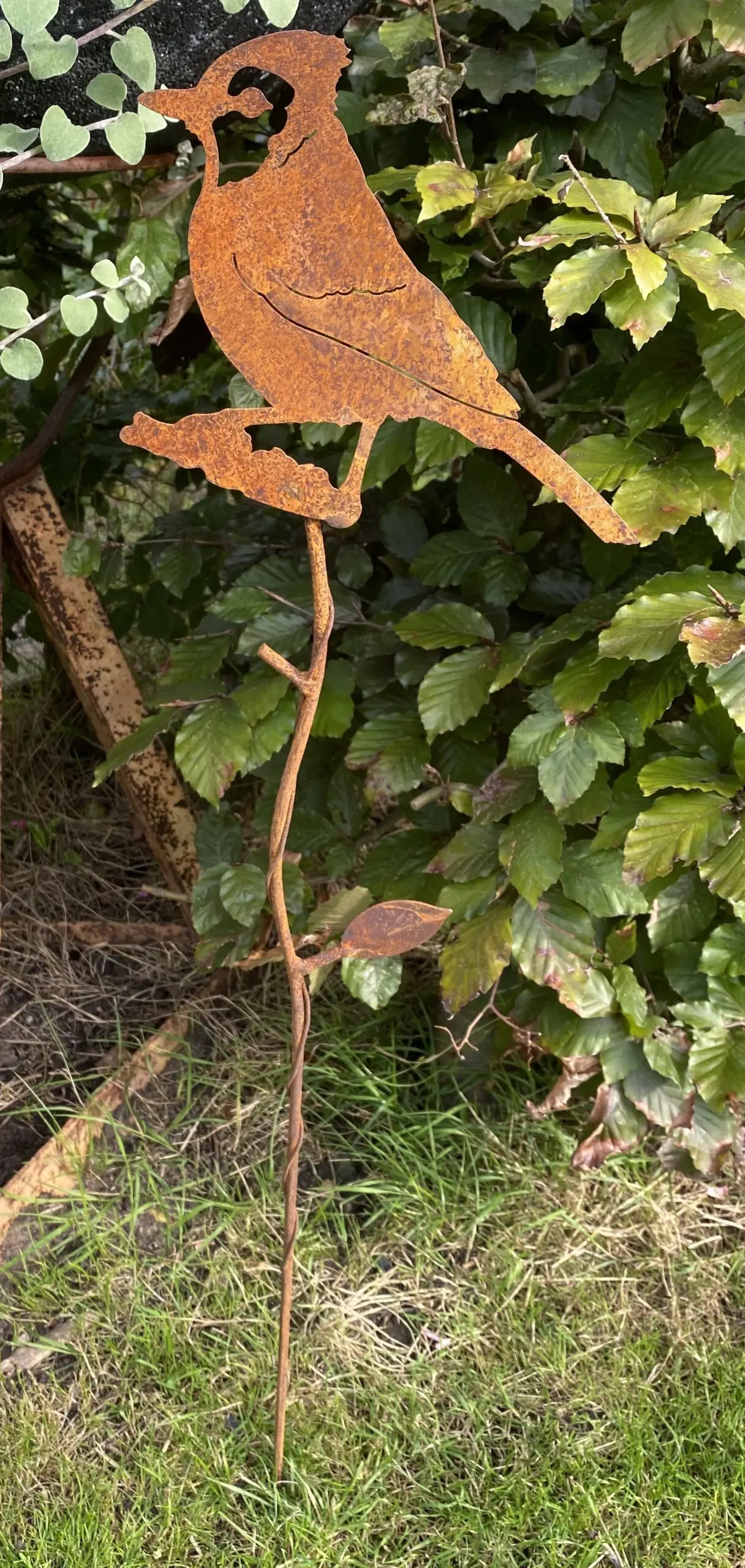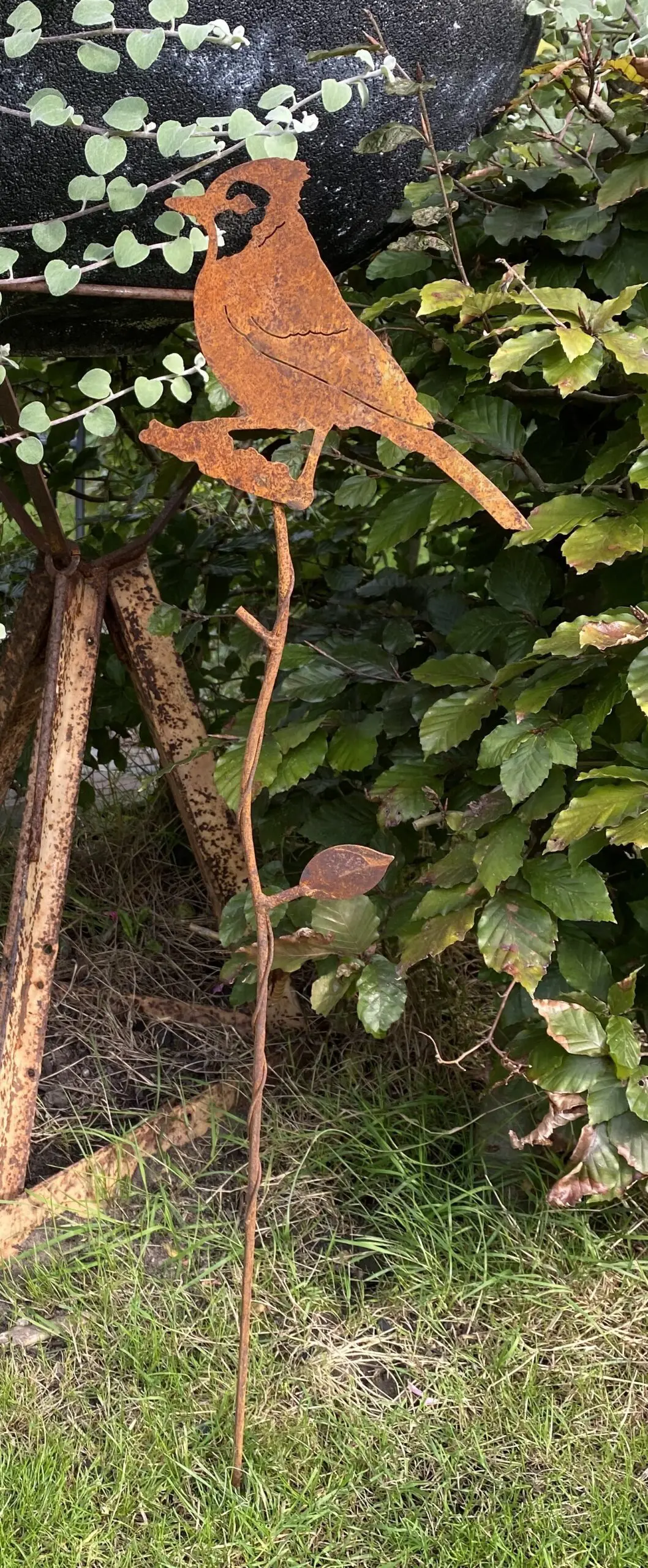 De vogel is op een roestige “tak” gelast, met een soort sierlijke draad er omheen gedraaid.