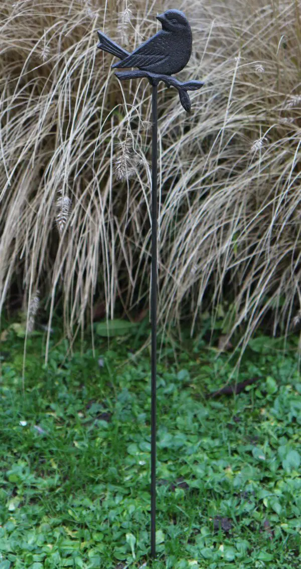 Een gietijzeren tuinsteker met bovenop een vogeltje.