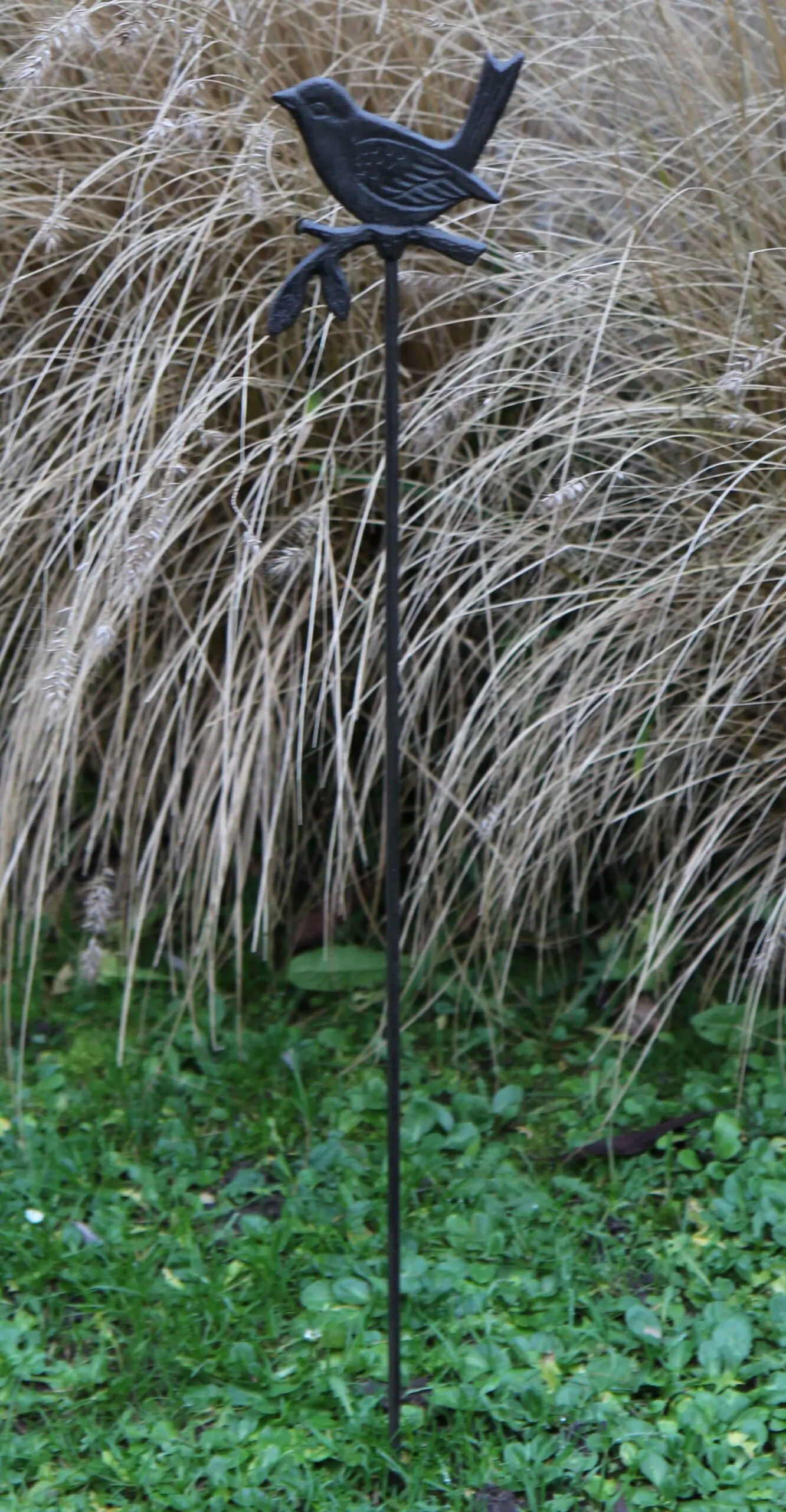 Een gietijzeren tuinsteker met bovenop een vogeltje.