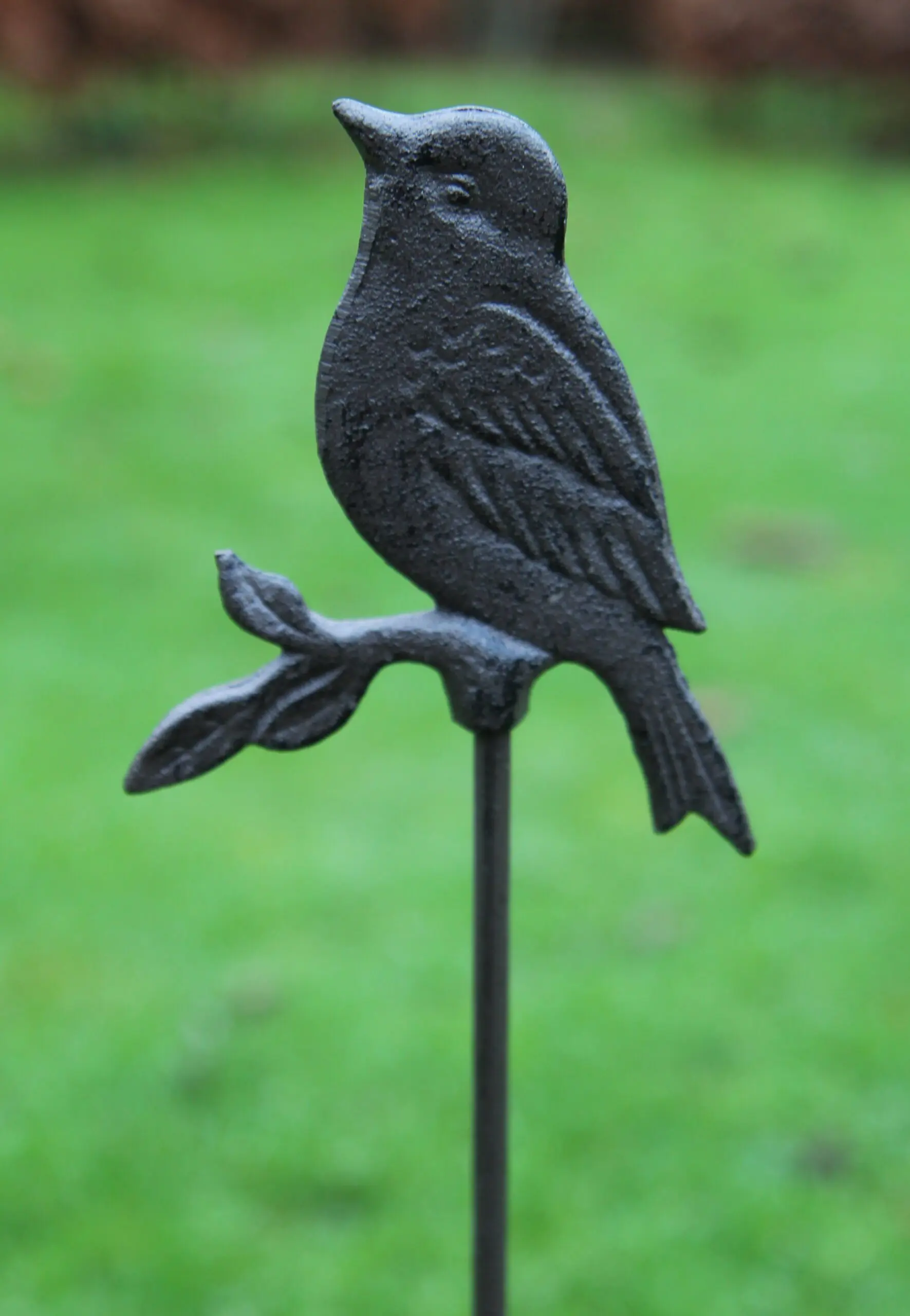 Een gietijzeren tuinsteker met bovenop een vogeltje.