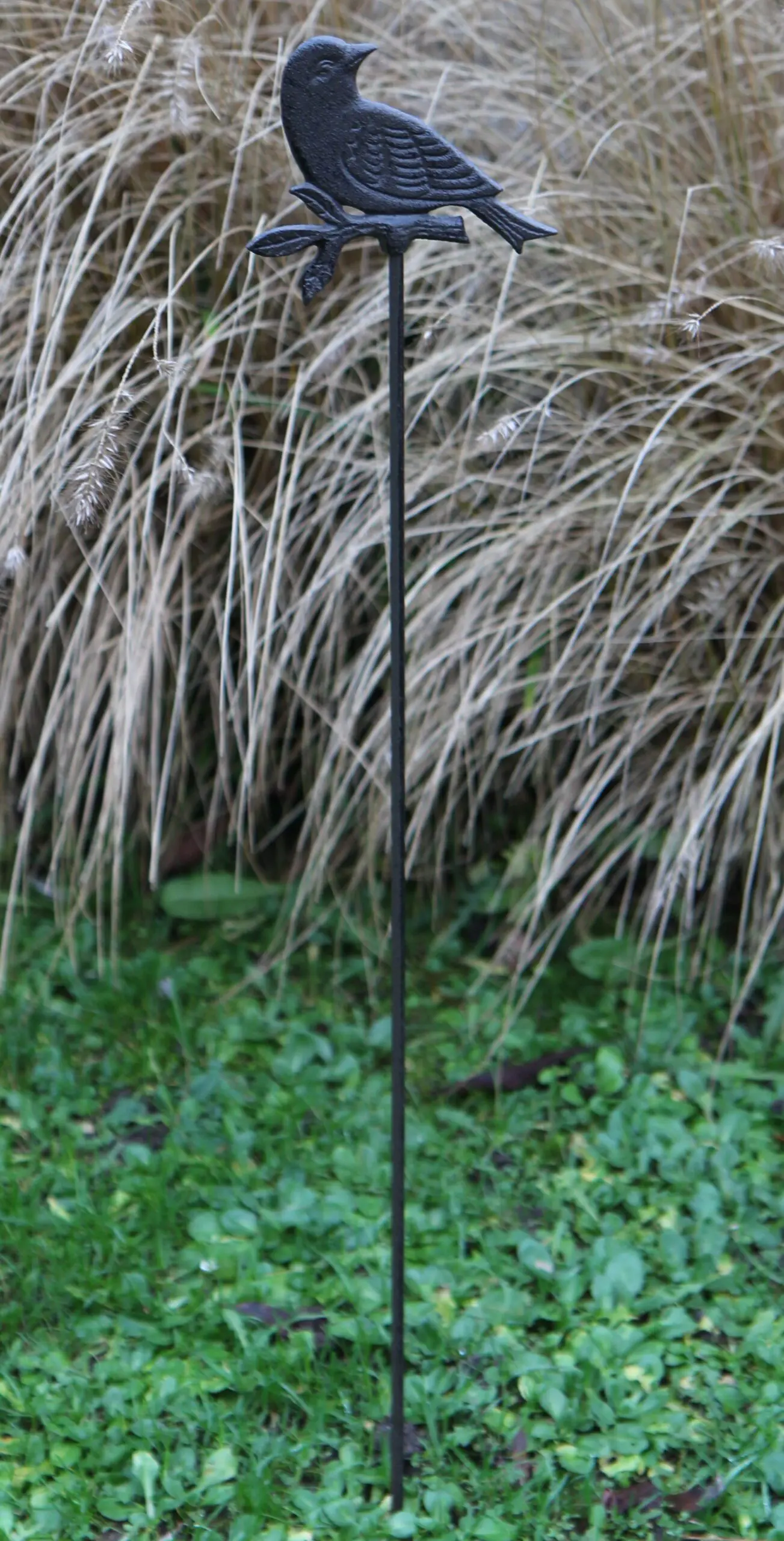 Een gietijzeren tuinsteker met bovenop een vogeltje.