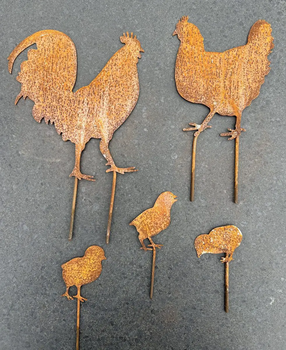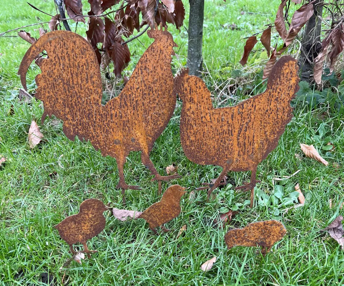 Een set van een haan, kip en 3 kuikens van roestig metaal.