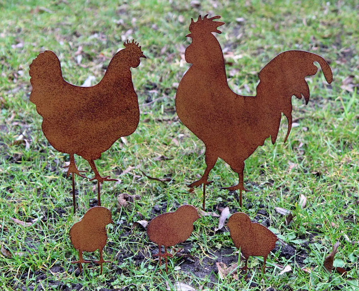 Tuinstekers haan, kip, kuikens, set van 5, roestig metaal SKS276