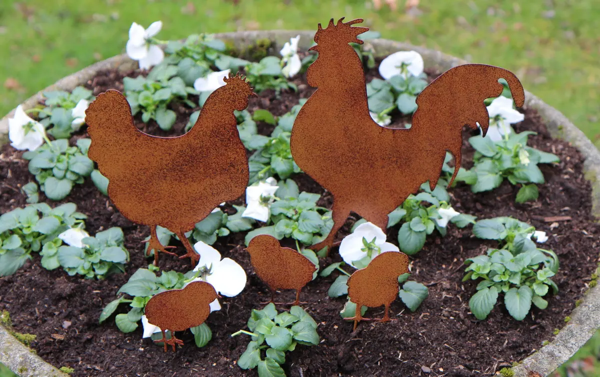 Een set van een haan, kip en 3 kuikens van roestkleurig metaal.