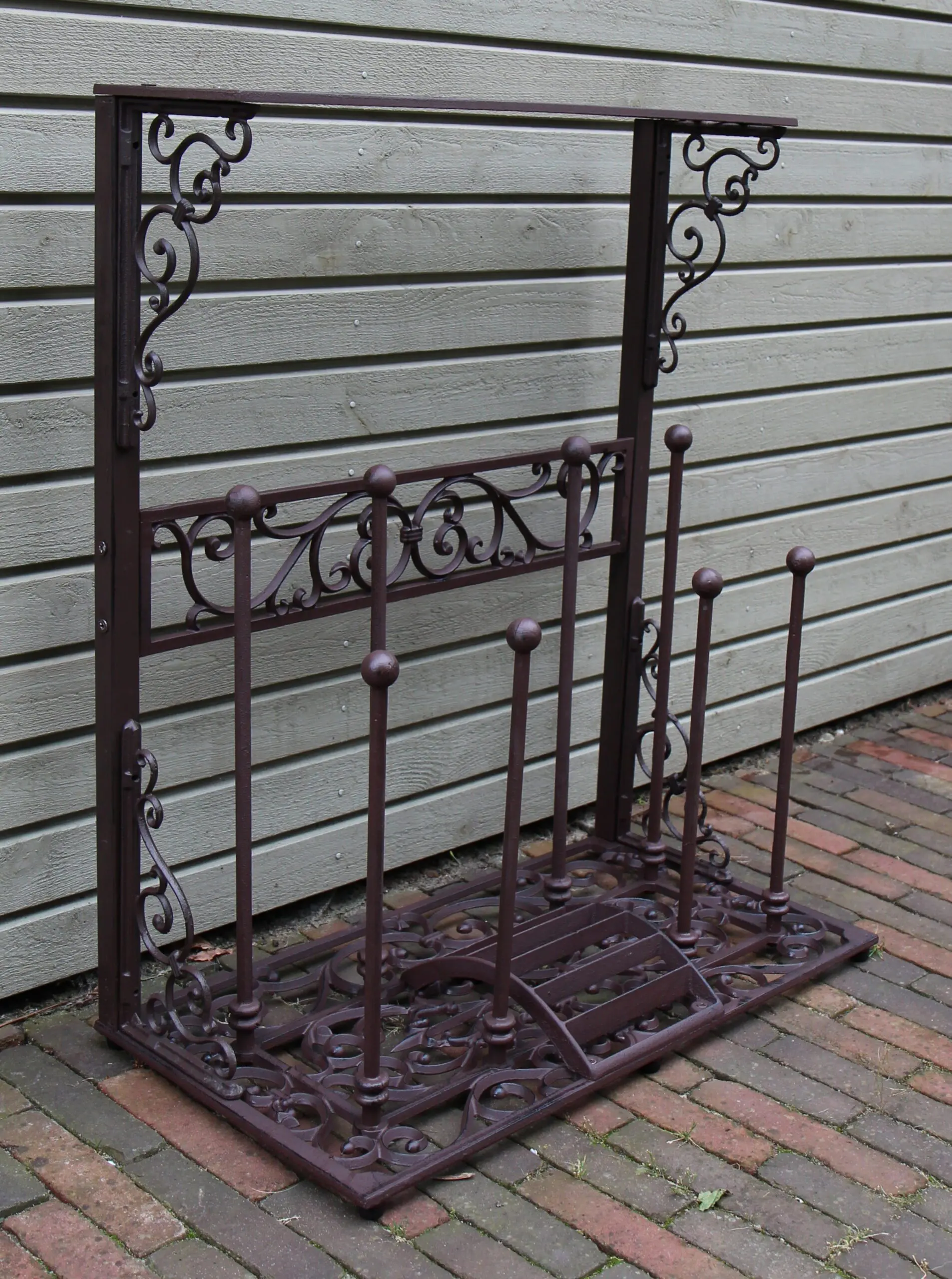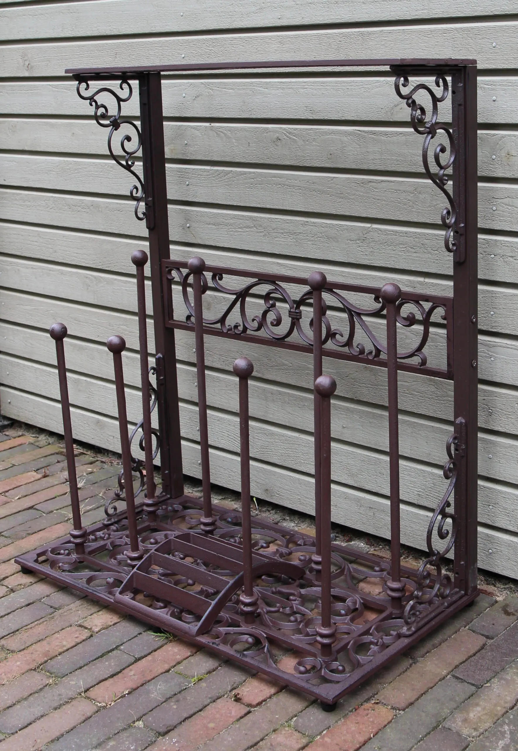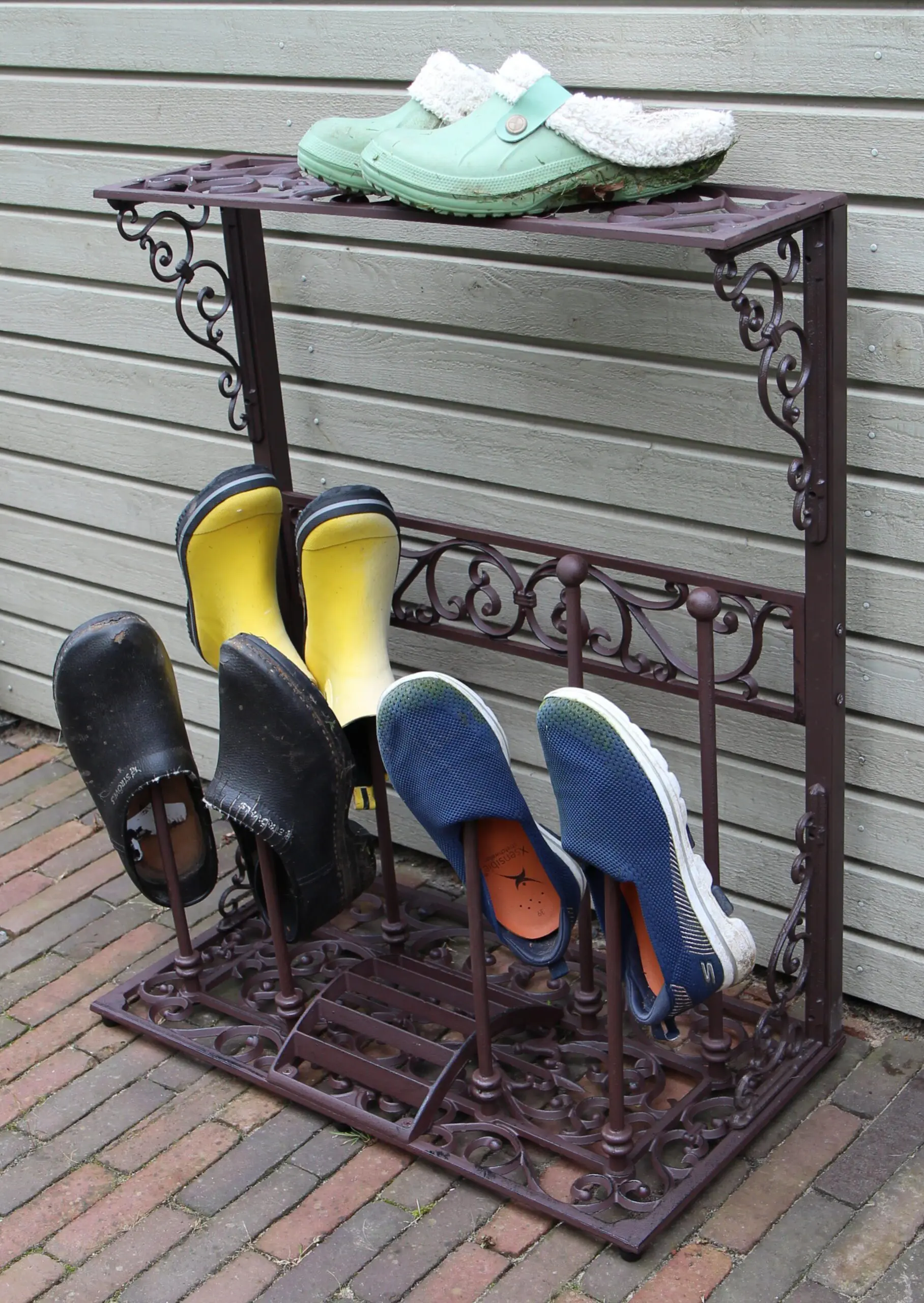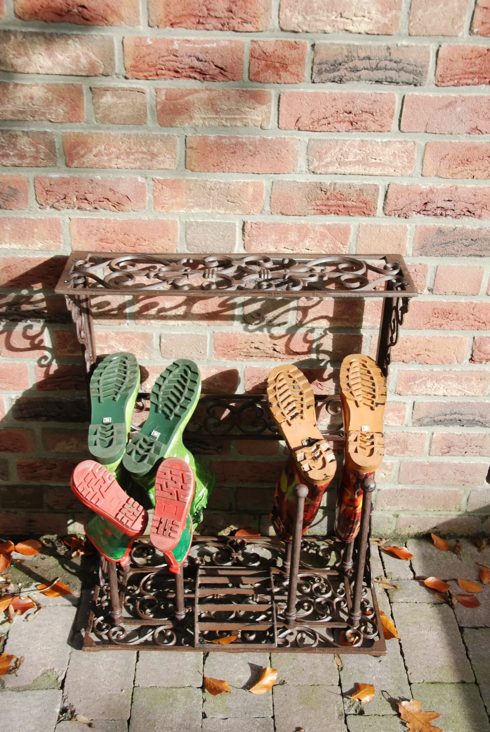 Een groot gietijzeren laarzenrek voor 4 paar laarzen of klompen.