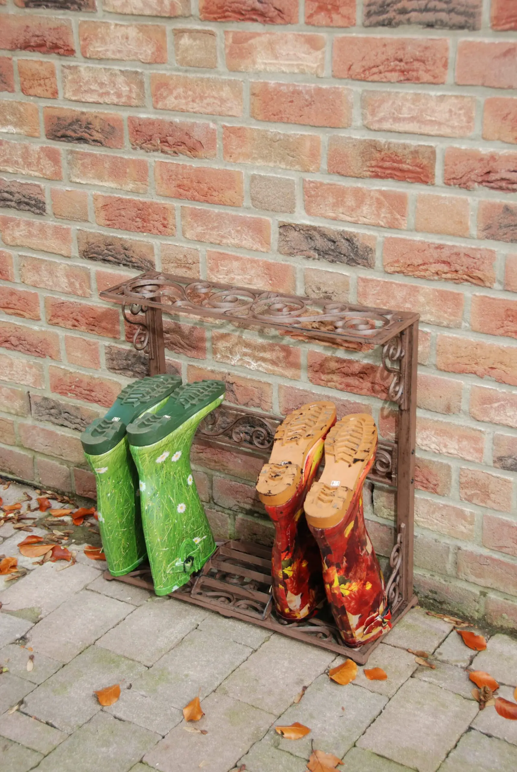 Een antiek lijkende gietijzeren laarzenrek voor 2 paar laarzen.