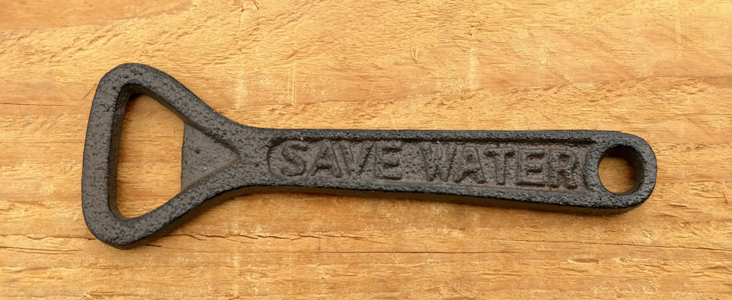 Een gietijzeren flesopener met aan de ene kant “save water”