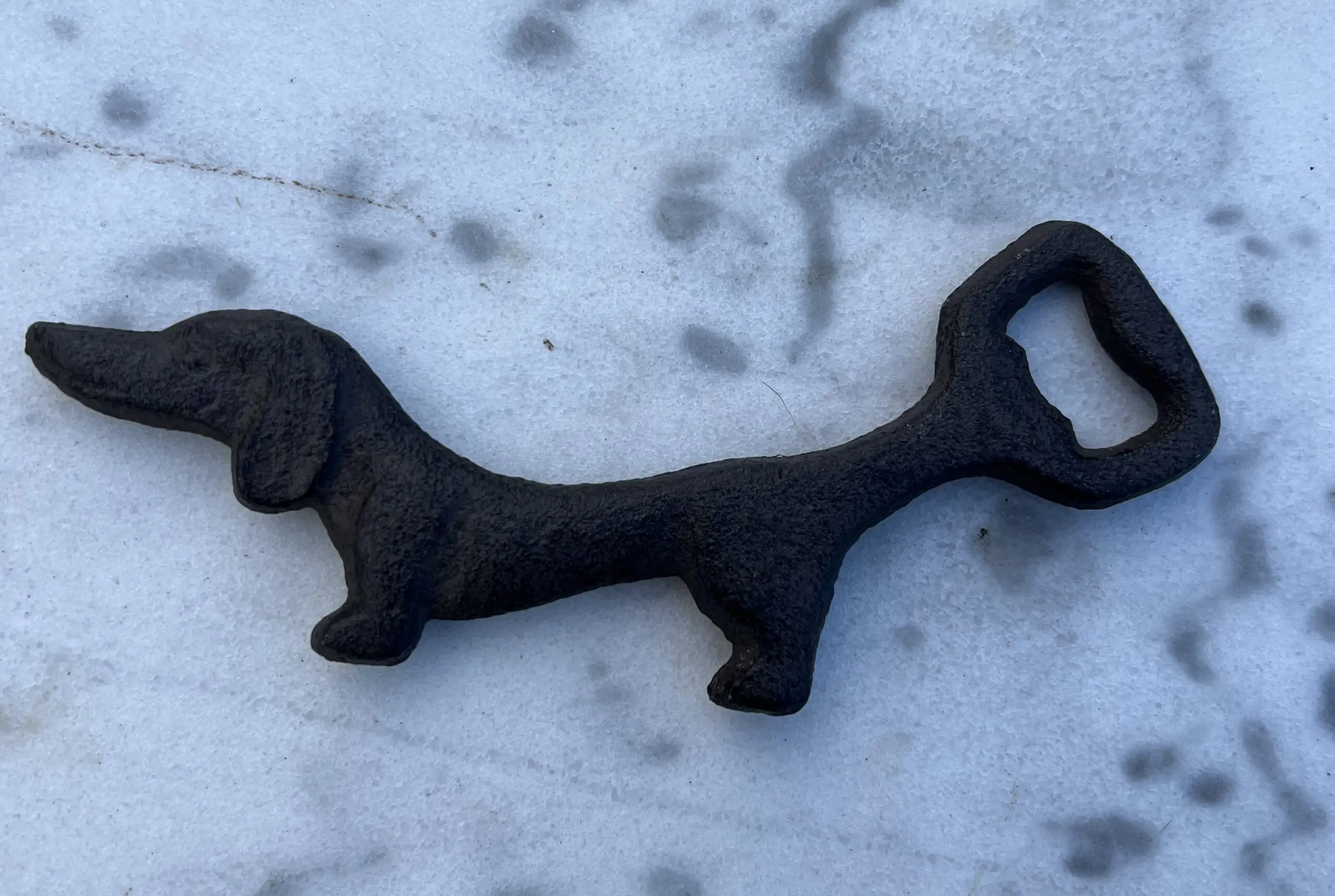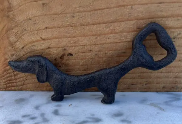 Een gietijzeren flessenopener in de vorm van een hond, teckel.