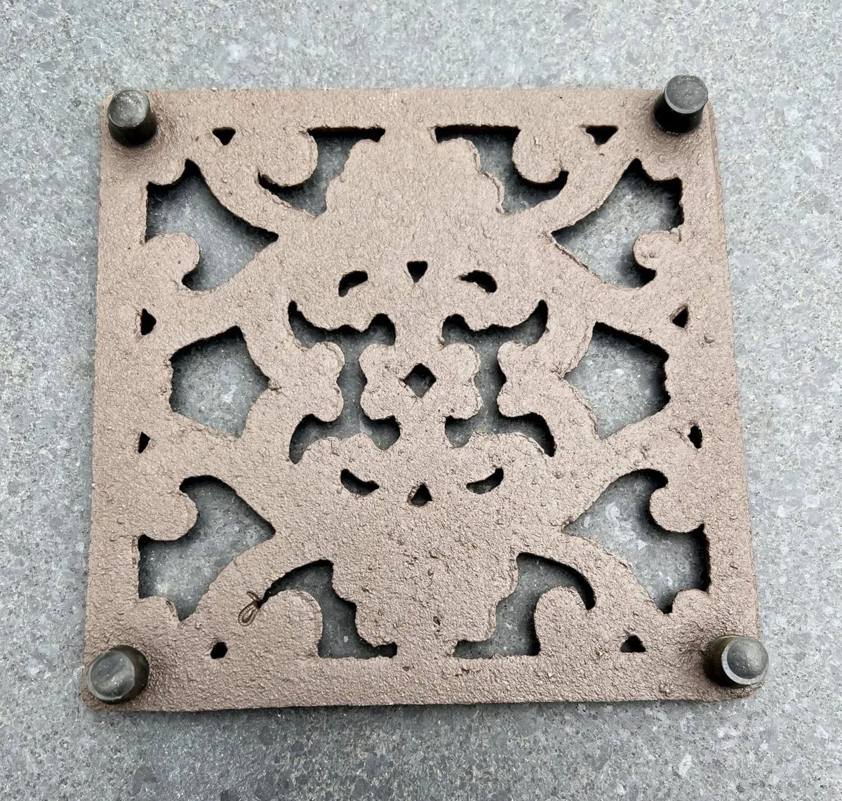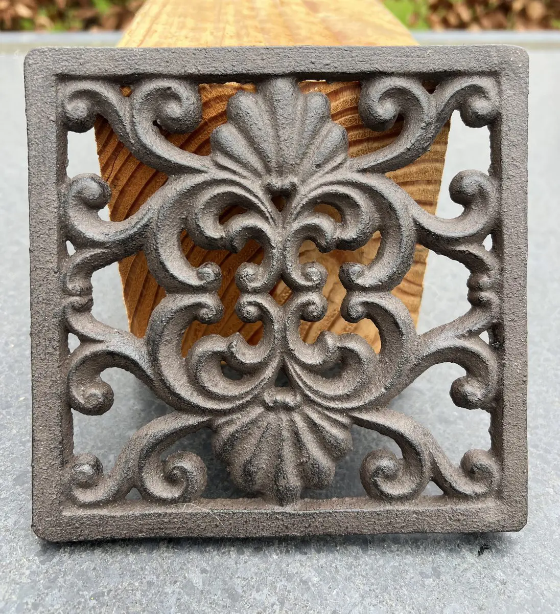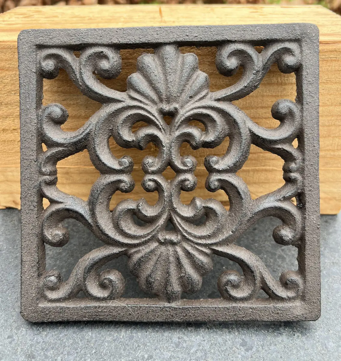Mooie vierkante gietijzeren onderzetter.