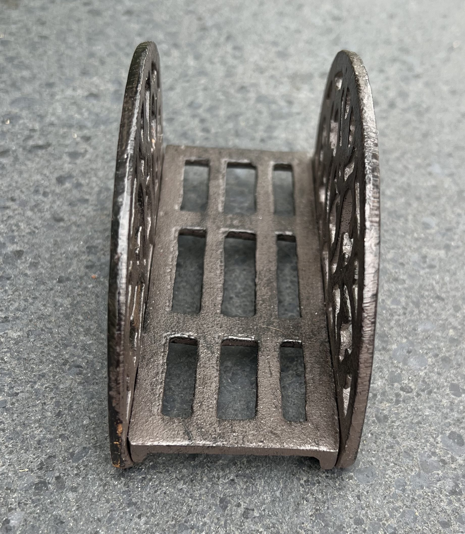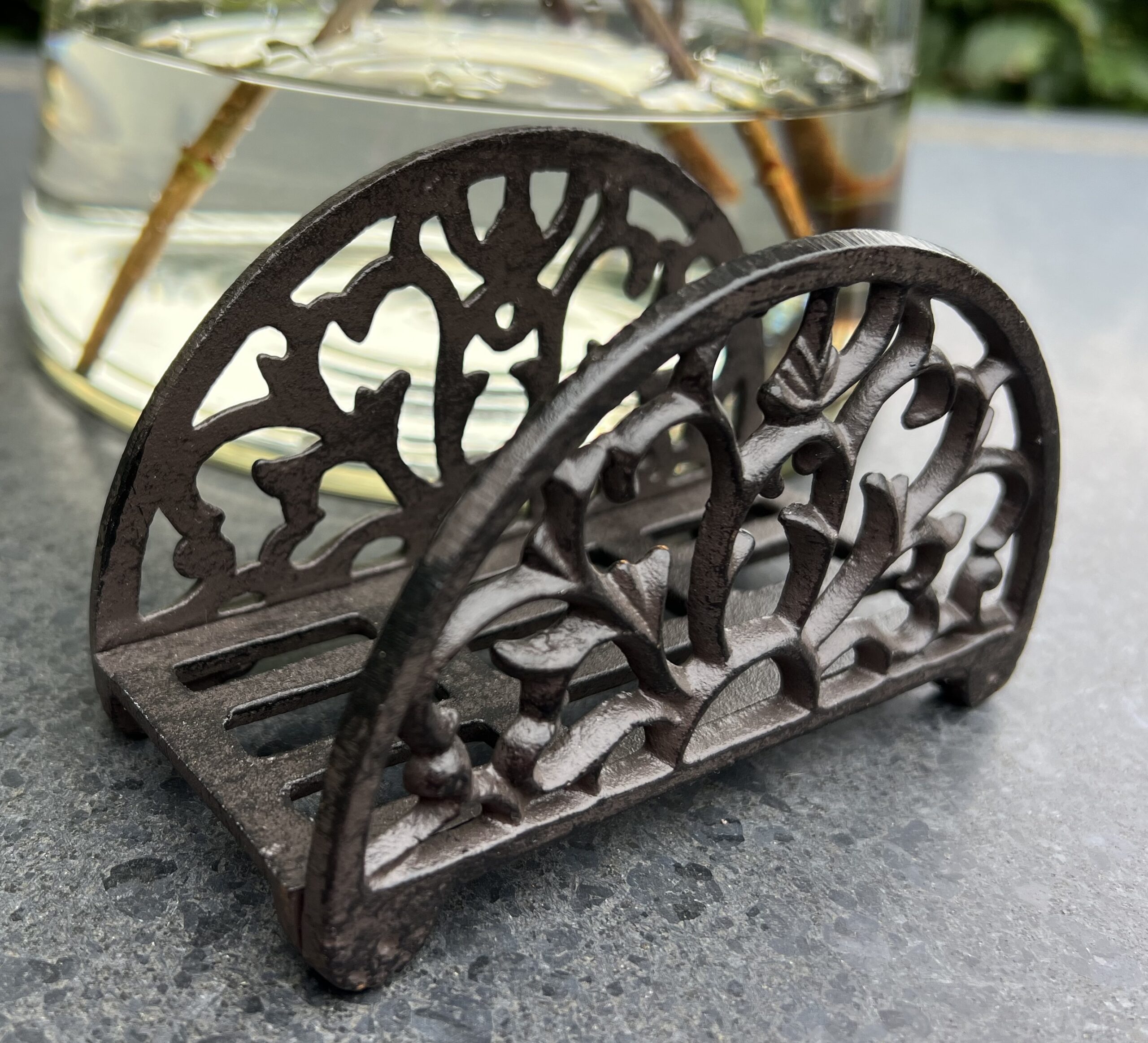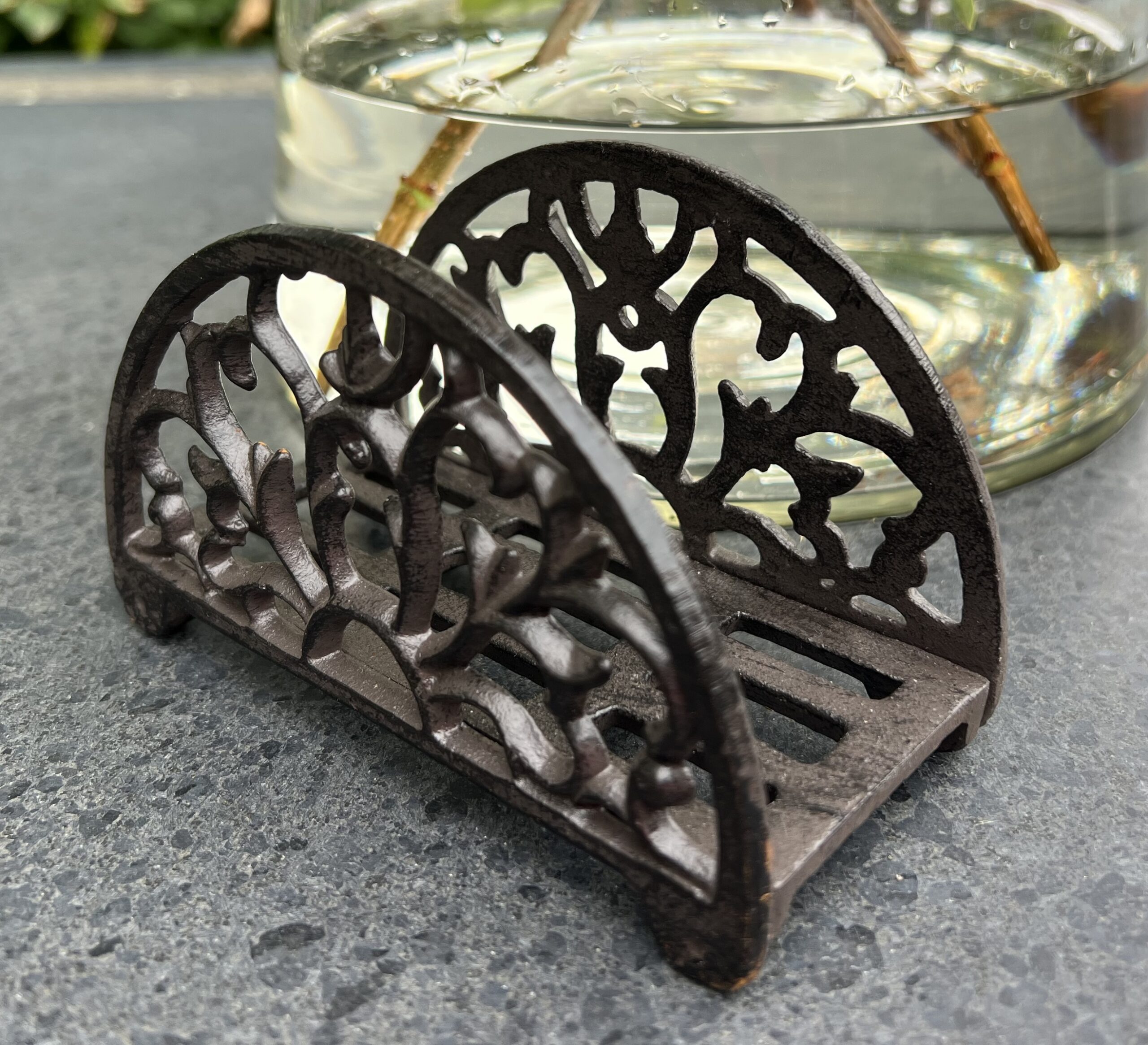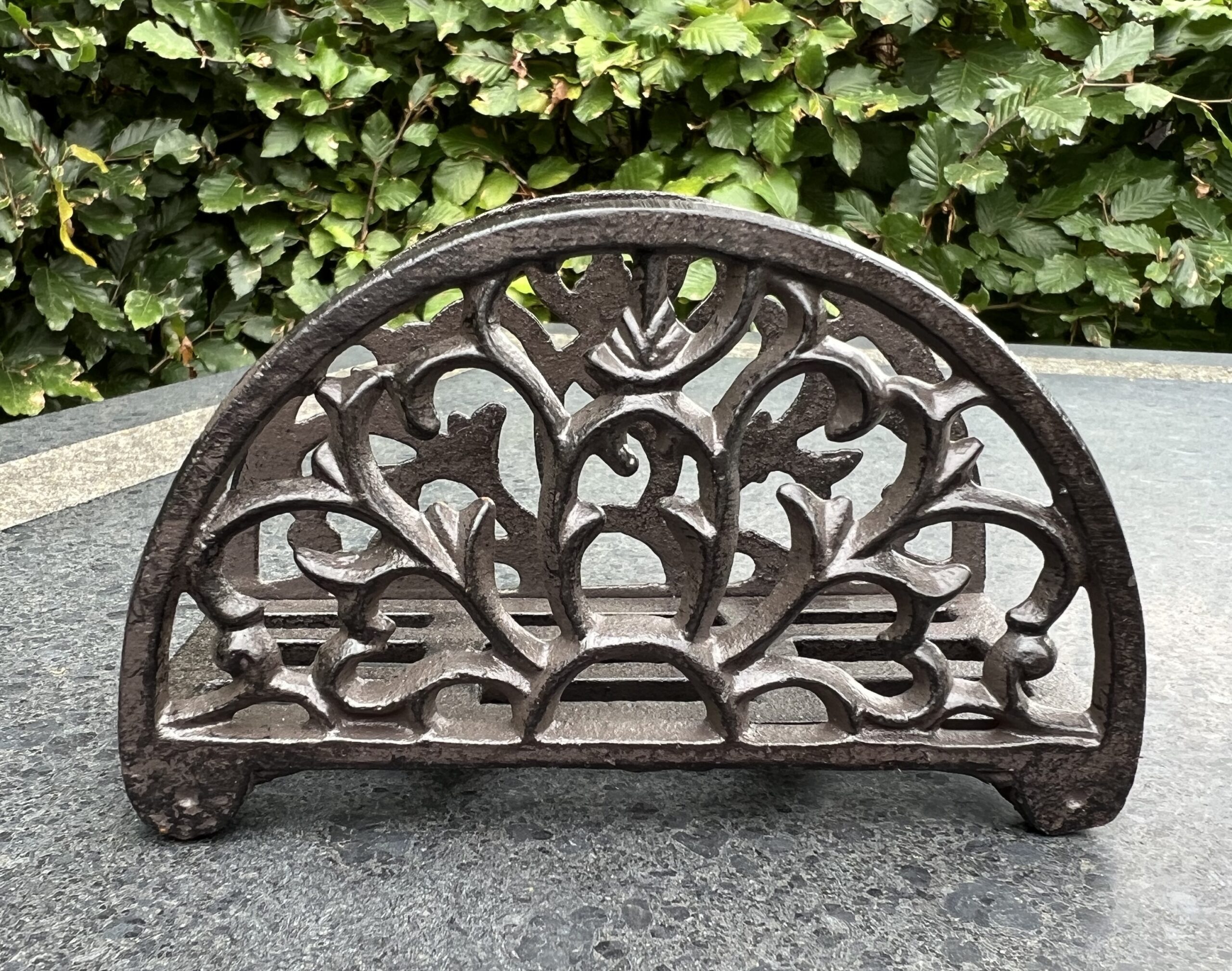 Een gietijzeren servethouder met mooie versierselen.