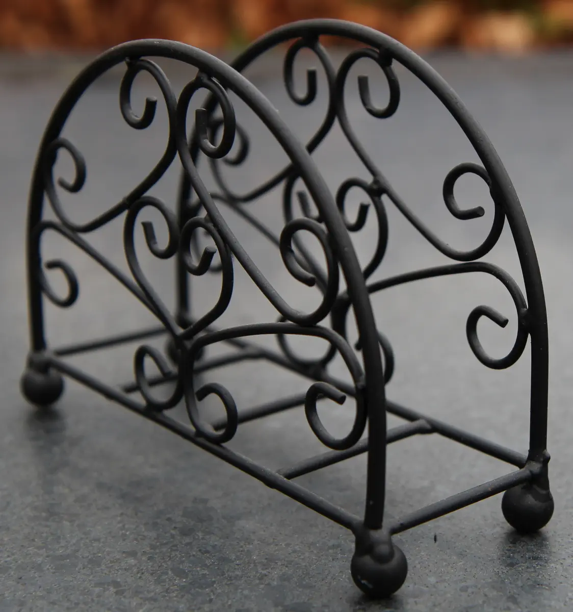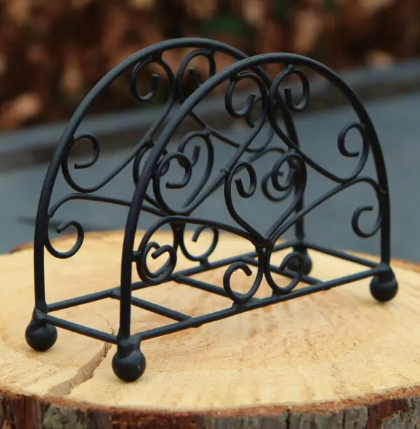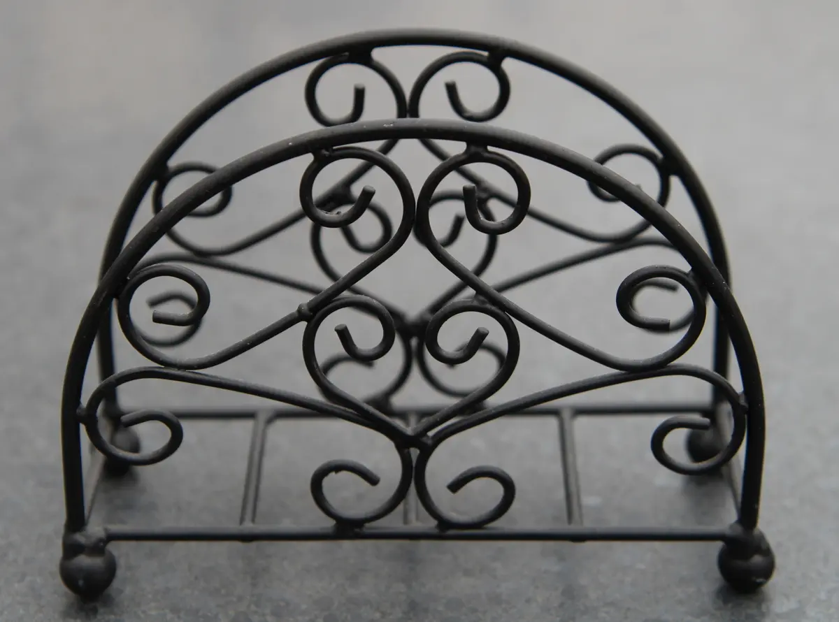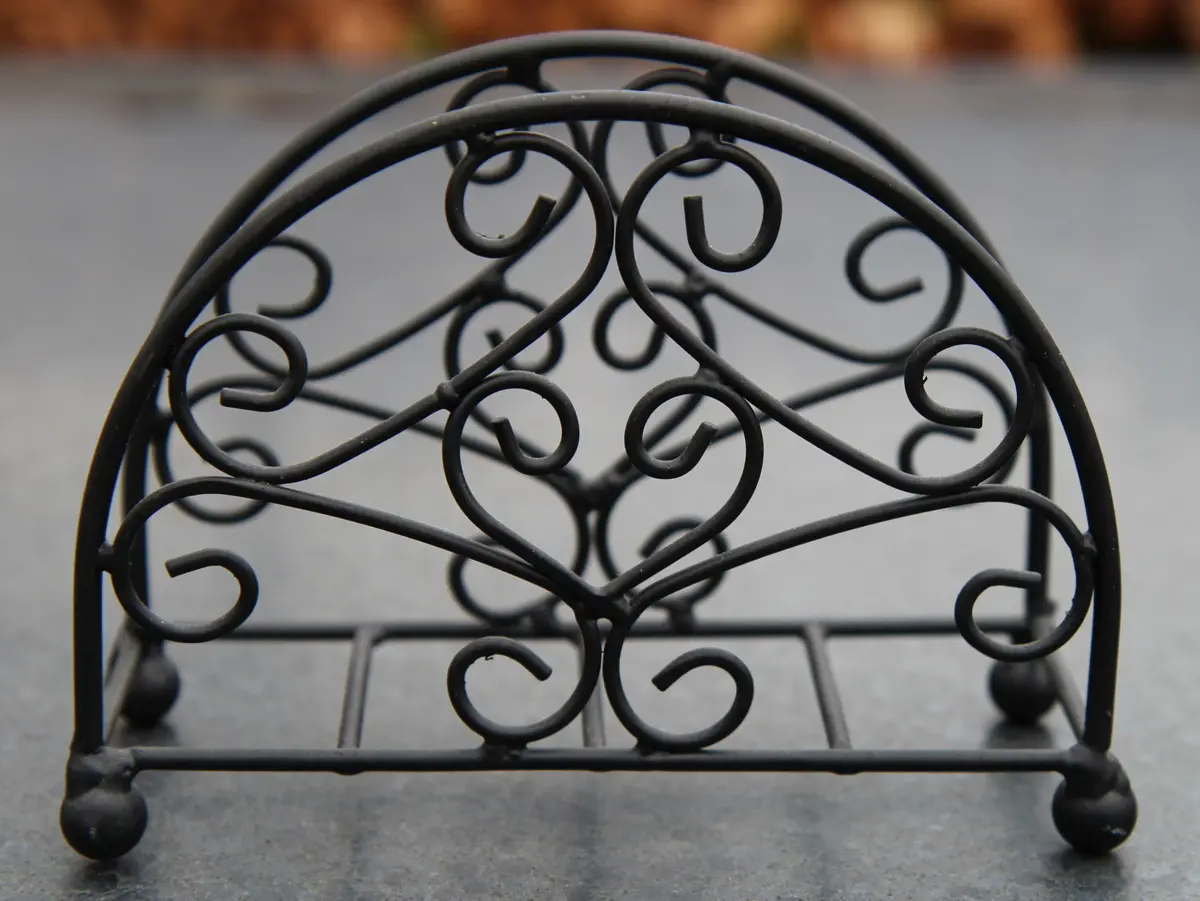 Een servethouder van zwart staaldraad.