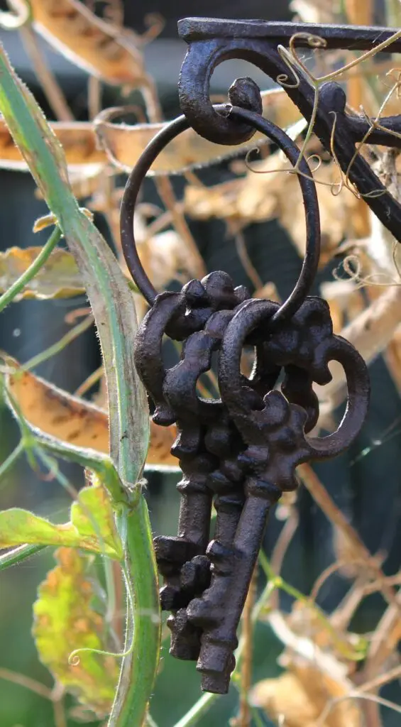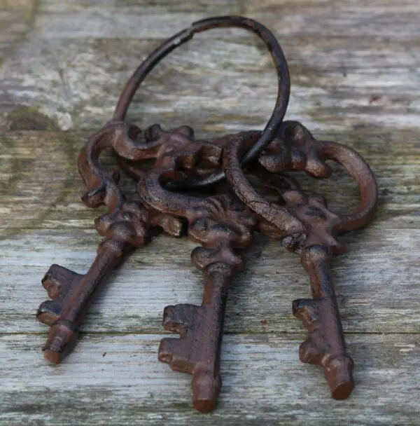 Antiek roestbruin gietijzeren sleutelbos met 3 sleutels aan een ring.