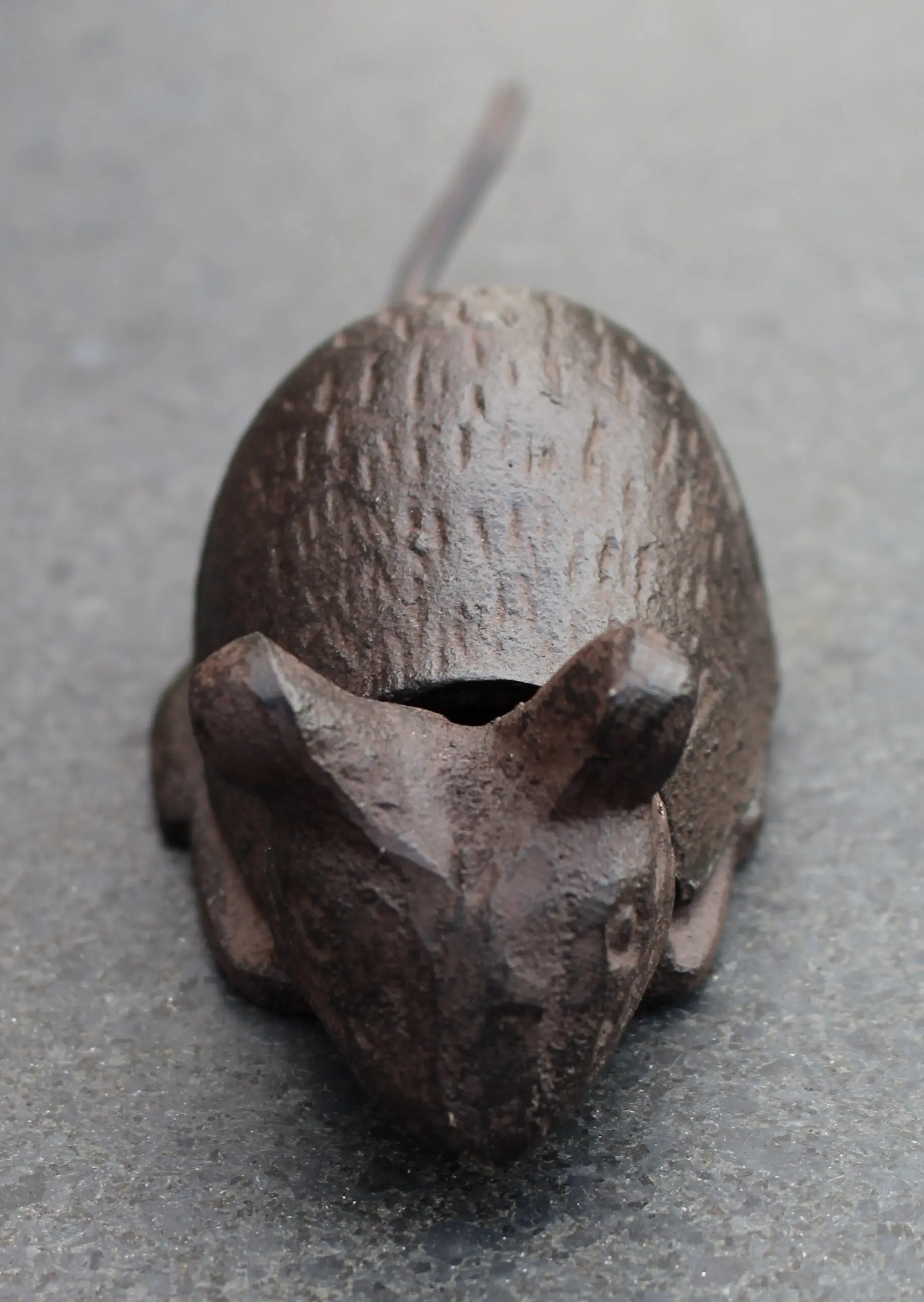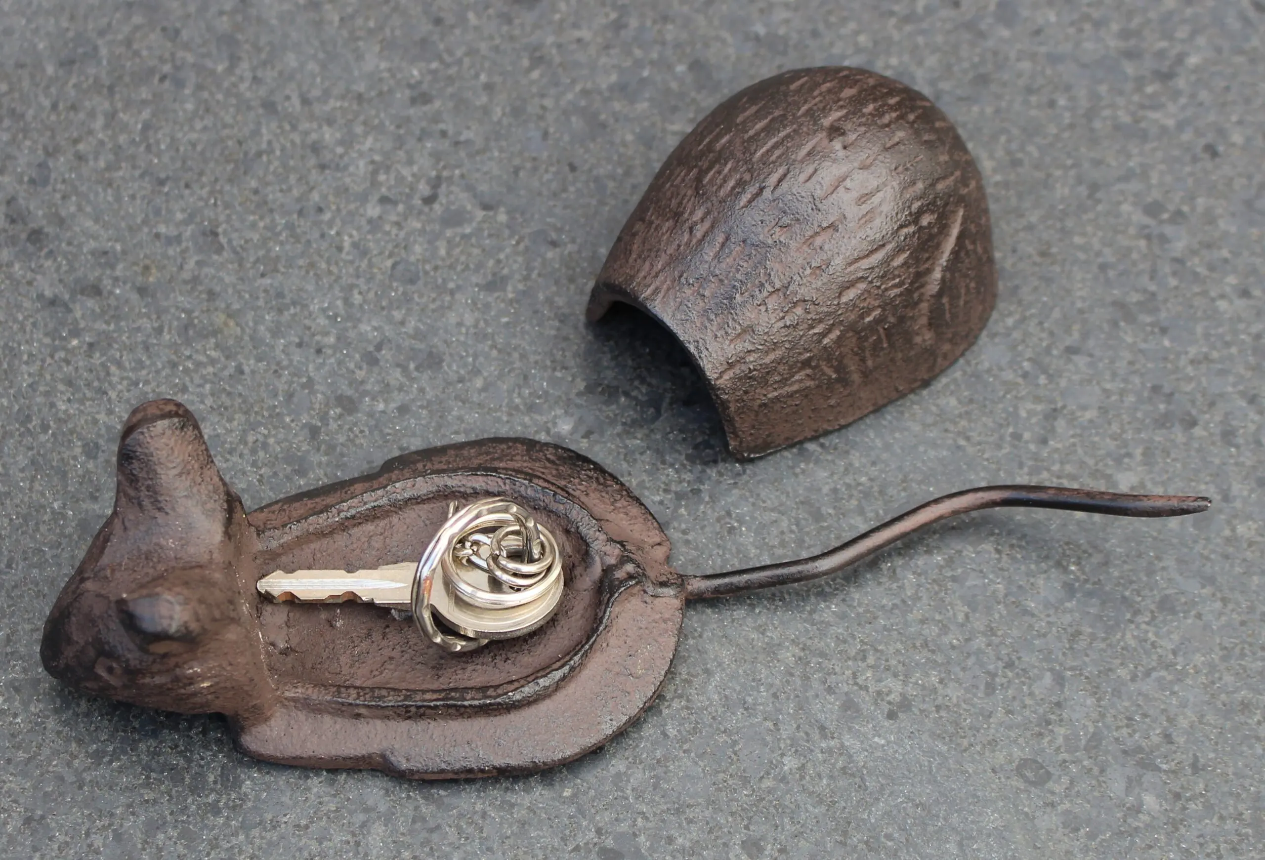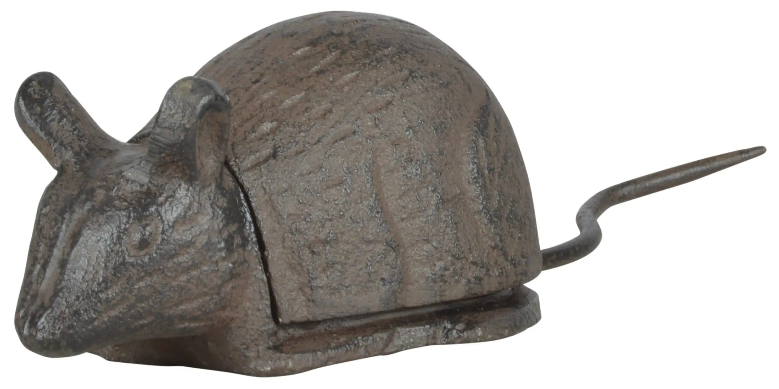 Een gietijzeren decoratieve sleutelverstopdoosje muis.