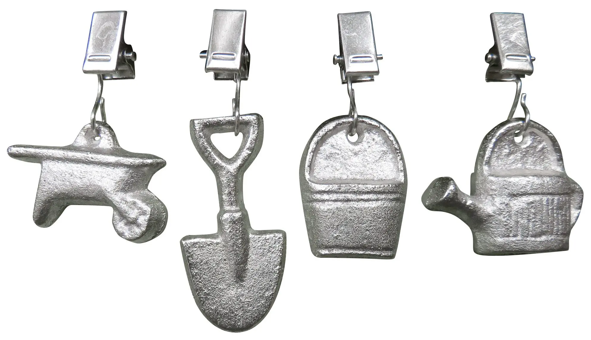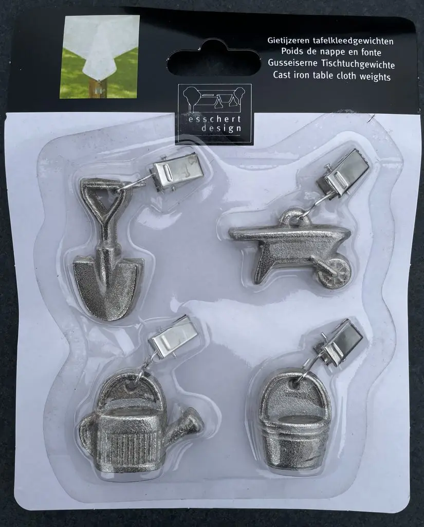 tafelkleedgewichtjes schep kruiwagen gieter emmer zilverkleurig