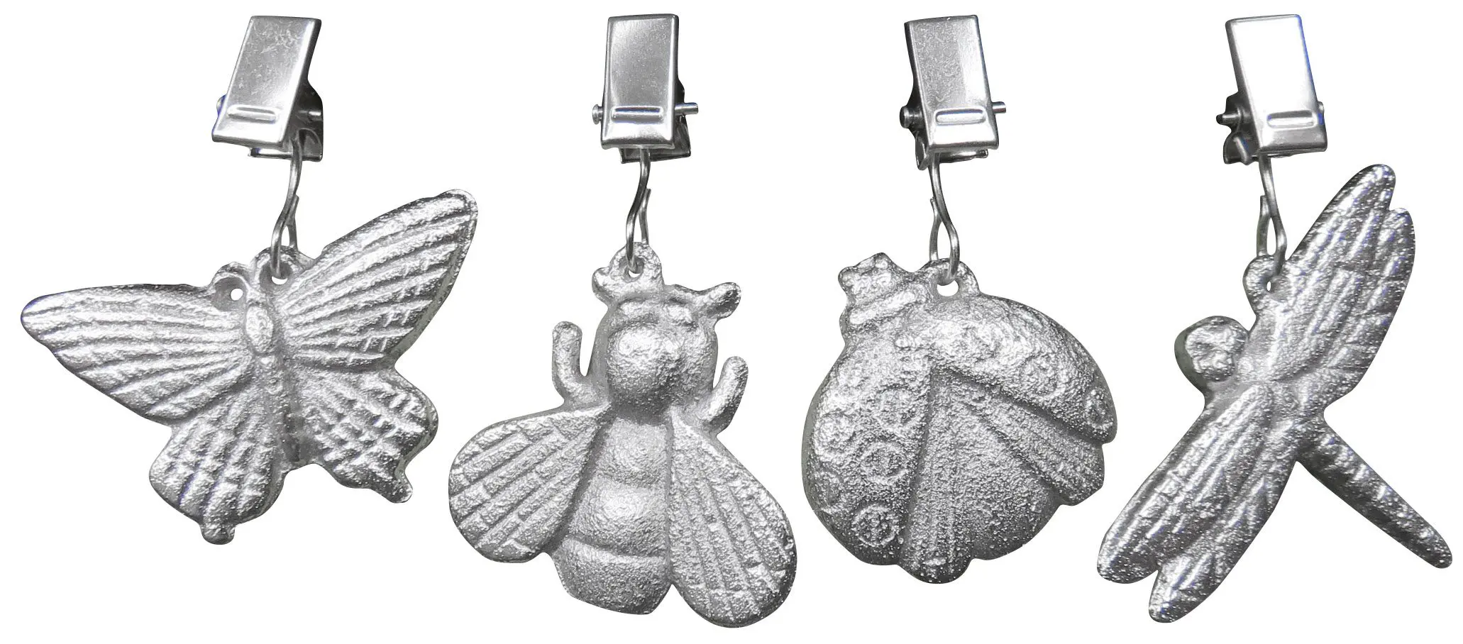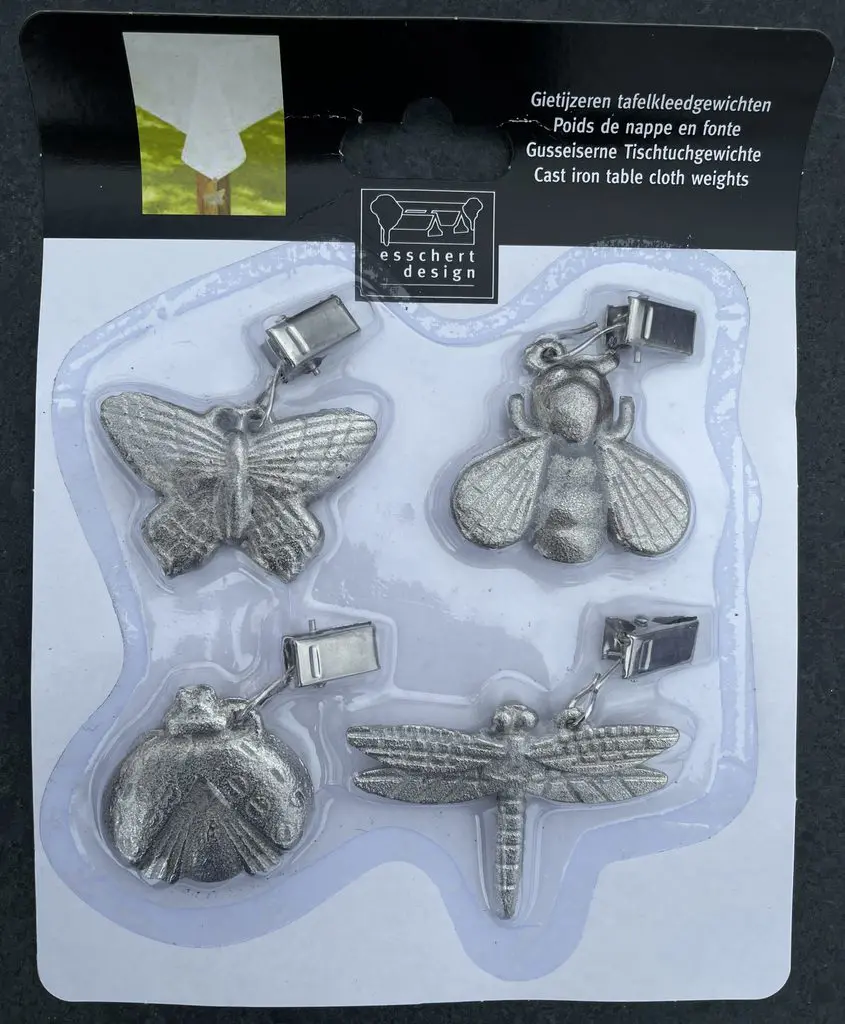 Leuke gietijzeren tafelkleedgewichtjes met afbeelding van een vlinder, libelle, lieveheersbeestje en een bij,