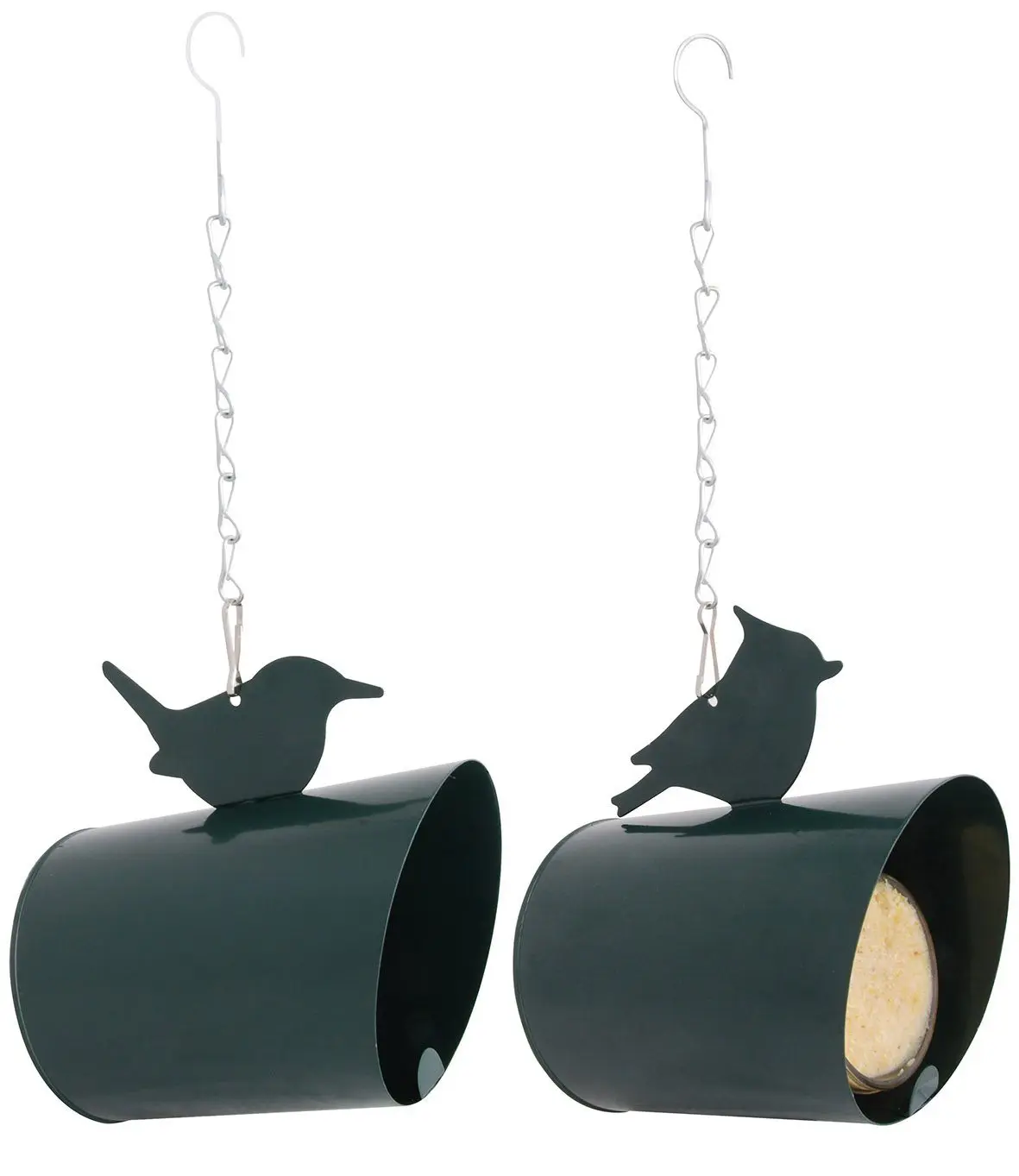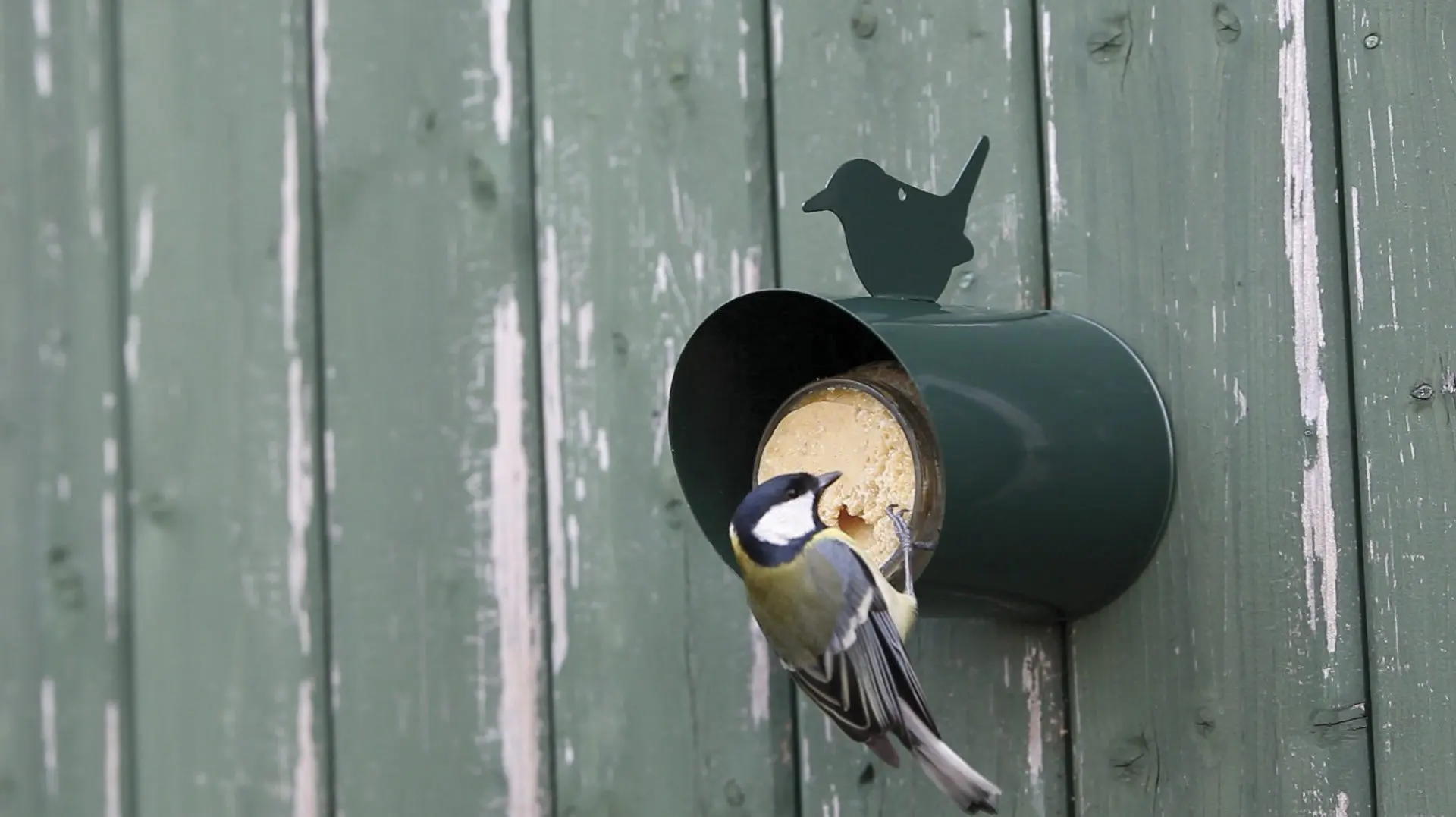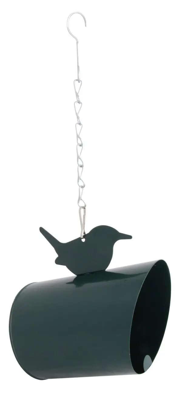 metalen pindakaaspothouder voor tuinvogels donkergroen met een vogeltje en staart omhoog
