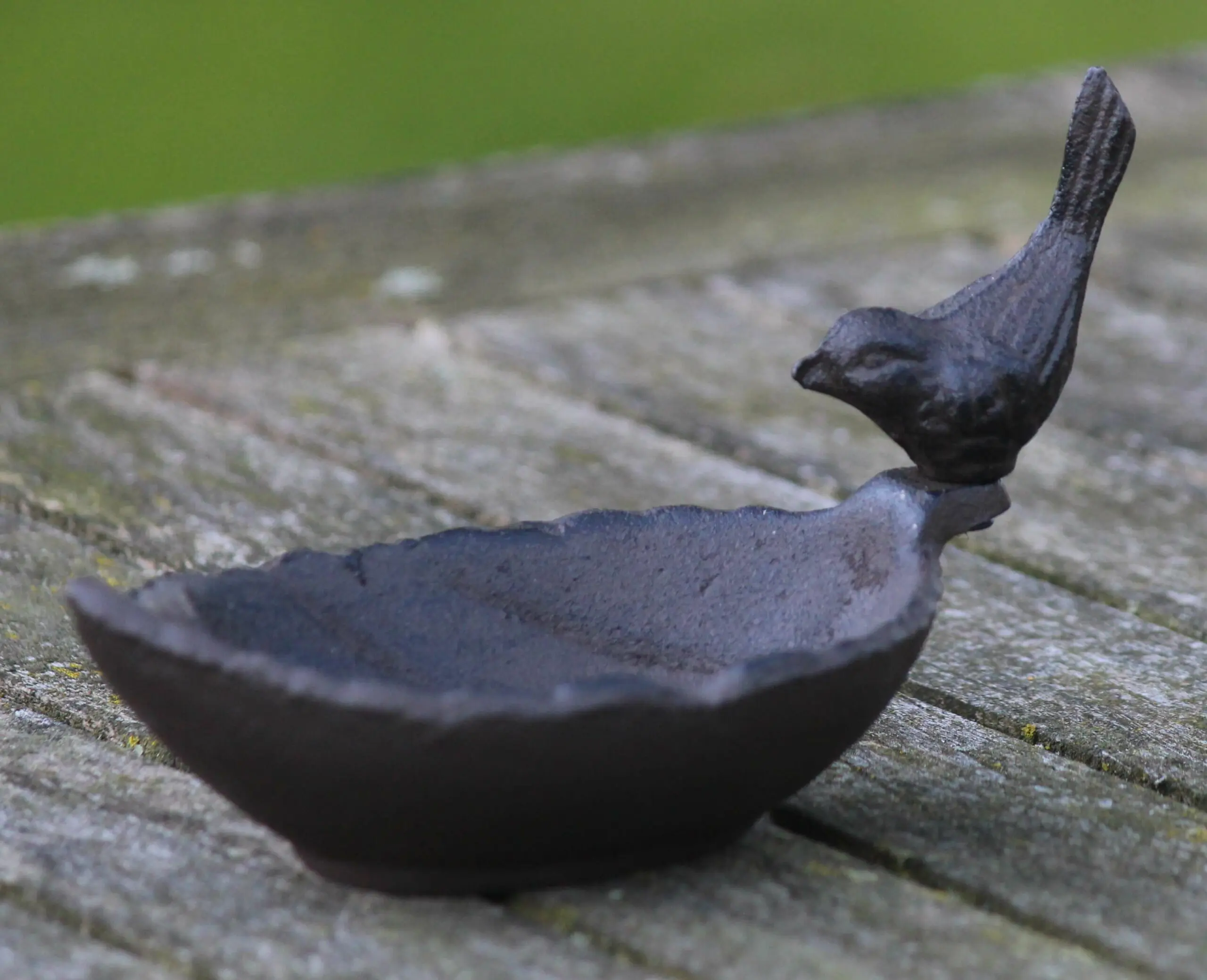 klein gietijzeren vogelschaaltje blad met vogeltje en vlakke bodem donkerbruin