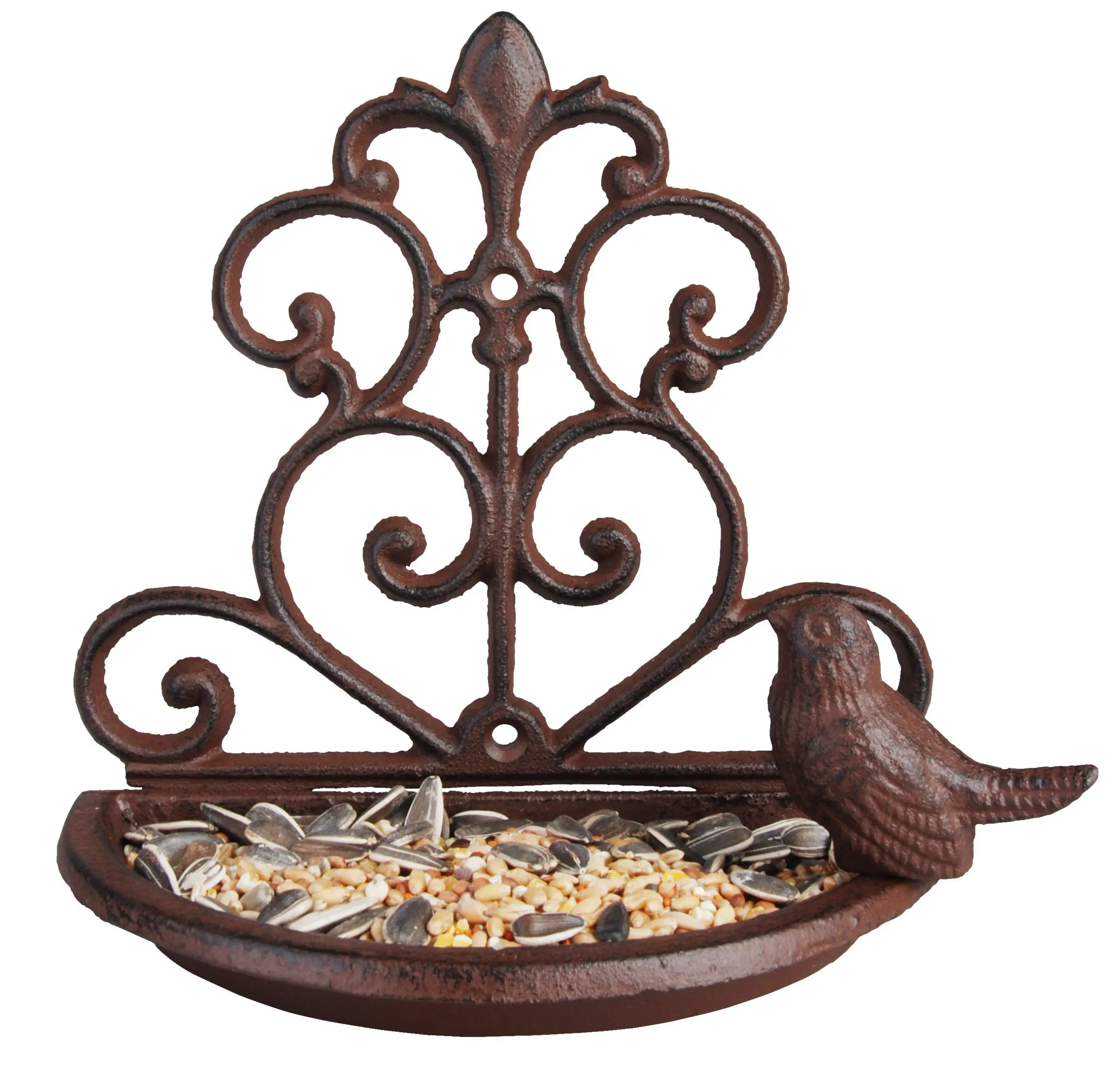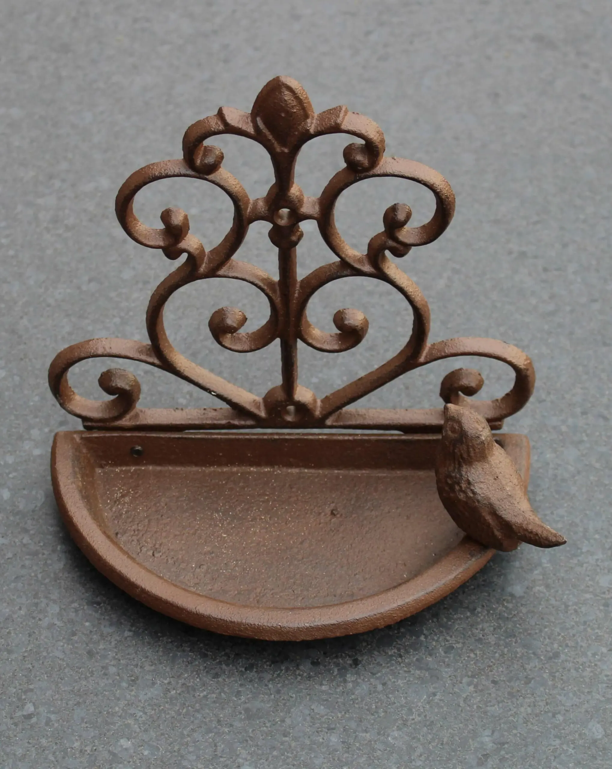 gietijzeren wandvoederschaal met vogeltje donkerbruin