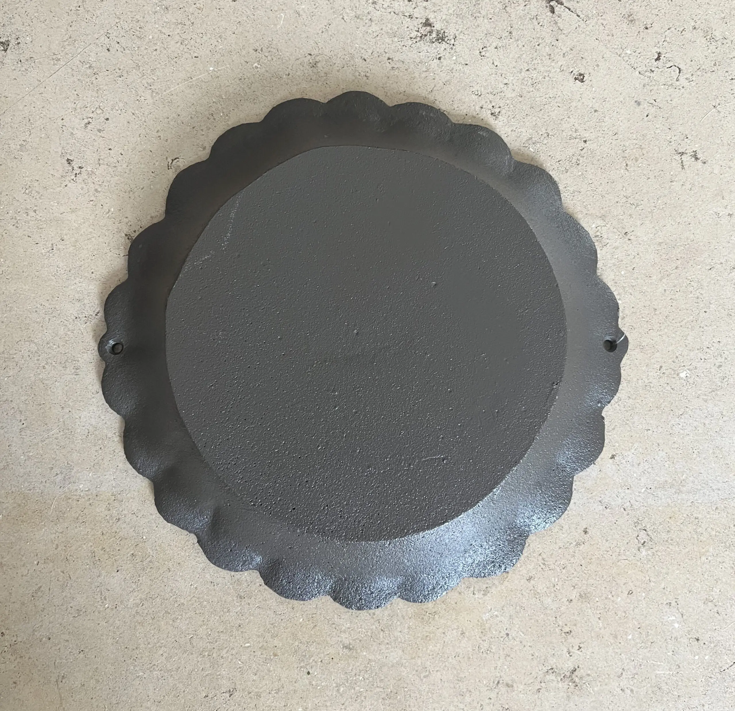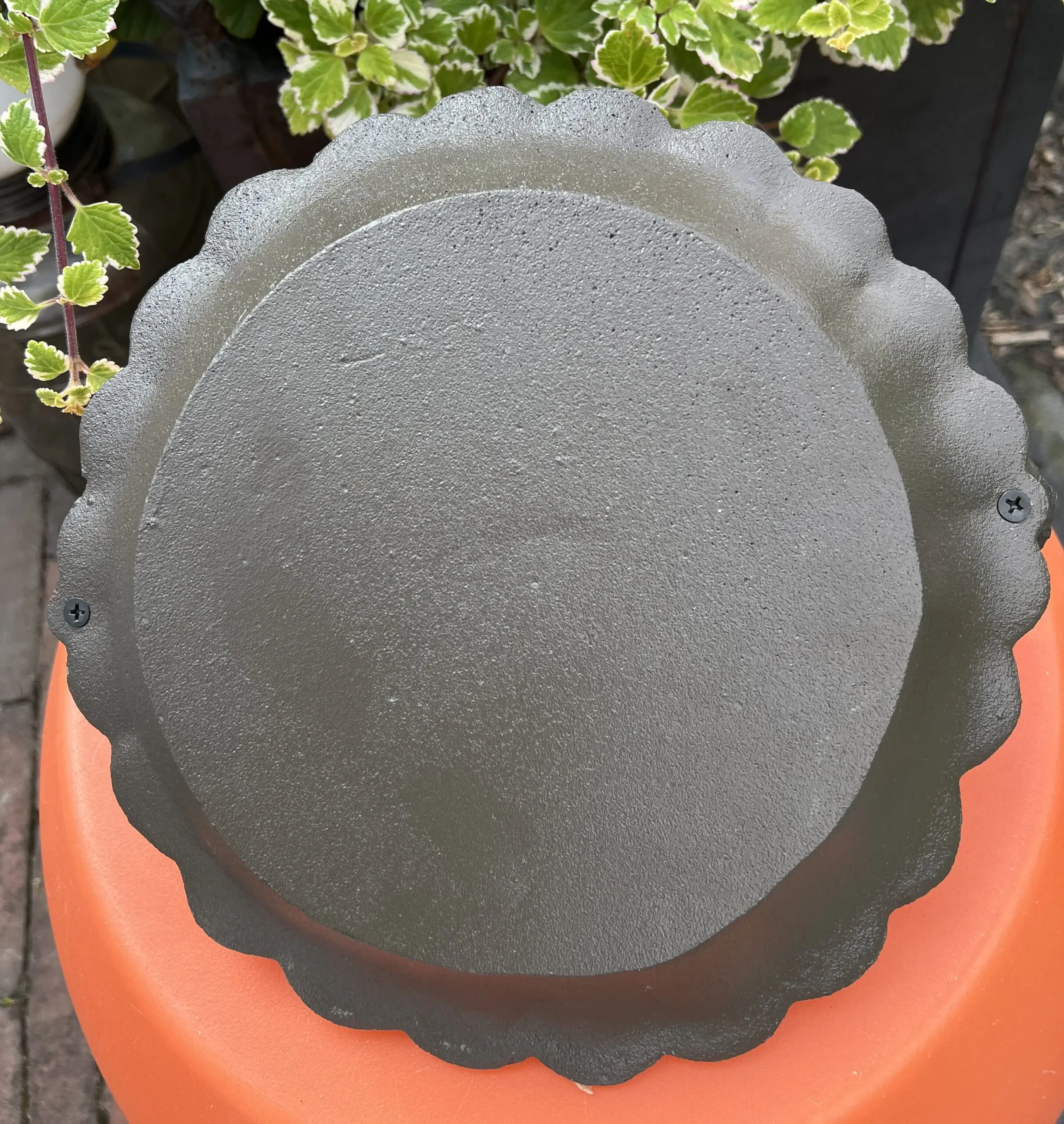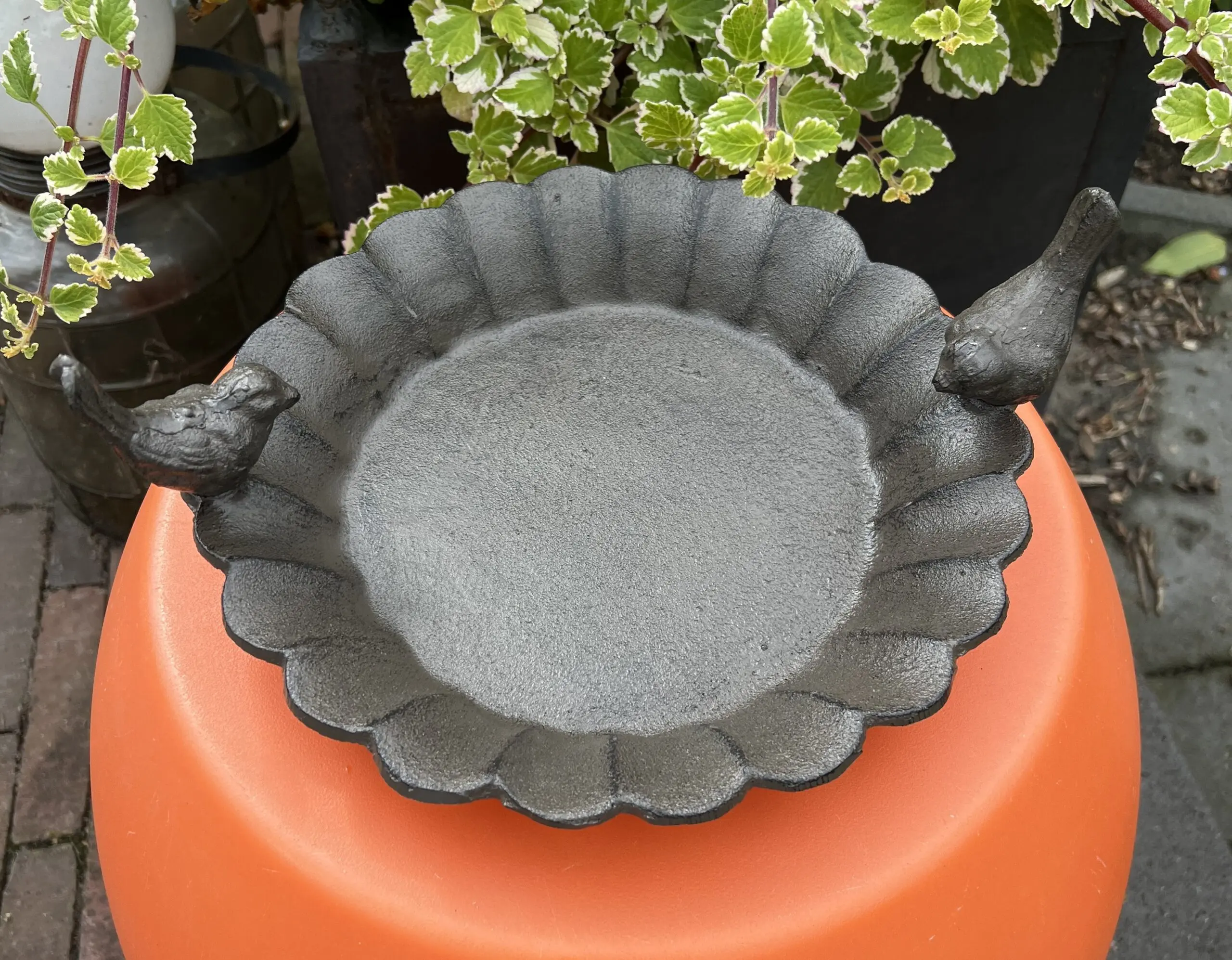 Een gietijzeren vogelschaal in de vorm van een bloem.