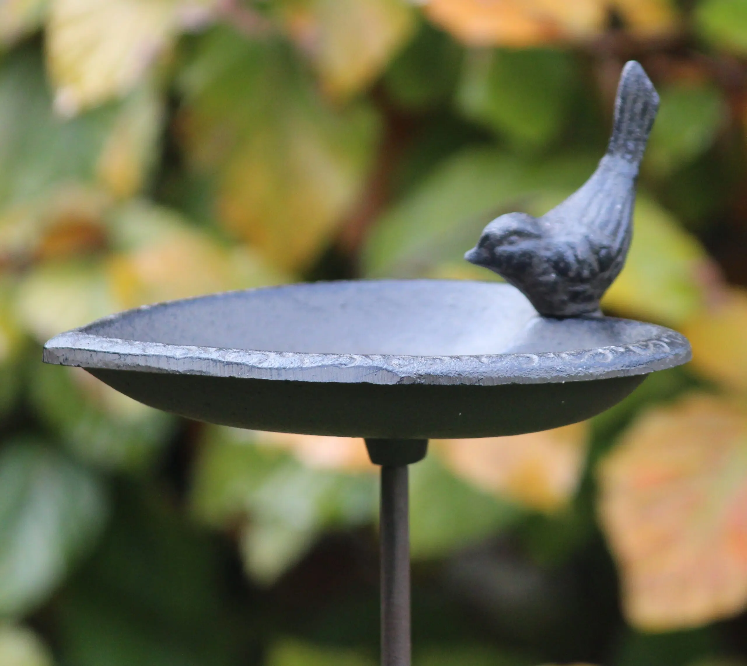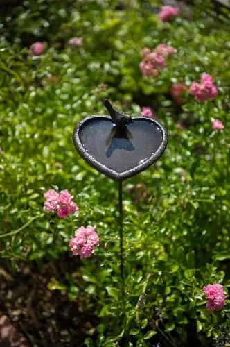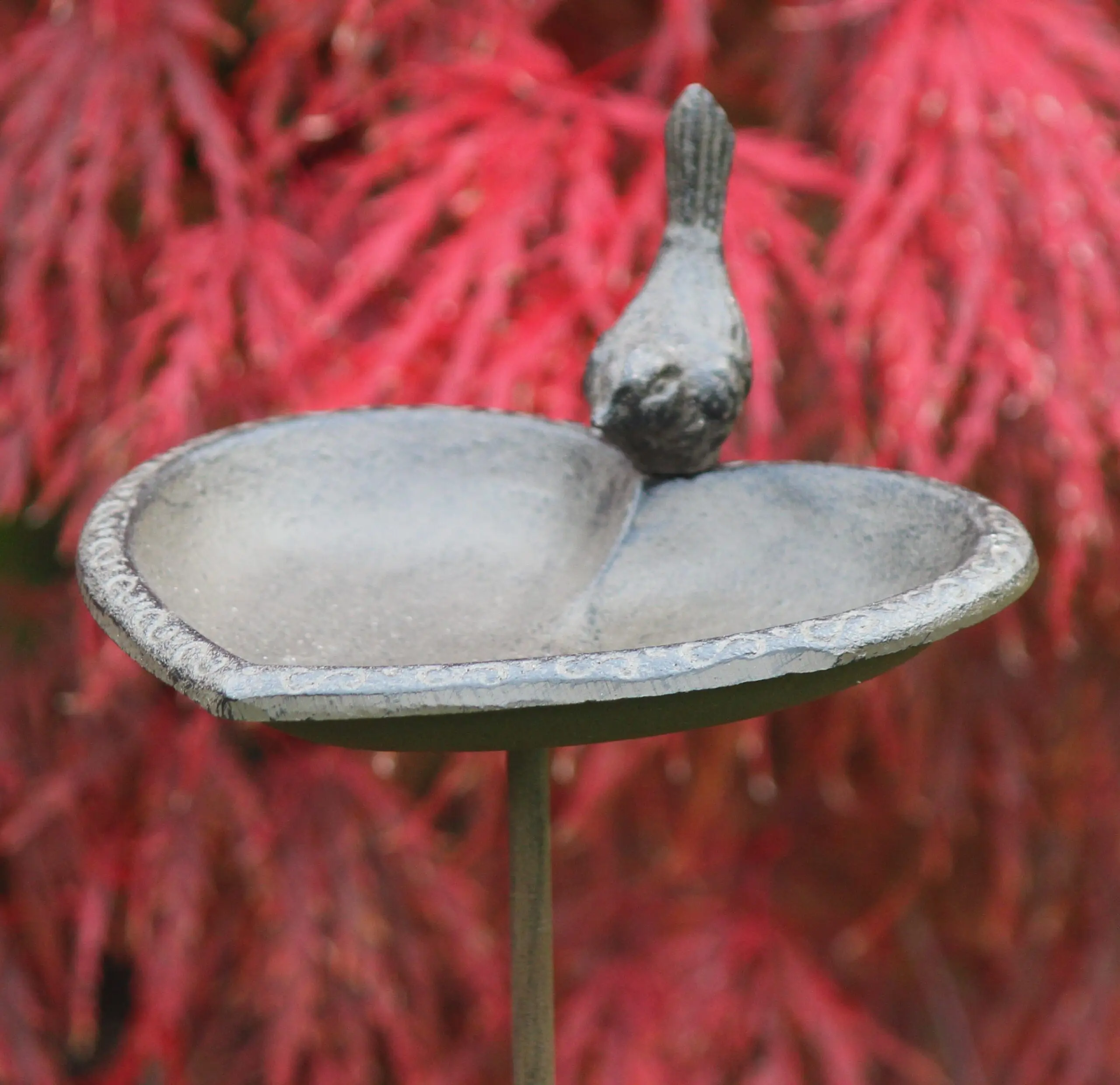 Een gietijzeren vogelschaaltje in de vorm van een hart.