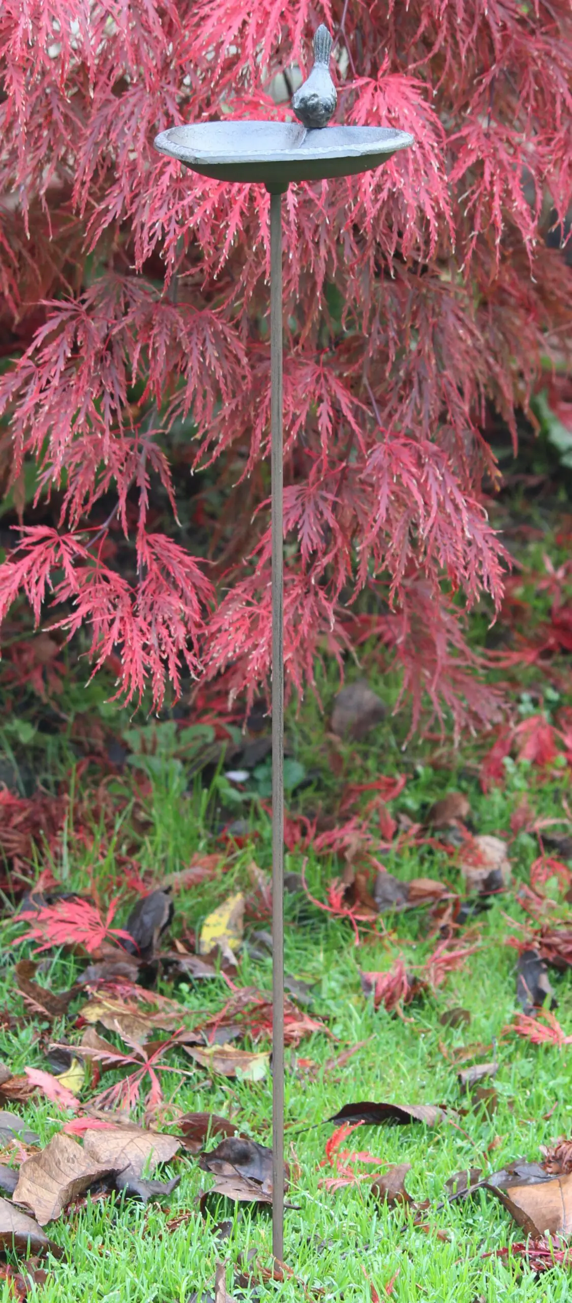 gietijzeren vogelschaaltje hart met vogeltje op metalen steker donkerbruin