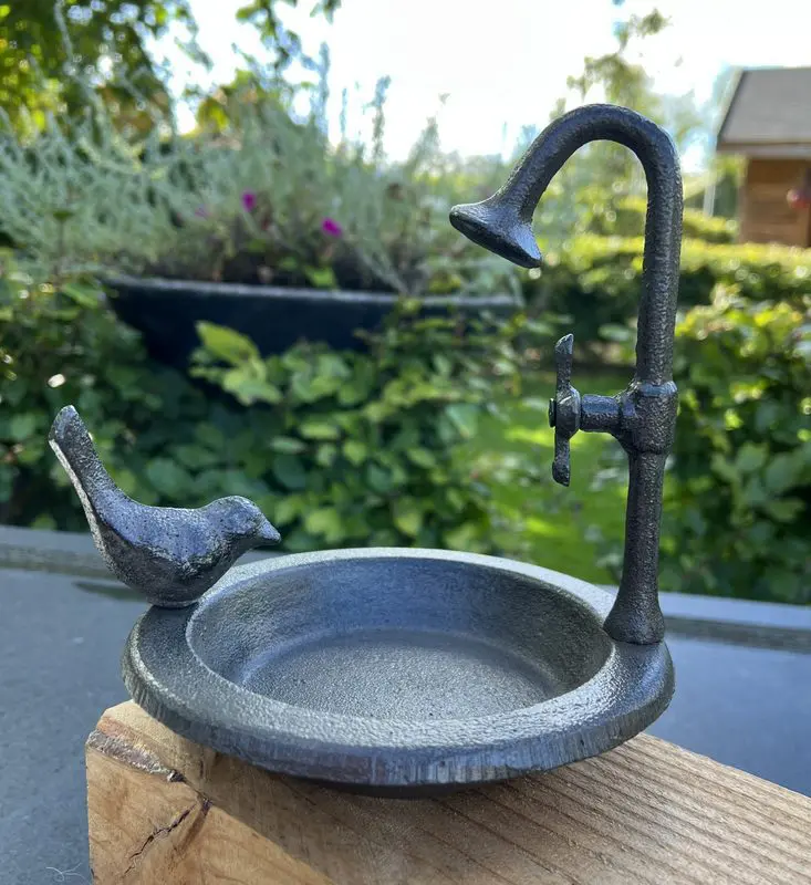 ronde gietijzeren vogelschaal met een decoratieve douche en kraan