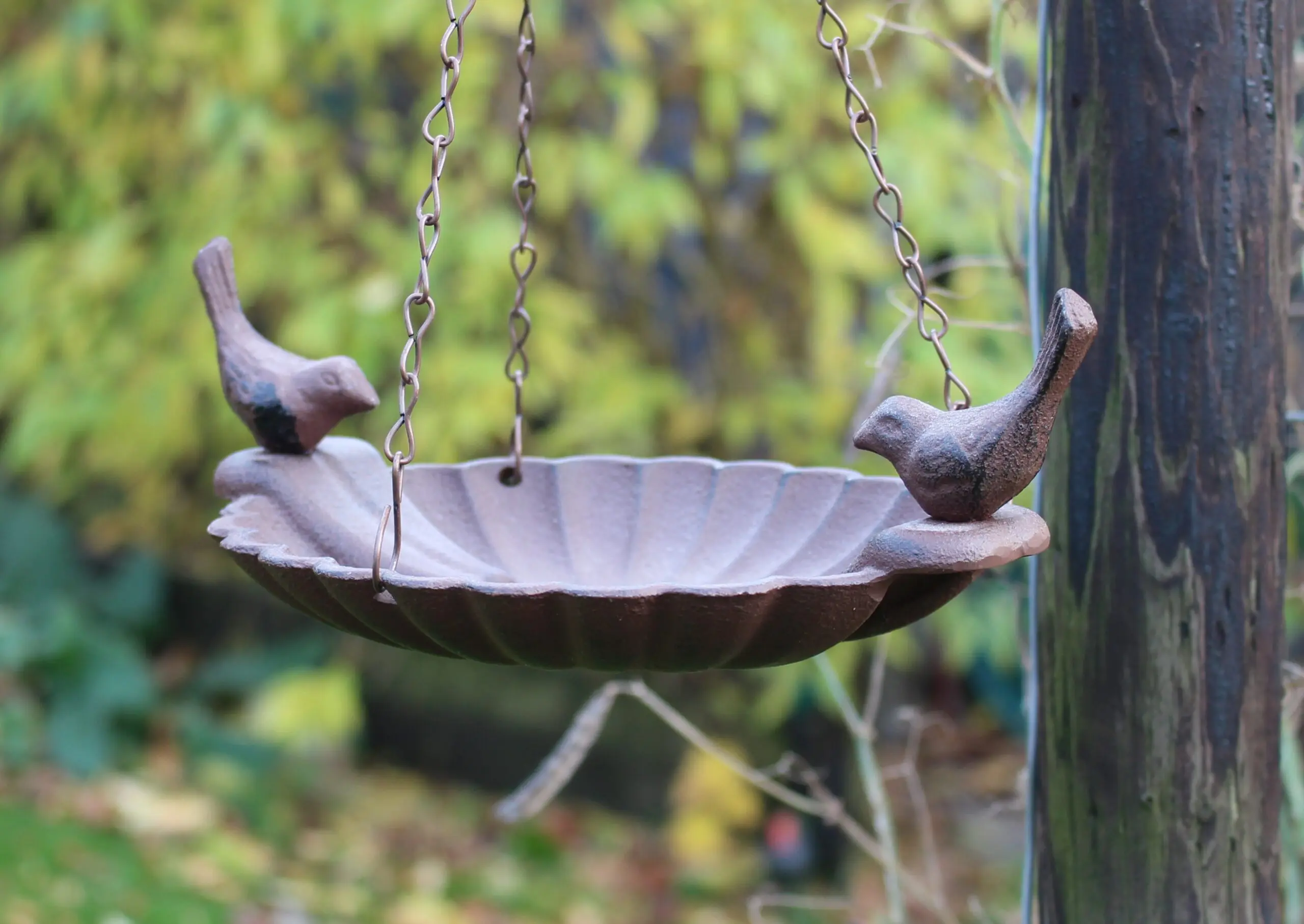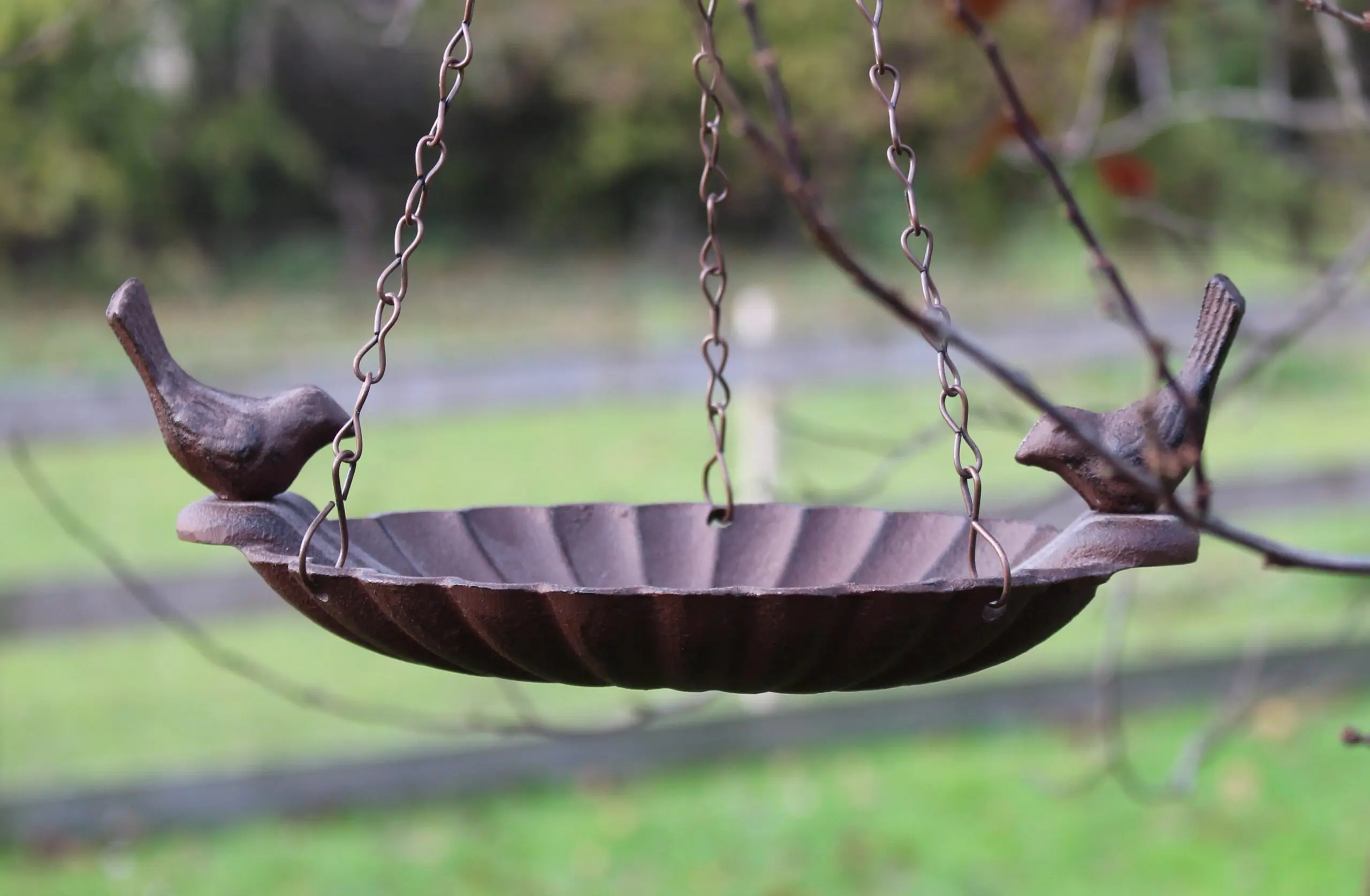 gietijzeren vogelschaalje aan een kettinkje met 2 vogeltjes donkerbruin