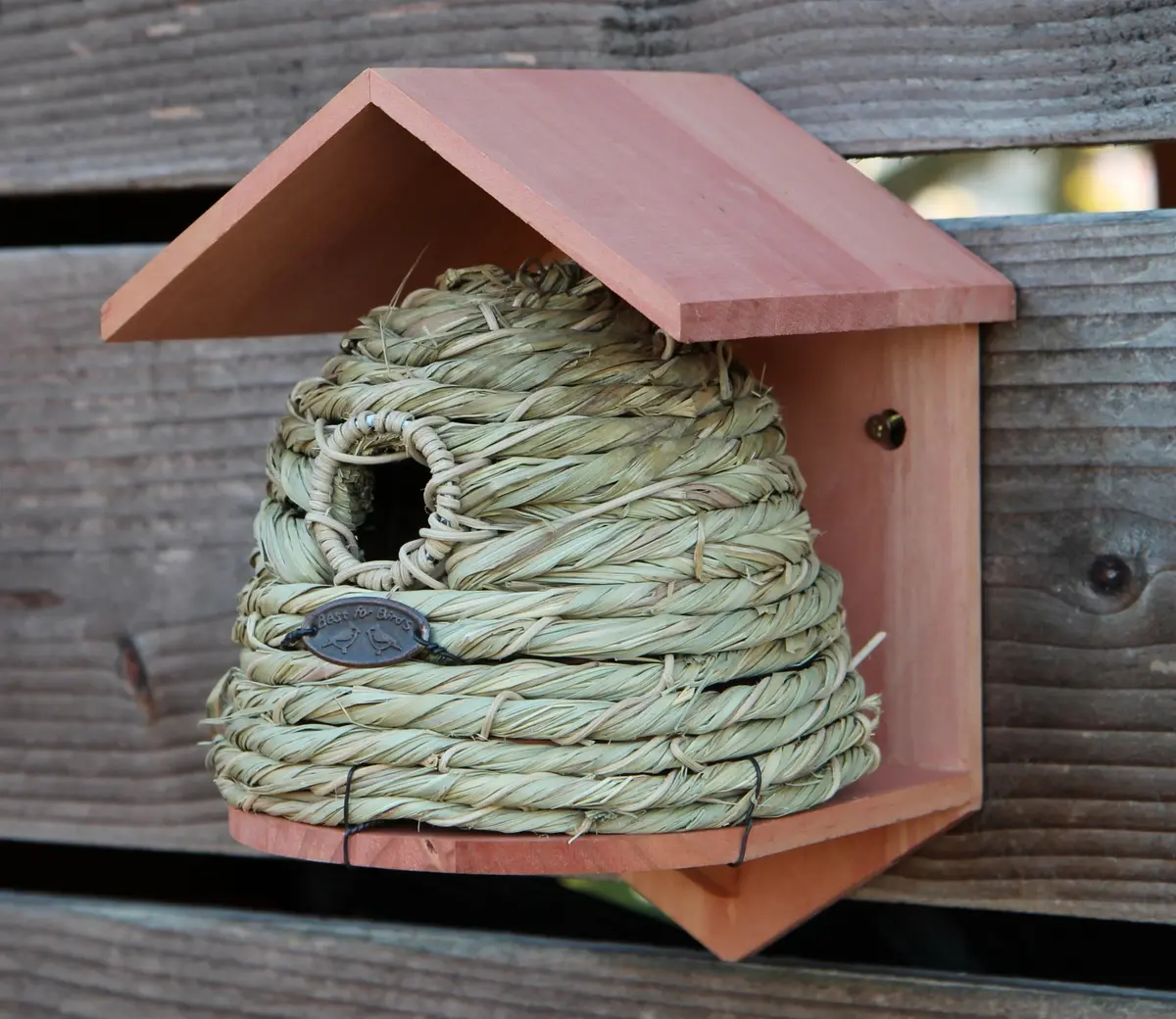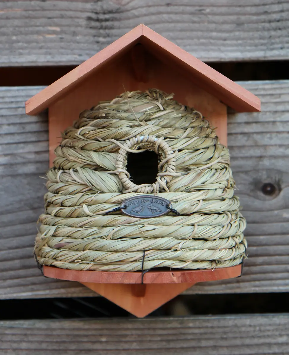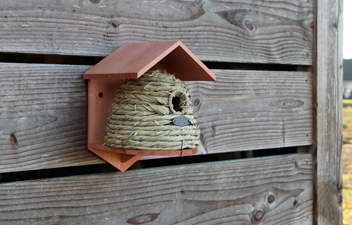 Houten met riet vogelhuisje “bijenhuis” voor diverse tuinvogels